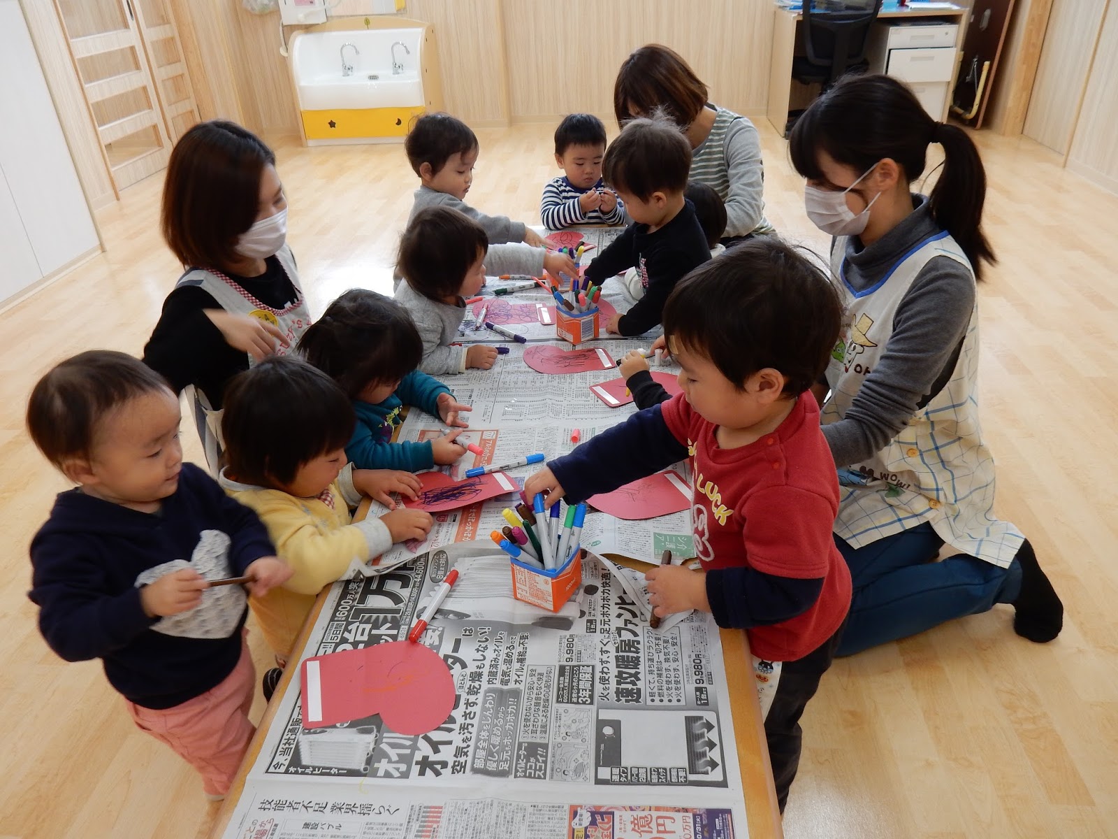 たんぽぽさんでは、トナカイの顔作りの続きをしていました。今日は、耳とつのを作ったみたいですね!はさみで切った角を一生懸命数えます。1,2,3,4,5,6!!6本ちゃんとあったかな??耳と角がついたトナカイさんの顔を見ながら満足げにしていました。