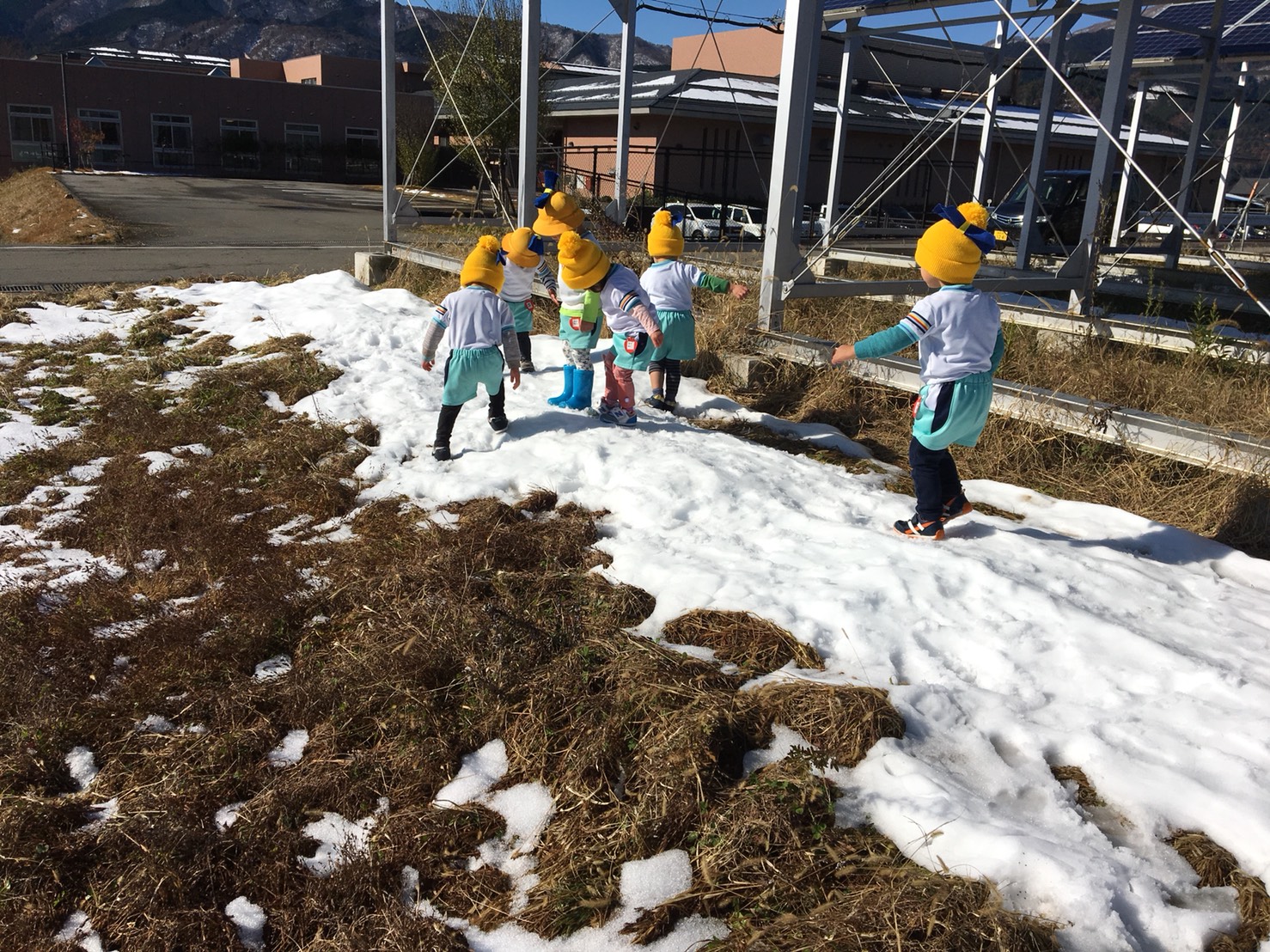 雪遊びが楽しいですよね♪少し固まった雪の上なら、長靴じゃなくても大丈夫!上を歩いたり、雪だるまを作ったり!