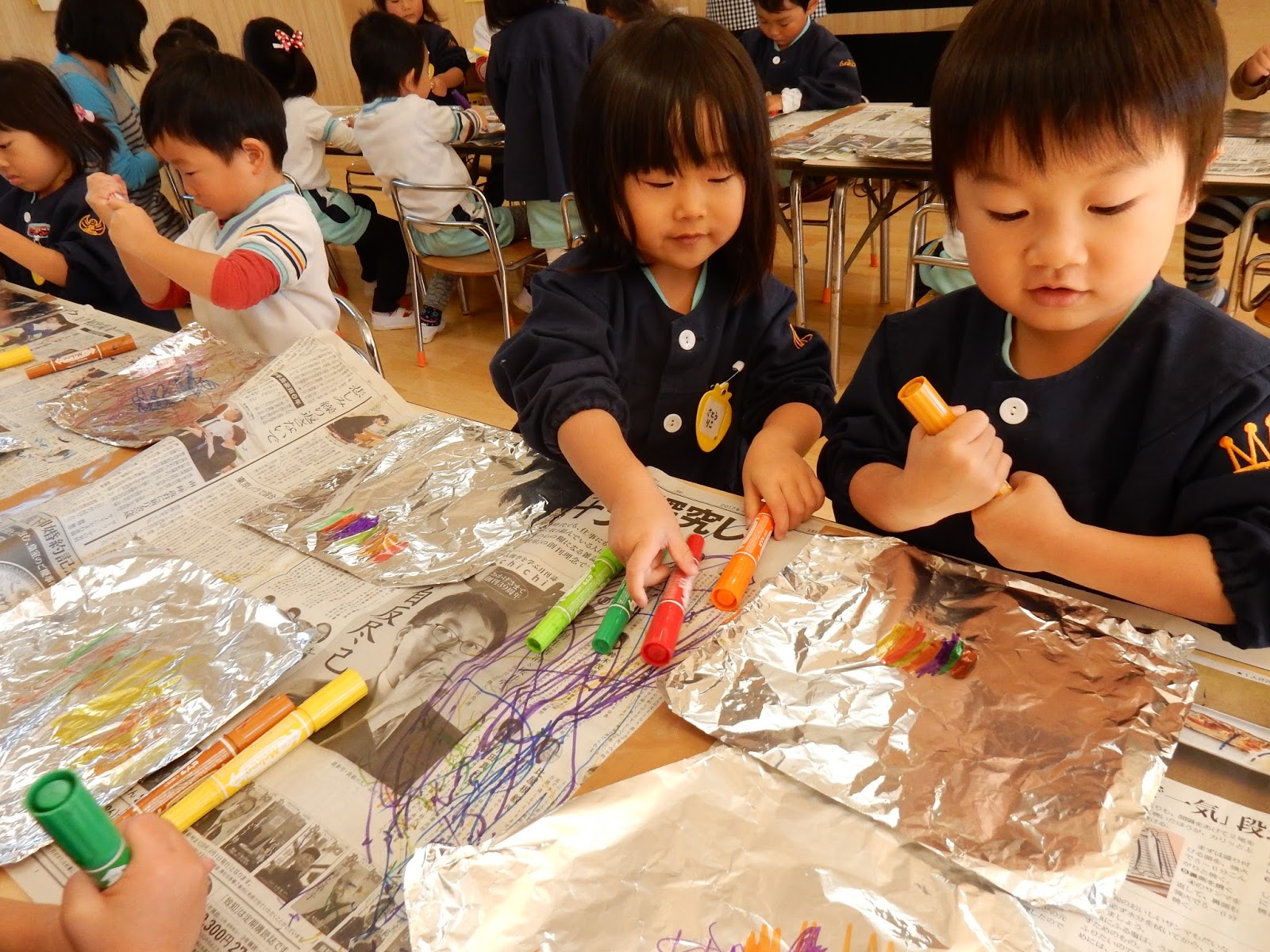 たんぽぽさんも楽しくお絵描き。いつもと違うのは、アルミホイルに描いてるんです!キラキラのアルミホイルの上に、マジックを使ってお絵描き。グルグル描いたり、端からきれいに塗ったり。1人1人違うんです。面白いですよね!