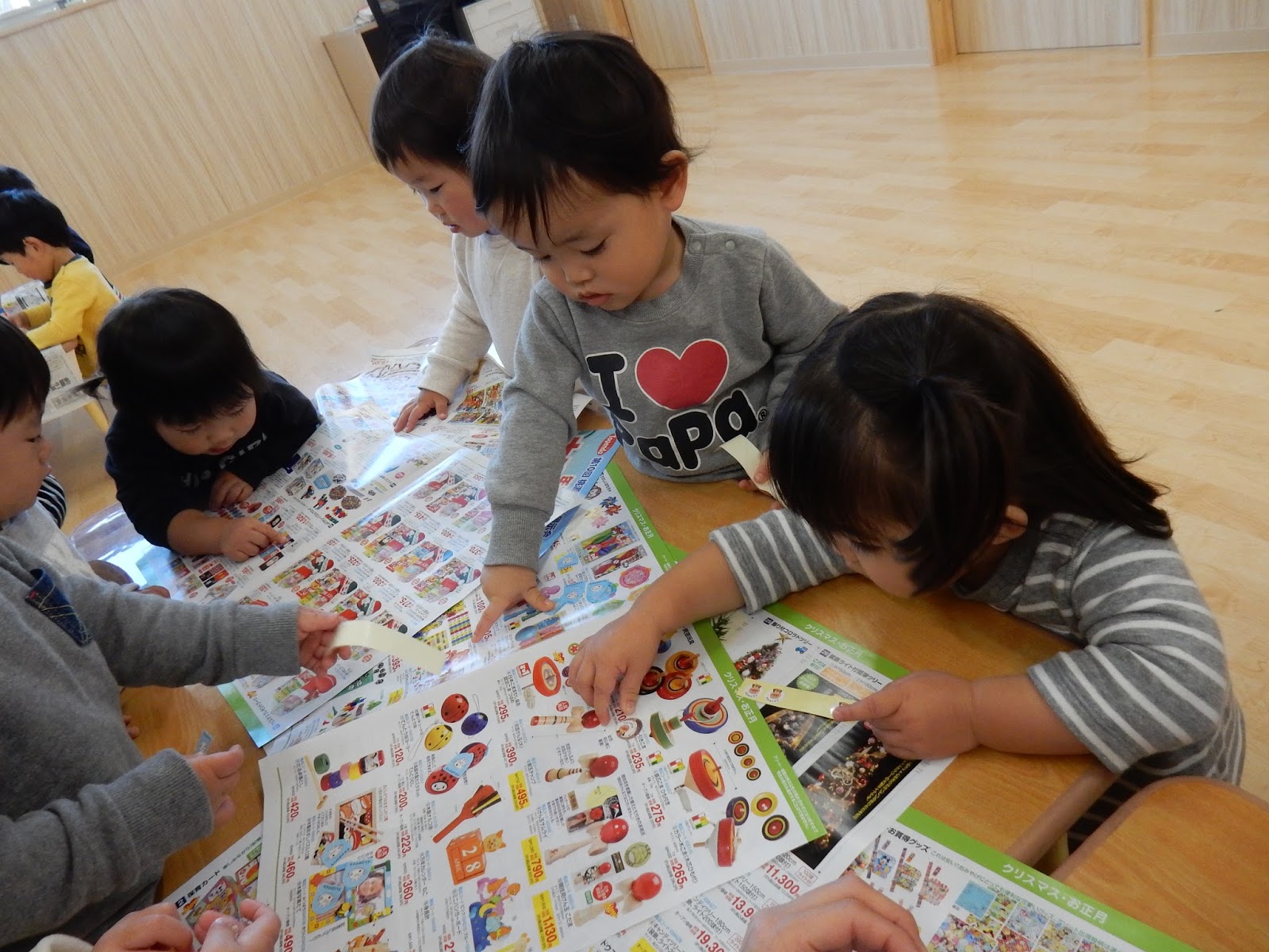 クリスマス製作中のひよこさん。合間にシール遊び。カタログをたくさん先生が出してくれましたよ!『あんぱんまん!!』と、みんな夢中で知っているキャラクターを探していました!