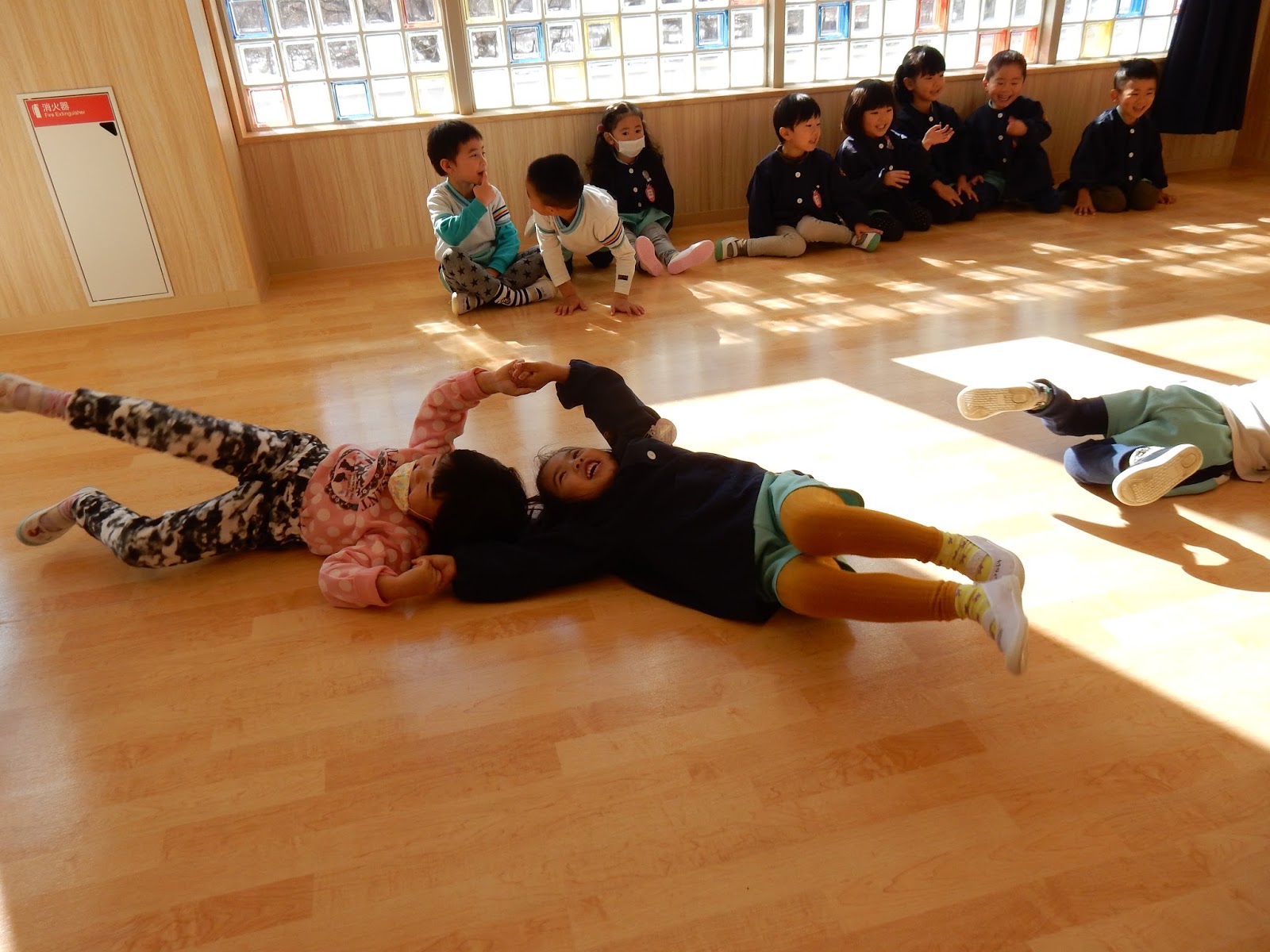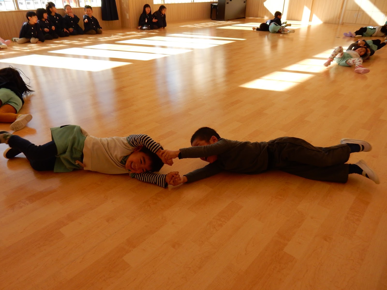 その後ホールで体を動かしていたゆりさん。よーいどん!!で2人で手をつないだままゴロゴロ…お芋になって転がります!これがなかなか大変!息を合わせないと真っ直ぐ進めません!後ろからはお腹を空かせた愛先生が、おいしそうに転がるお芋を狙っています!(笑)楽しく全身運動!