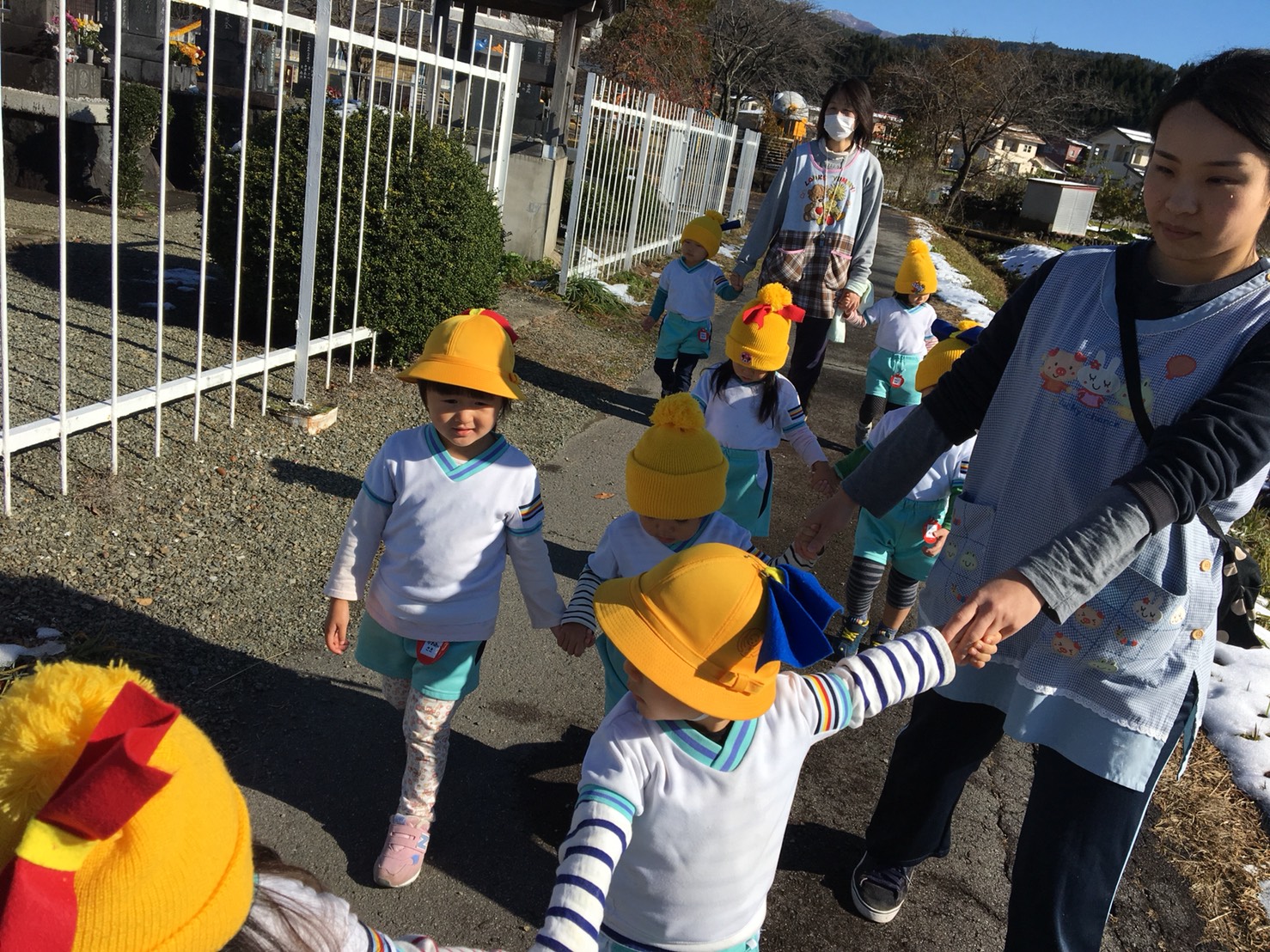 体操マラソンをするために、隣の駐車場へ行ってきました。雪が降ったら、やっぱりこれ!雪合戦!まだ少ししか積もっていないですが、雪合戦ならこの両でも十分!固まっている雪をつかんでは投げ、追いかけては投げ…お友達相手だとちょっと優しい子ども達ですが、相手が先生だと本気!?(笑)年長さんは走るのも速いので、逃げるのも一苦労。きゃーきゃー言いながら子ども達と一緒に楽しみました!冷たい雪に、手は真っ赤になりましたが、体はぽかぽか暖かかったです♪