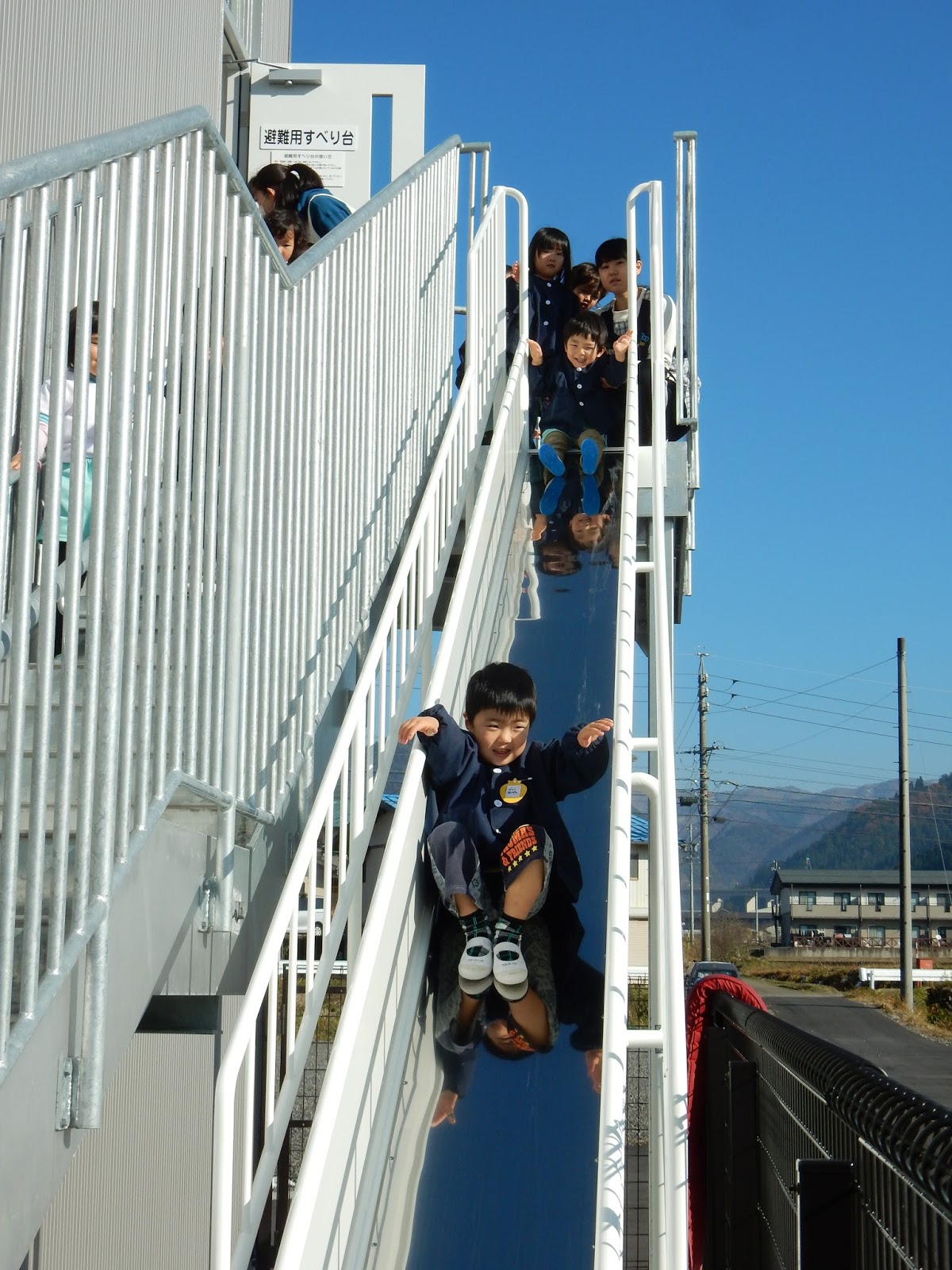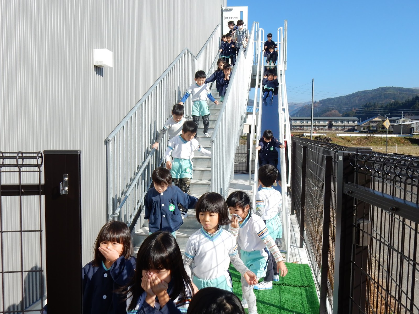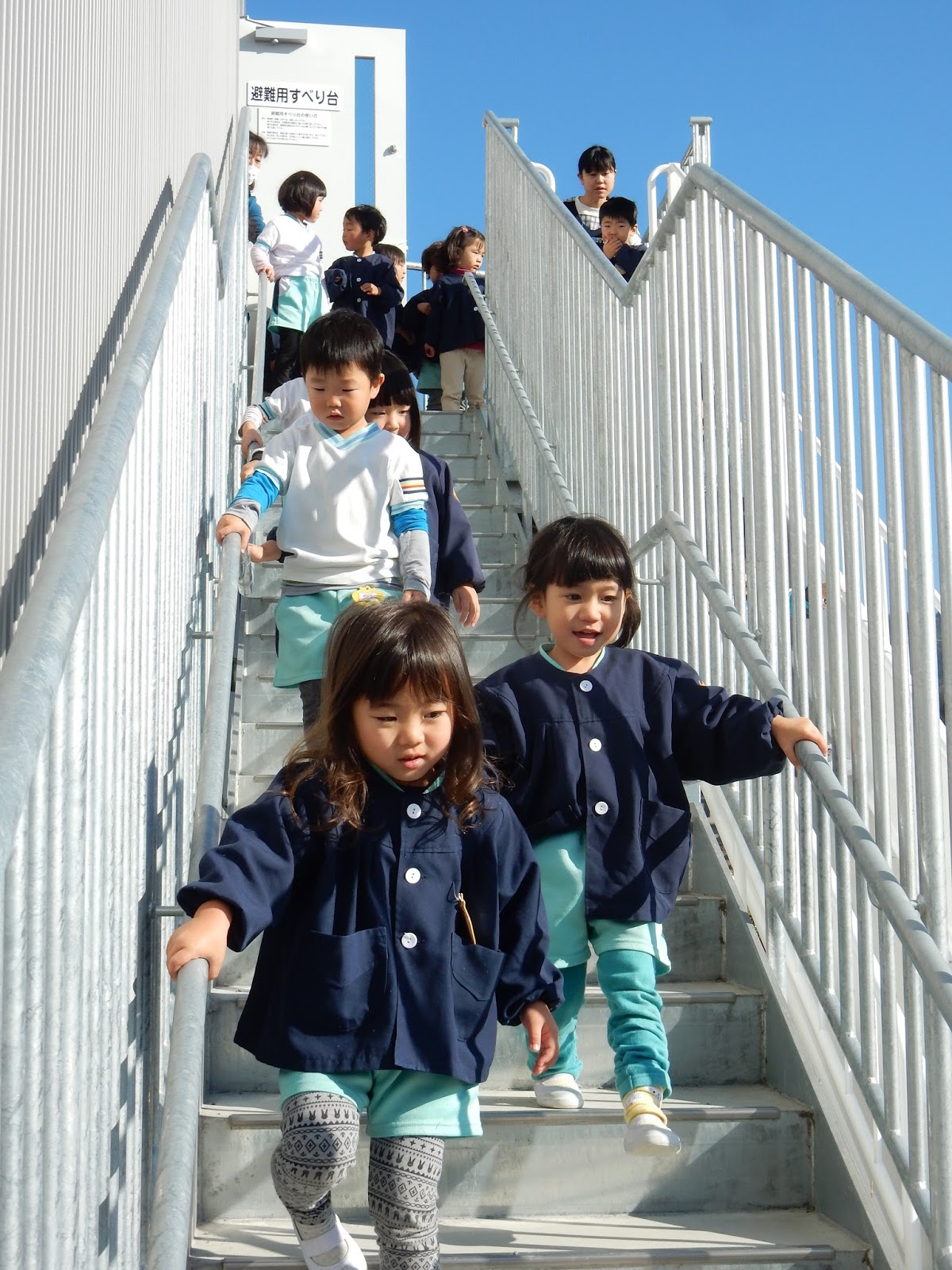 揺れがおさまると、今度は園舎の外に避難します。小さいお友達は、靴を履いたり、先生に抱っこしてもらって。2階のお友達は、階段とすべり台を使ってスムーズに避難することができました!今日は火災の想定ではありませんでしたが、前回の訓練をよく覚えていたお友達の中には、手やハンカチで煙を吸わないように口を押えている子もいましたよ!ちょっぴり怖いけど、こうした訓練の積み重ねで、子どもたち自身にも安全の意識が身について行きますね!