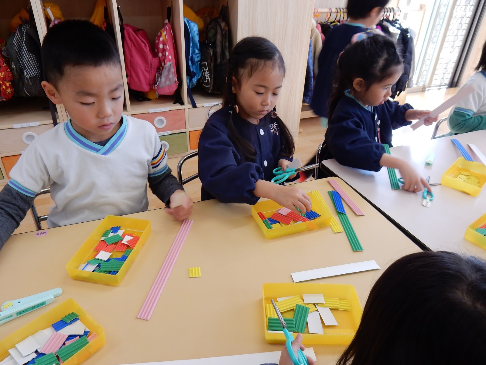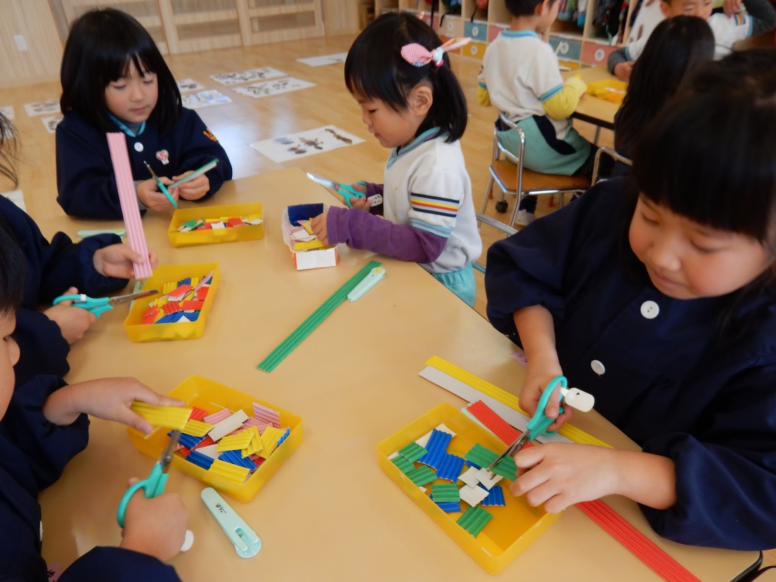 ゆりさんは...ブロック?と思ったら、カラフルなダンボールを細かく切っていました!少し硬そうでしたが、力を入れて!切るたびに、ぱちん!ぱちん!と紙を切るのとは違った音がするのが面白かったみたい!