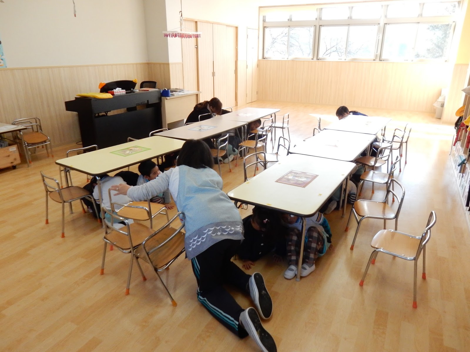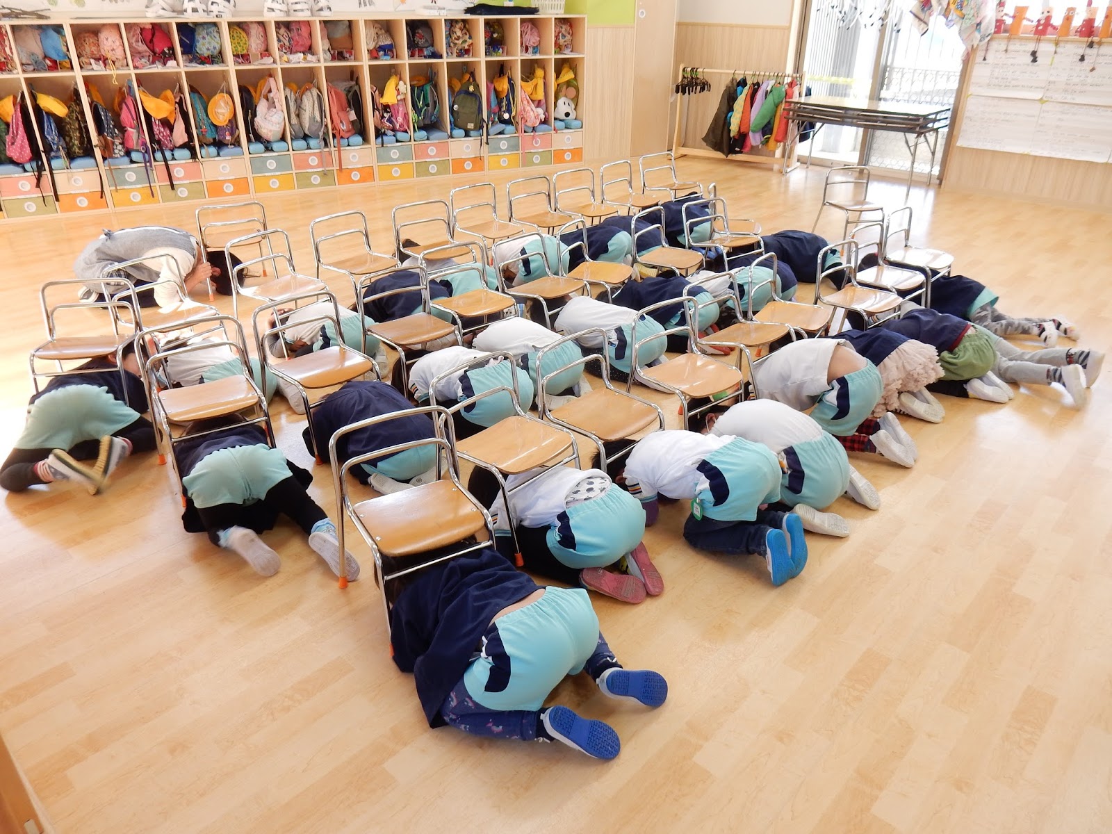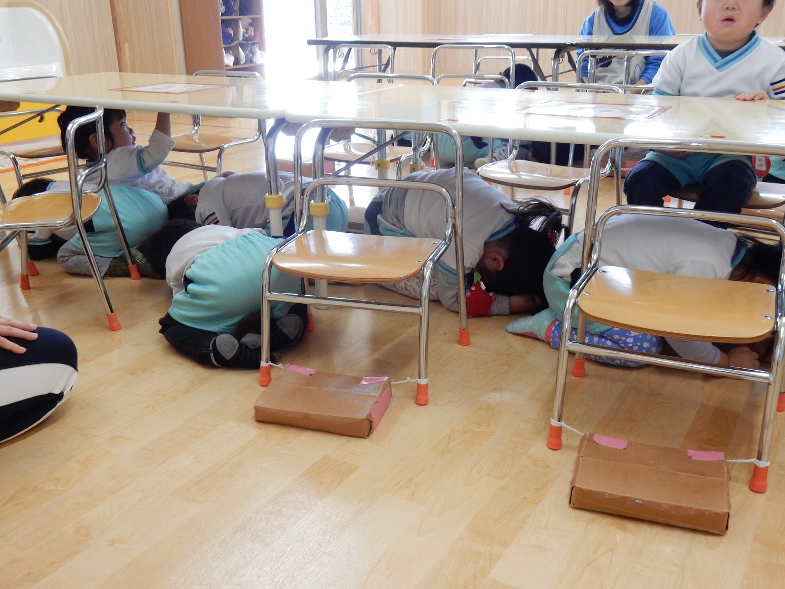 お話を聞いていると、どんどんどん!!!!!と大きな音が聞こえてきました!『頭を守るよ!』という先生の声に、机や椅子の下に隠れて頭を守ります。この時も、お友達と場所を譲り合って。みんなでダンゴ虫のポーズです。