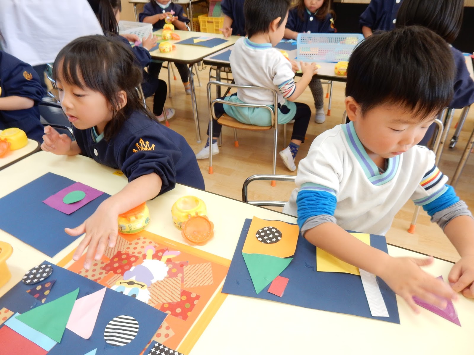 紺色の画用紙に、カラフルな折り紙を貼りながらお家をつくっているたんぽぽさん。今回のみんなの作品には、煙突が♡サンタさんが来てくれるように♡♡