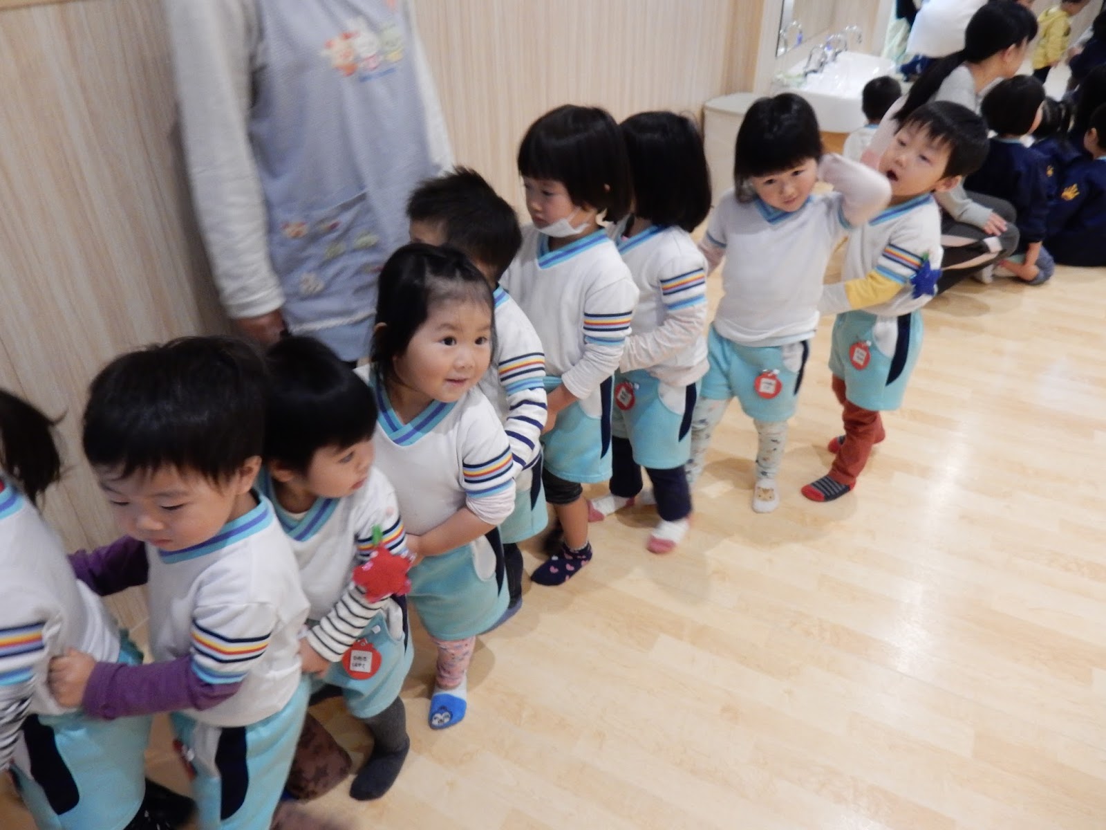 ホールからの帰り道、今日もしっかりつながったすみれさん列車♡まえのお友達の体操服をぎゅっとつかんでお部屋まで帰りました♪