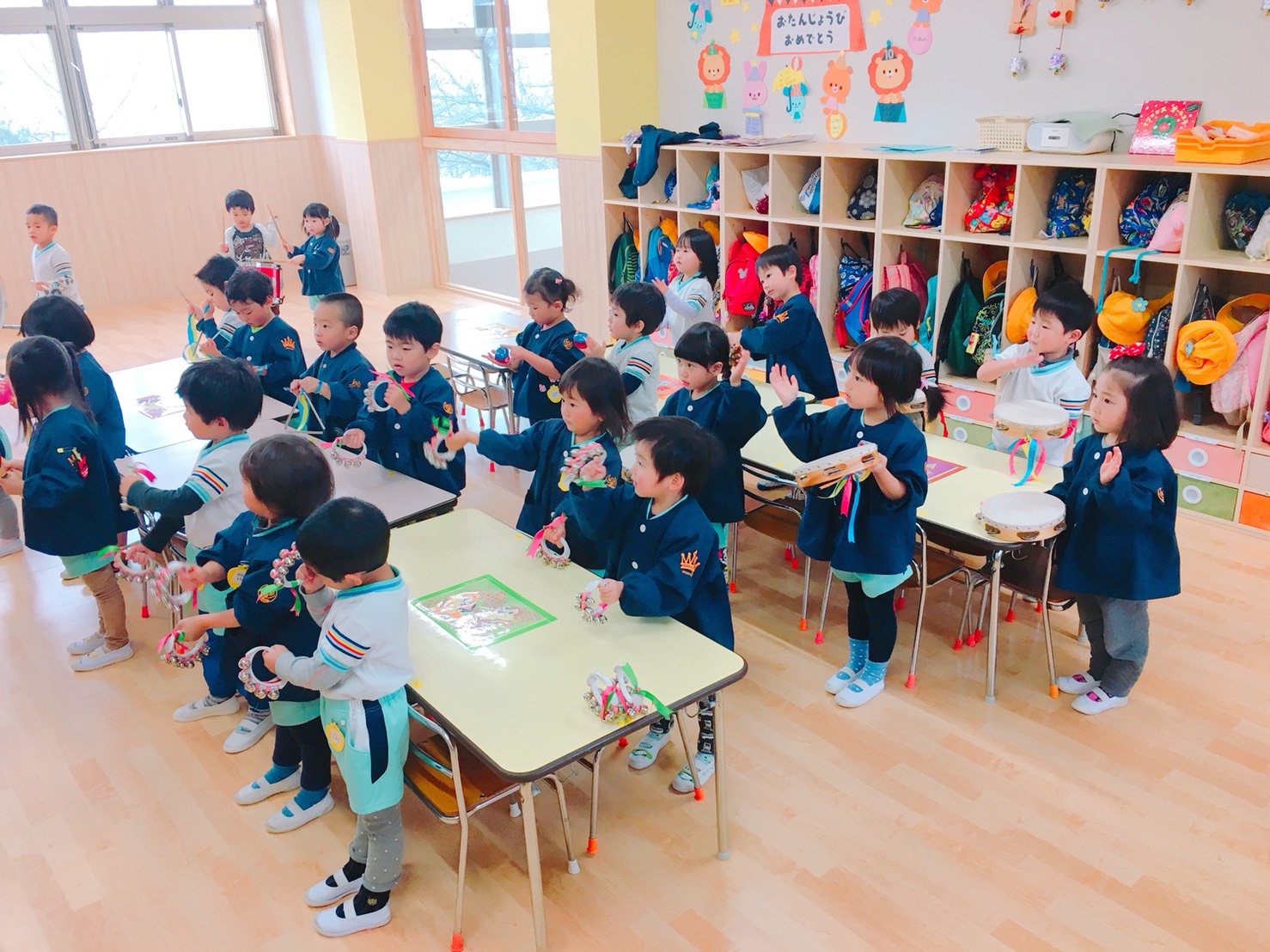 時々聞こえてくる楽器の音。各クラス、発表会に向けて、楽器遊びを日常の保育にも取り入れています。タンバリン、すず、カスタネット。そして太鼓…園にはたくさんの種類の楽器がありますが、年齢に合わせて色々な楽器を組み合わせて合奏を行います。1つ1つ、音を聞いてみると、色んなおとがして楽しいですね!