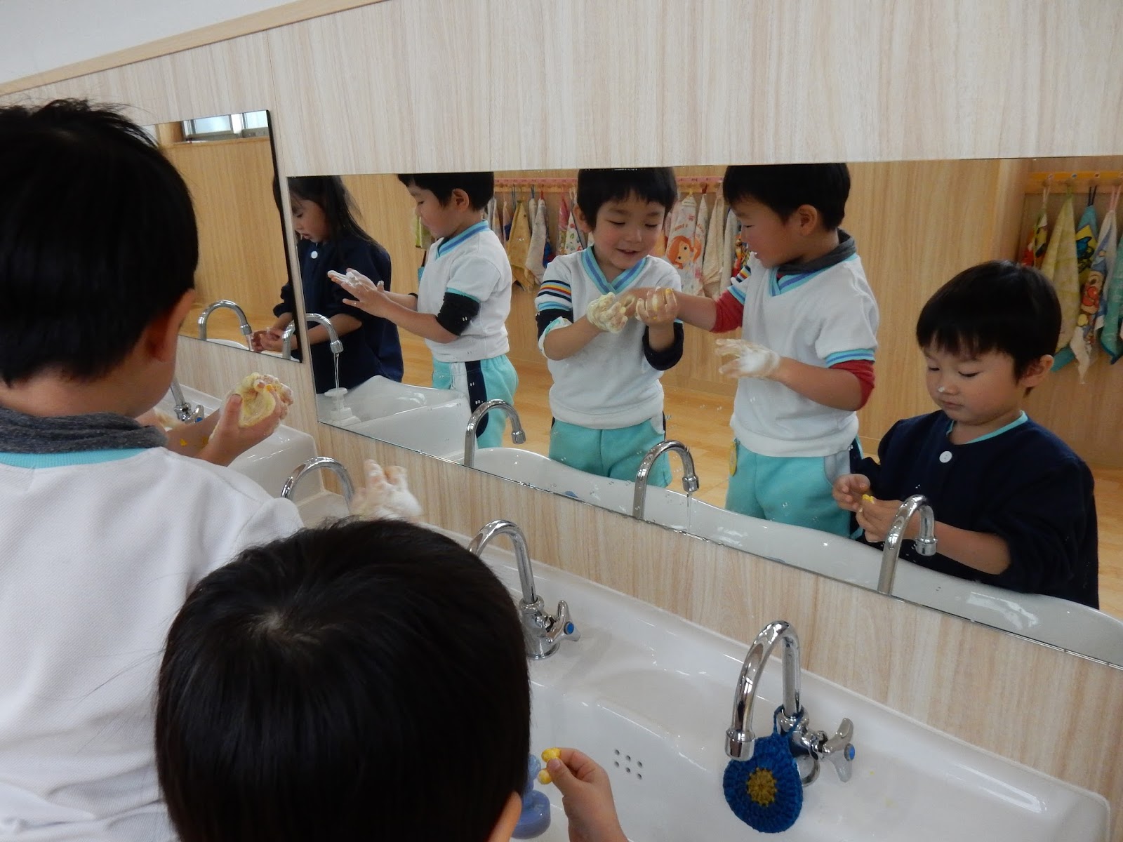絵の具を使った後のたんぽぽさん…何だか楽しそうな声につられて行ってみると、指に着いた絵の具に、泡が混ざってとってもきれいな泡♡お友達と見せ合いっこ♡楽しくて、つい、手洗いの時間が長くなっちゃいますね!(笑)