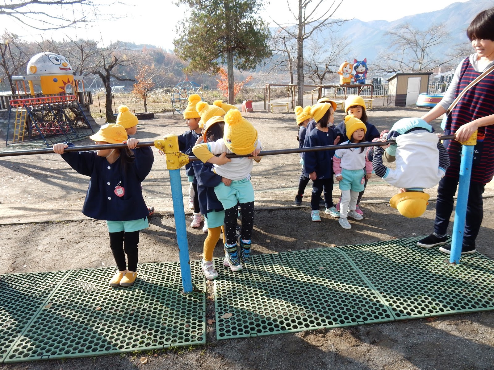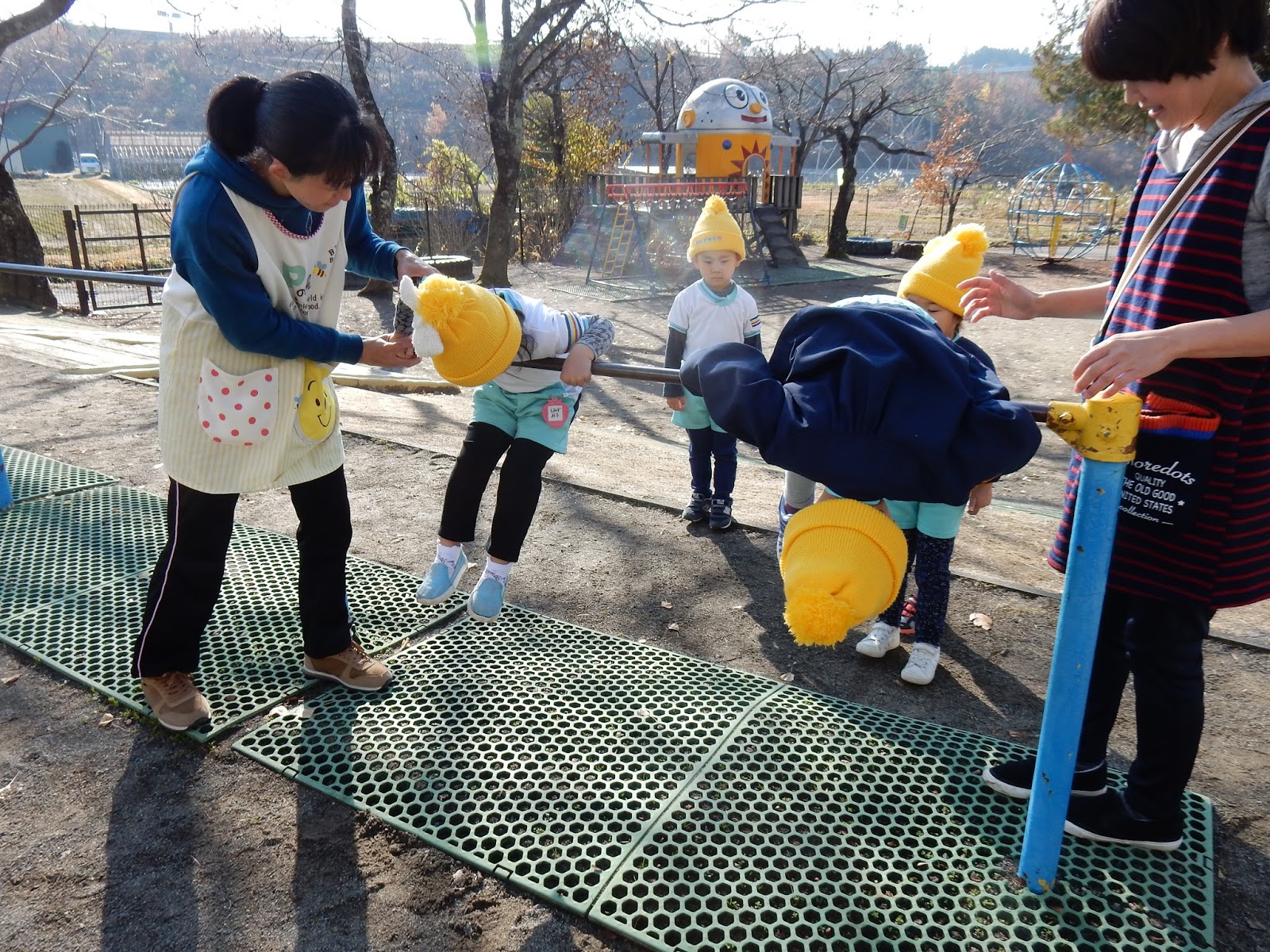 お部屋に行く前に、ひまわりさんとゆりさんは鉄棒で、逆上がりを頑張ってから‥