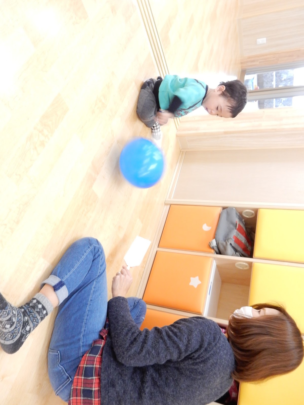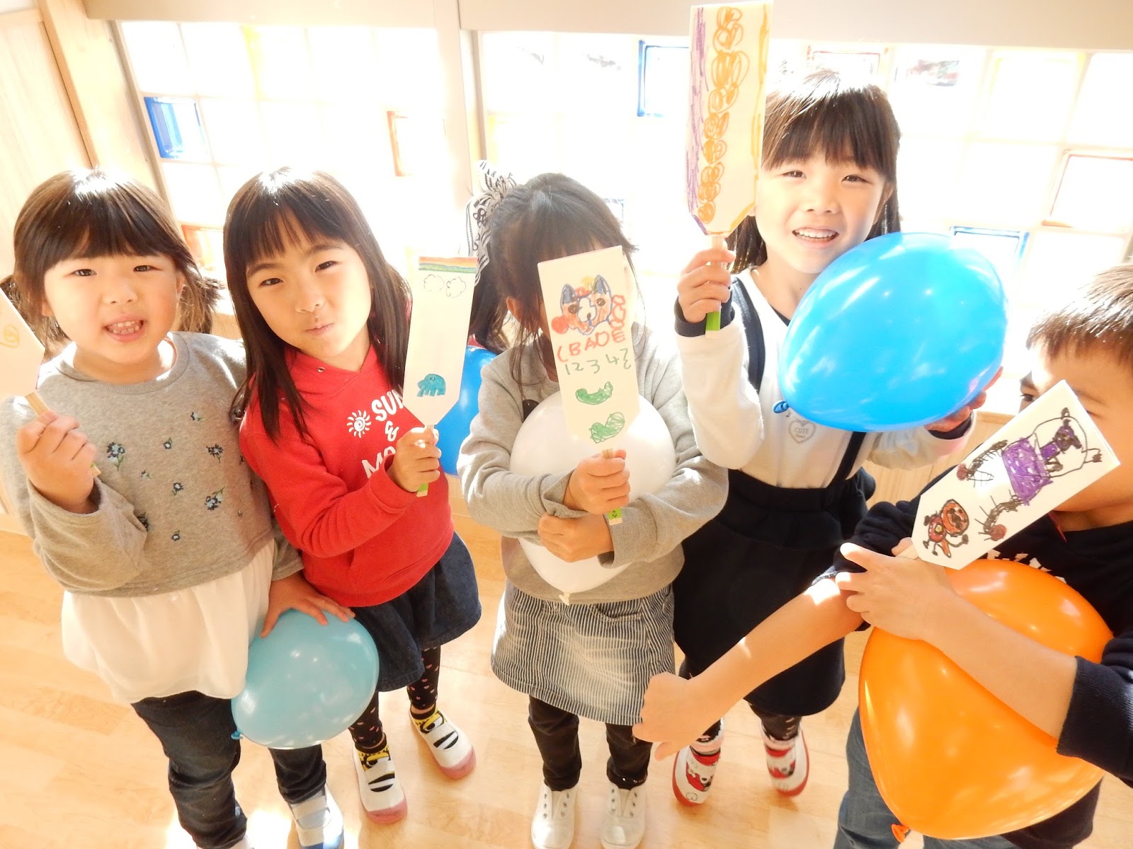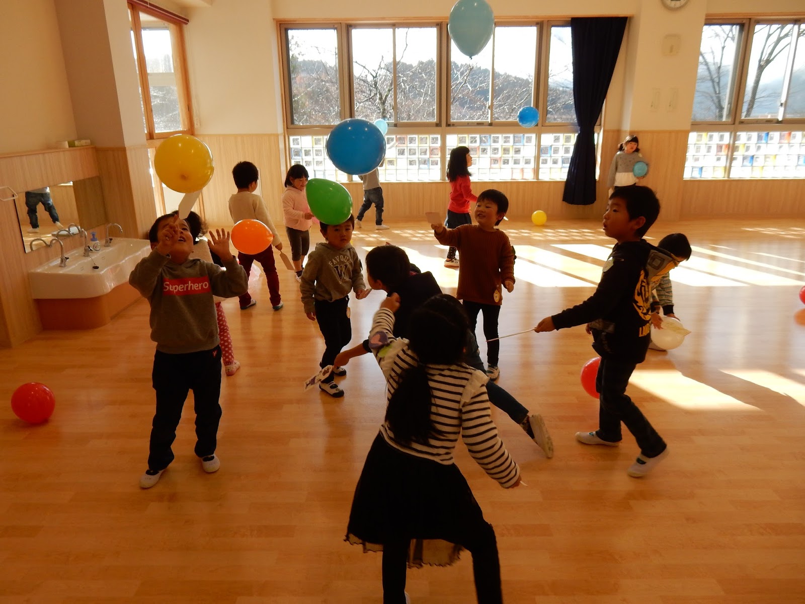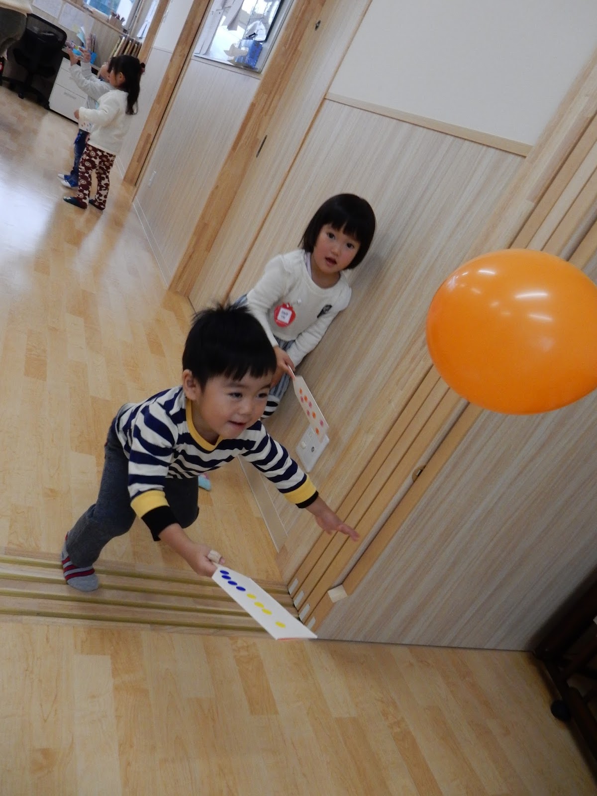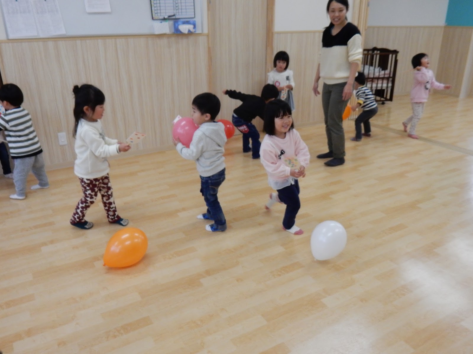 後は元気にぽんぽん!!お友達と一緒に風船を追いかけたり、1人で下に落とさないようについたり。広いホールを走り回りました!みんななかなか上手でしたよ!室内なので、風もなく、よ~く狙って、大きい子も小さい子も楽しんでいました!