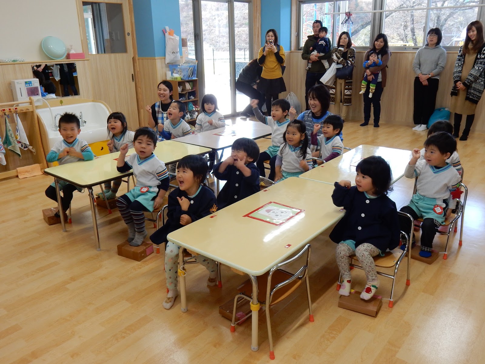 さて、ここからは今日のわいわいデーの様子をご紹介します。12月なのにお正月あそび!?とおもわれましたか??これには訳が!!保育園でお正月あそびの楽しさを知ることで、冬休みや、実際にお正月を迎えた際には是非、ご家族で遊んでほしい!という思いがあって、この時期にこのテーマを選んでいます。今回取り上げた遊びは、羽子板、カルタ取り、福笑いの3つです。