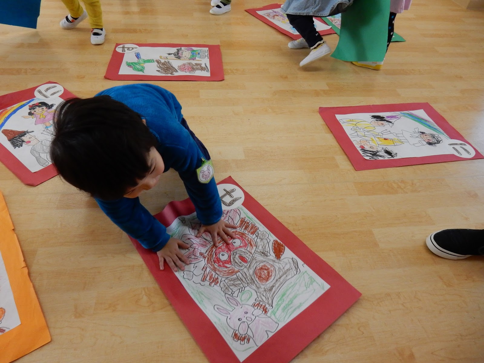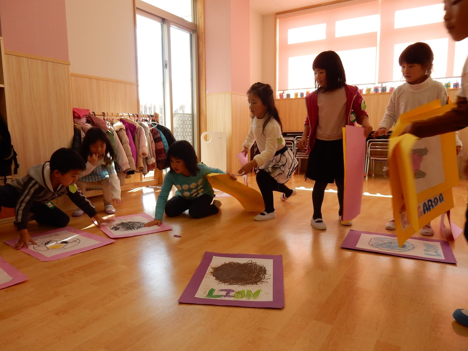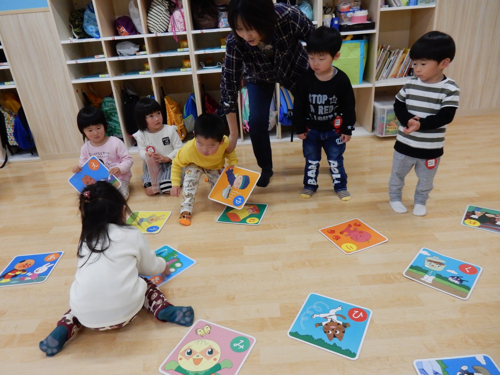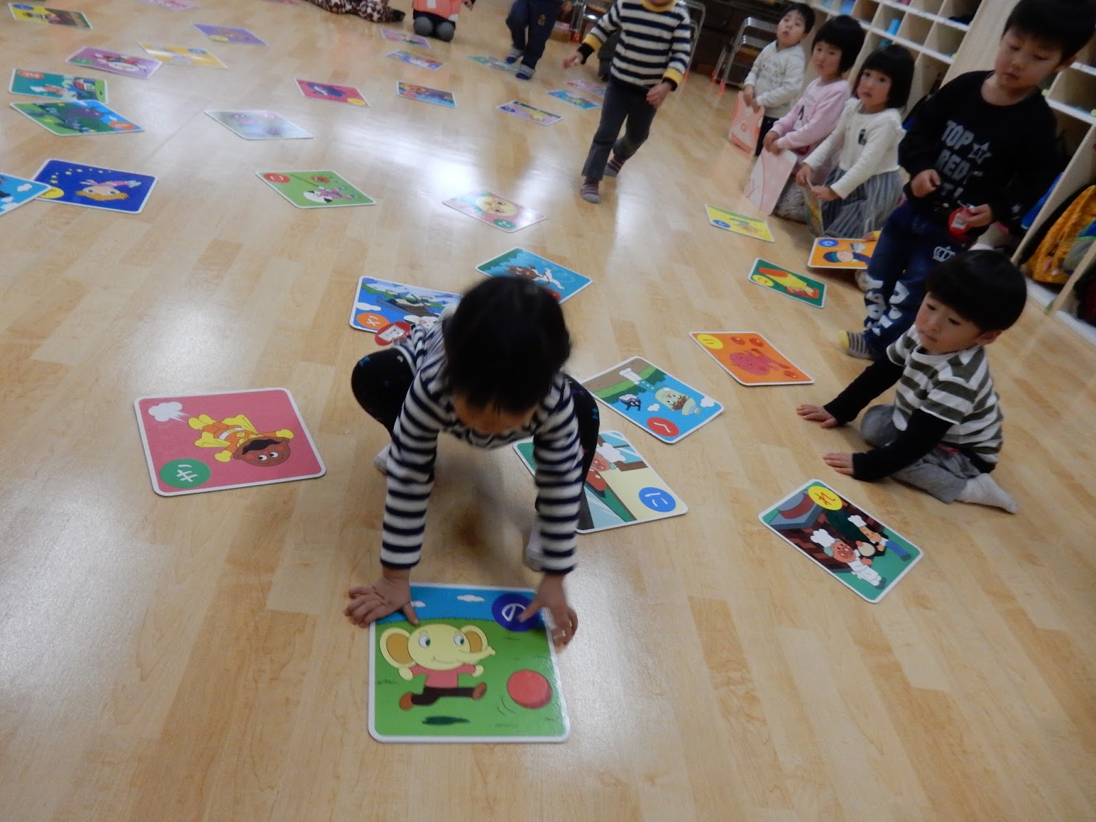 カルタ取りは、写真でも分かるように、大きな大きなカルタを使いました!すみれさんはアンパンマンカルタ。大きいクラスはお話かるたと、英語かるたを用意しましたよ!大型かるたなので、よーく見て、走って!!みんな必死です(笑)お友達の事を応援したりしながら順番に楽しみました!