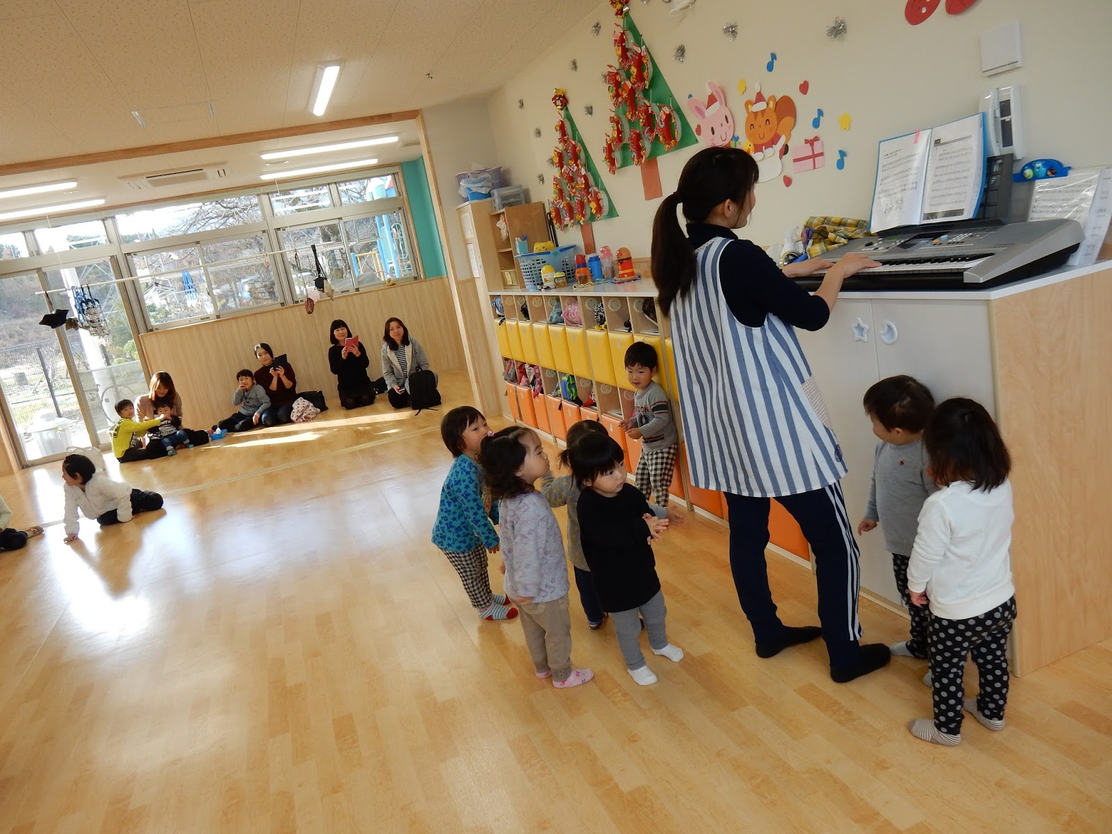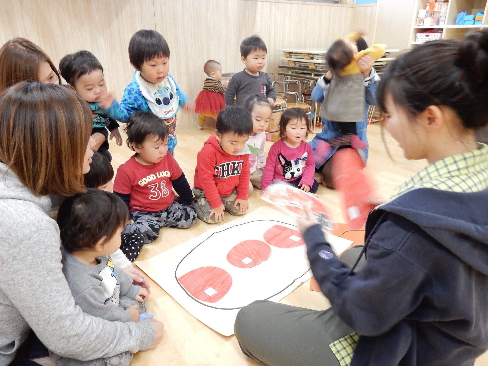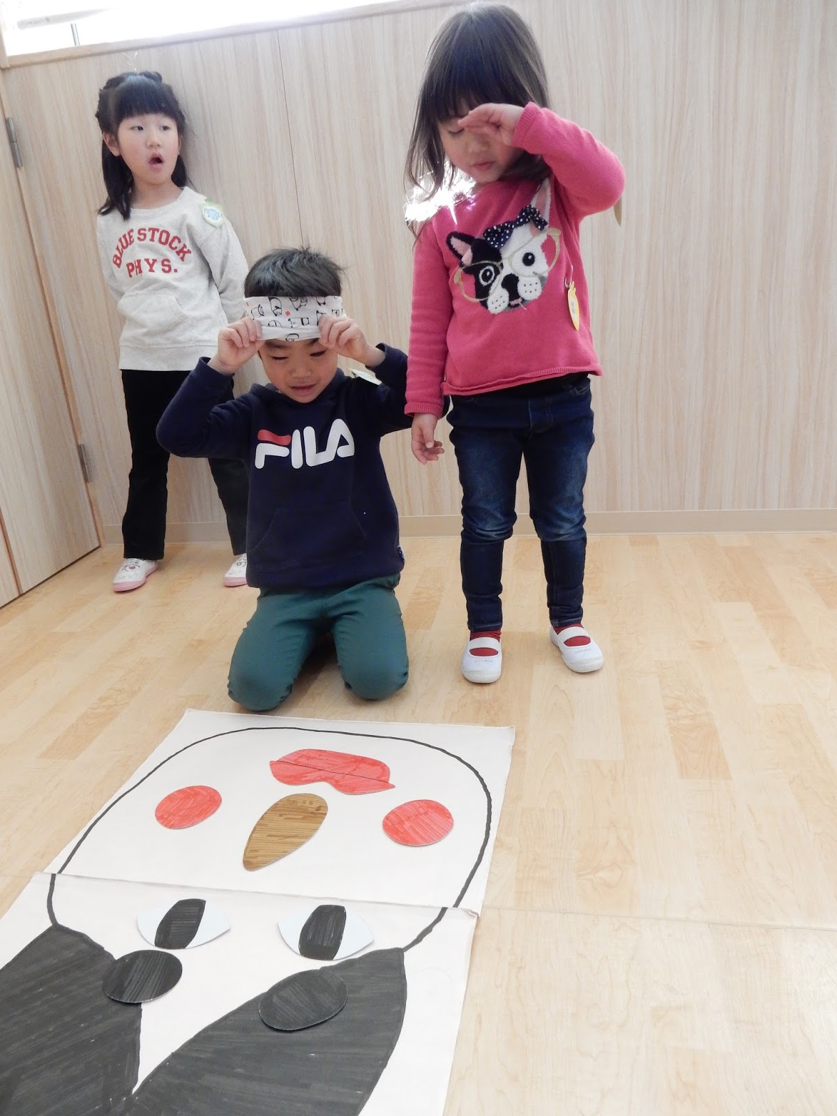 こちらは福笑い。初めて挑戦したお友達もいたのではないでしょうか!ひよこさんは、大好きなアンパンマンや、トーマスのお顔を作ってあげる♪と先生と一緒にやってみました。少し難しそうでしたが、並べて顔が完成すると嬉しそうでしたよ!