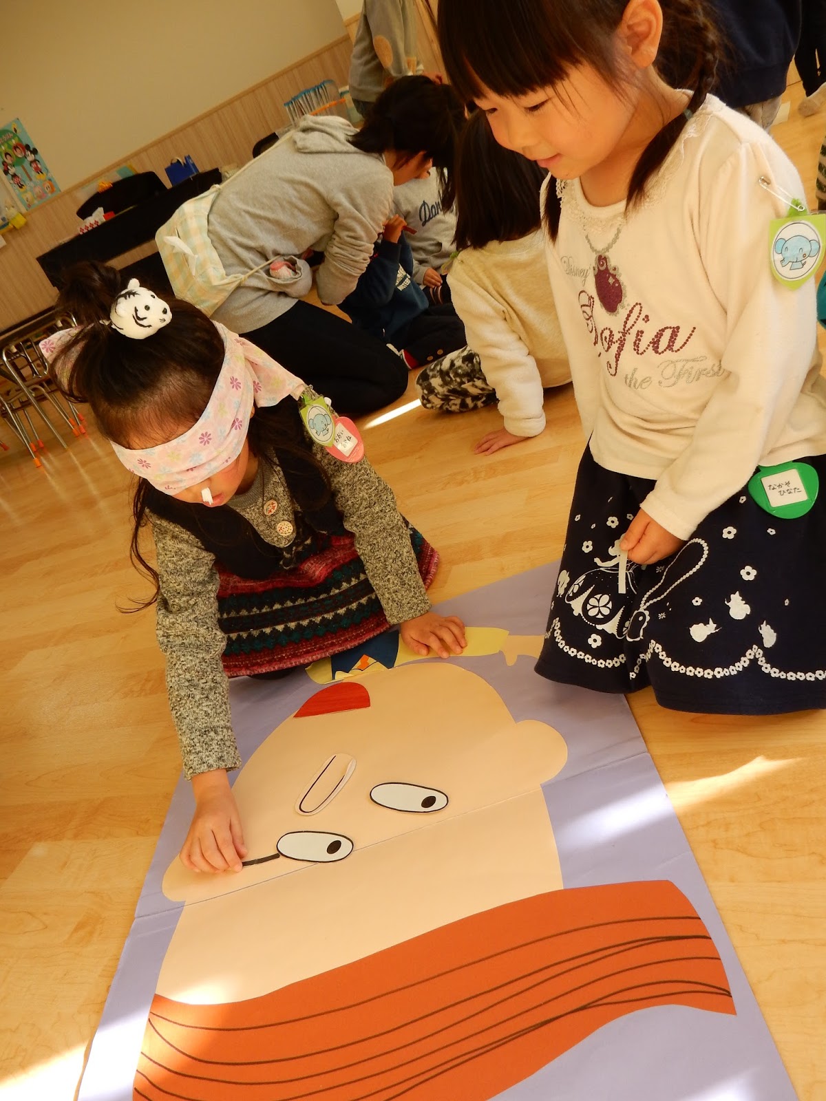 大きいお友達は、目隠しをして挑戦!『次は目!』 『もっと下!』と、周りでお友達が教えてくれます。目かくしを外して目の前にある顔に、『あはははは~!!!』と笑い声が響いていました!