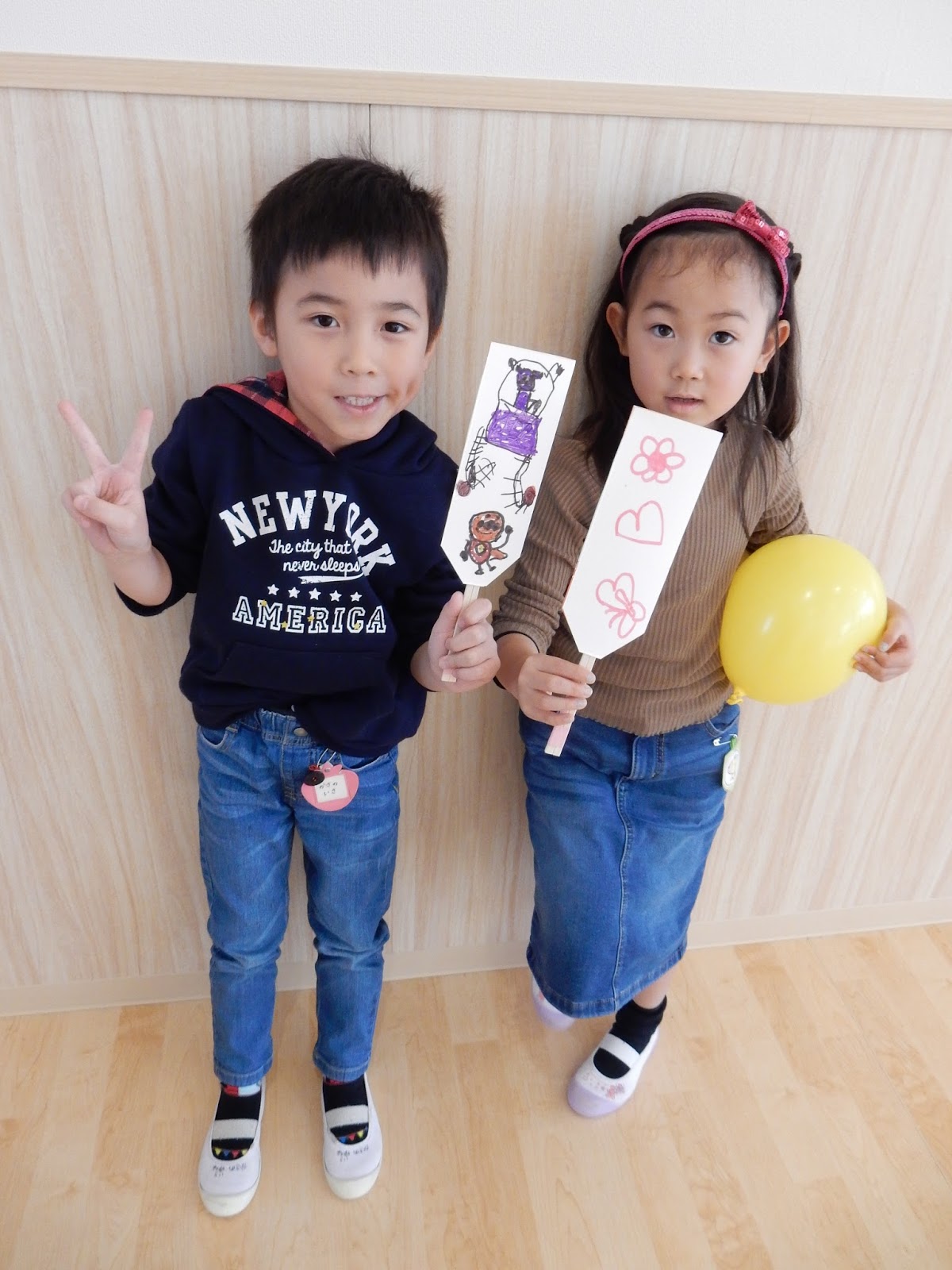 まずは羽子板。牛乳パックと、割箸で作った羽子板に、小さいクラスはシールを貼って水玉模様に。大きいクラスは、マジックで好きなようにお絵描きをしてオリジナルの羽子板を作りました。描くのが楽しいお友達は、こっちに時間をかけて完成させ、遊んだ時間はもしかしたら短かったかも(笑)出来上がった羽子板と、風船を準備したら…