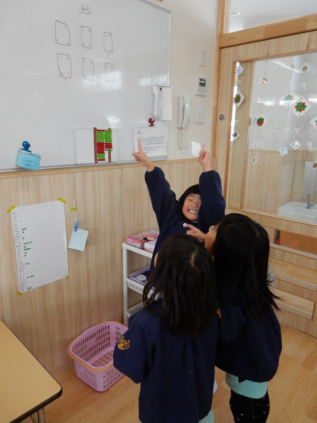 ひまわりさんのお部屋では、朝席替えのくじ引きをしていました。1枚ずつくじを引いて、ボードに書かれた場所を確認。なんだかこの光景が、受験の合格発表みたいで面白かったですよ!