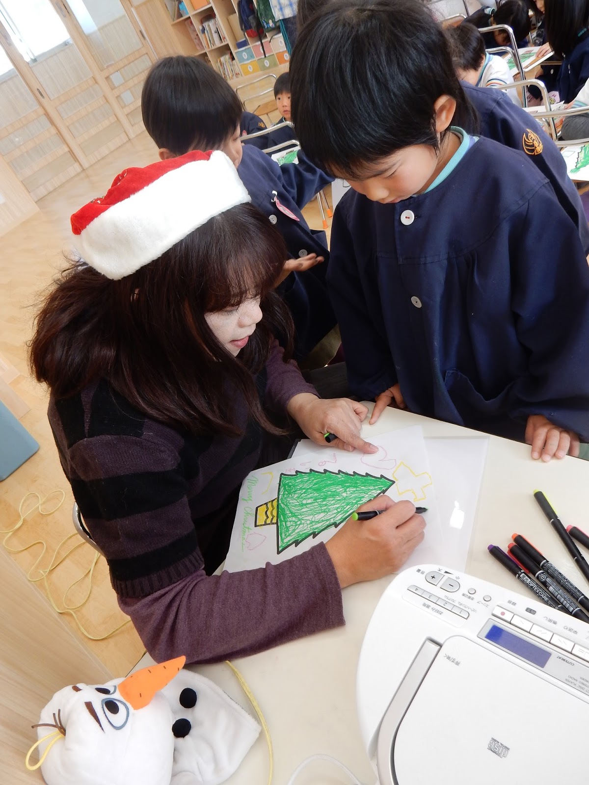 新しく決まったグループでクリスマスの製作。クッキーの型抜きと、紙粘土を使ってツリーに飾るオーナメントを作っていました。お菓子作りをしているみたいにカラフルな紙粘土に、みんなとっても楽しそうでしたよ!
