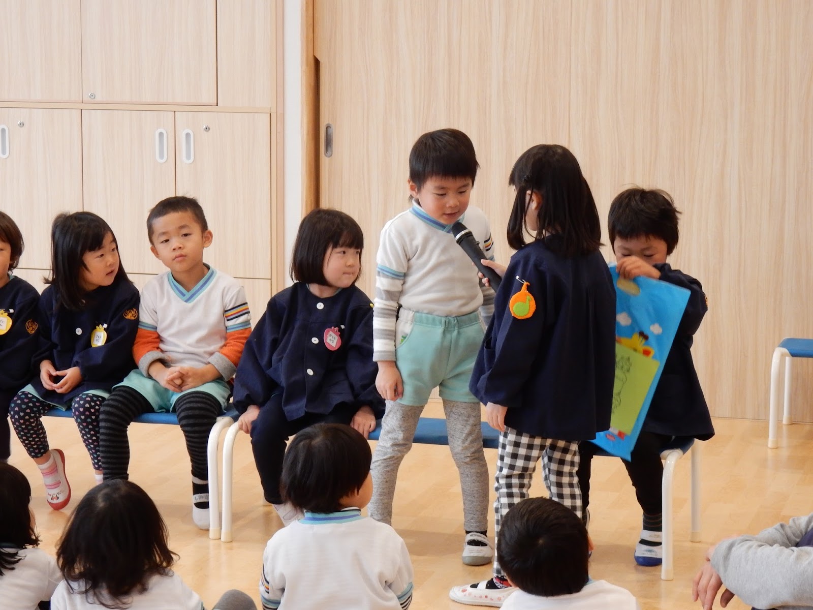 名前と年齢を聞かれて上手に答えてくれるみんな。大勢のお友達の前ですが、がんばって言えたよ!さすが!1つ大きくなったみんな!度胸もついてきました!