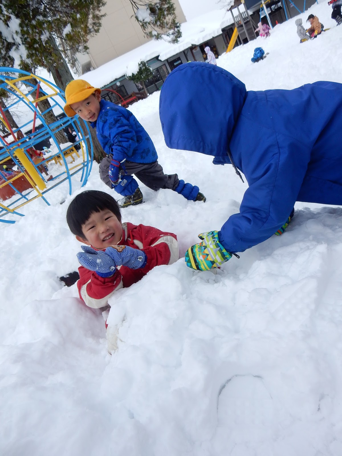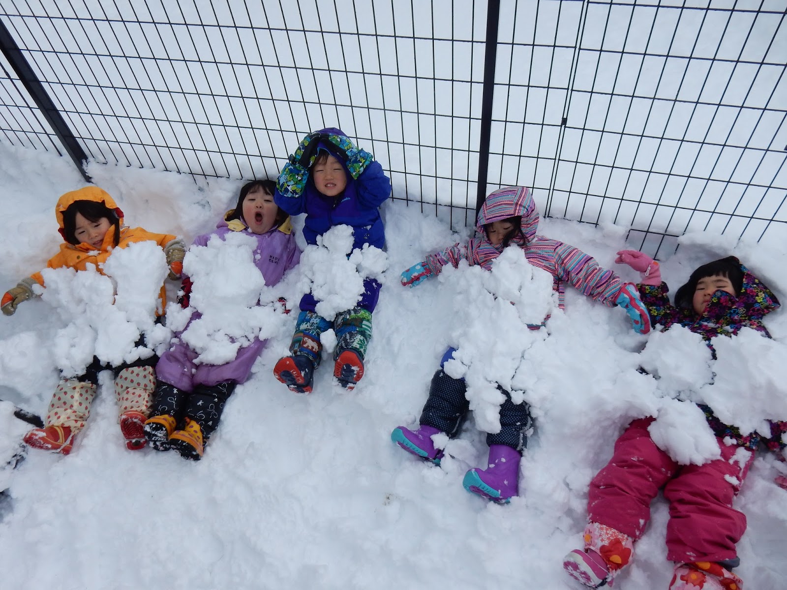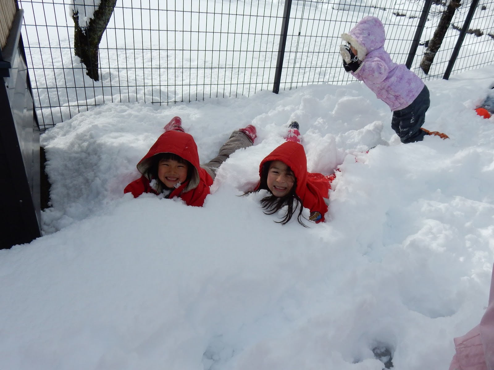 さて、昨日からウズウズ…していたみんな。今日はお誕生日会後に雪遊びをしましたよ!ふわふわに雪の中にダイブ!!!今日はこんな遊びが楽しかったです!歩くのが困難なほどに降り積もっていたので、みんな雪の中を泳いでいるかのようにモゾモゾ移動していました(笑)