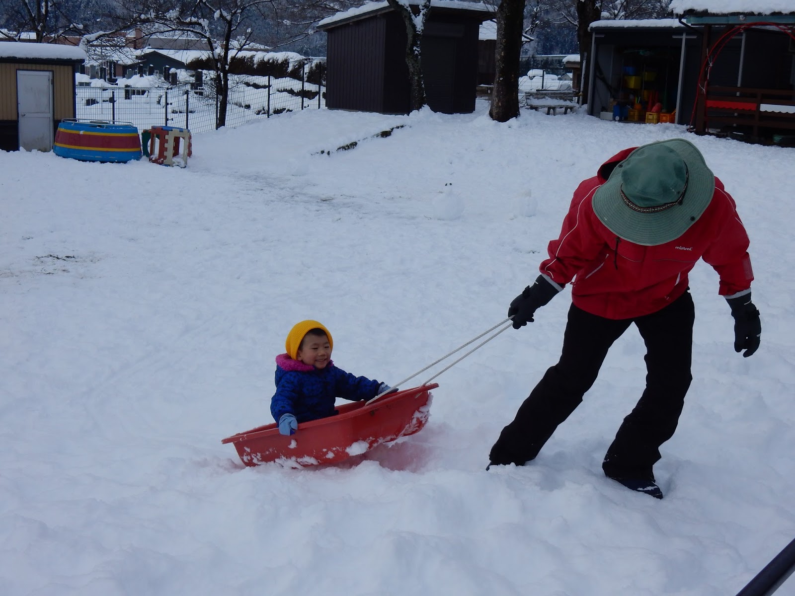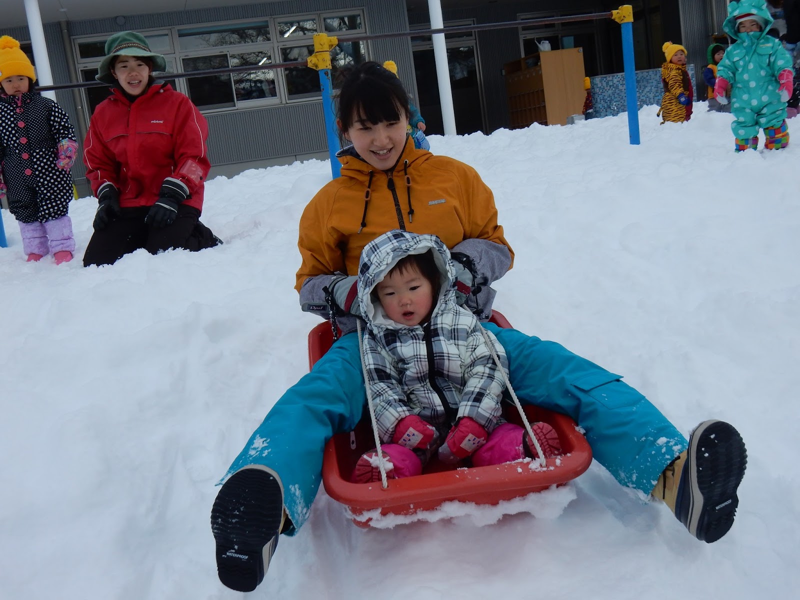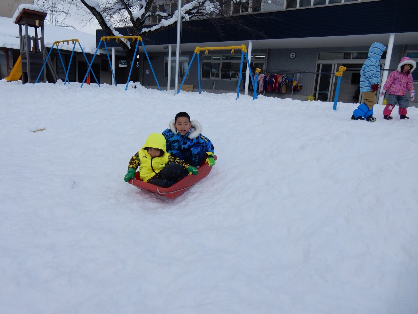 今日はそり遊びも楽しみました!みんな順番を守って楽しむことができました!最初はおっかなびっくり、顔が引きつっていたお友達も、徐々に慣れてくると、『もう1回!』と自分でそりを引いて坂道を登っていました。