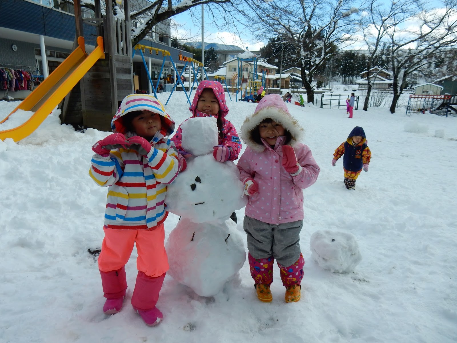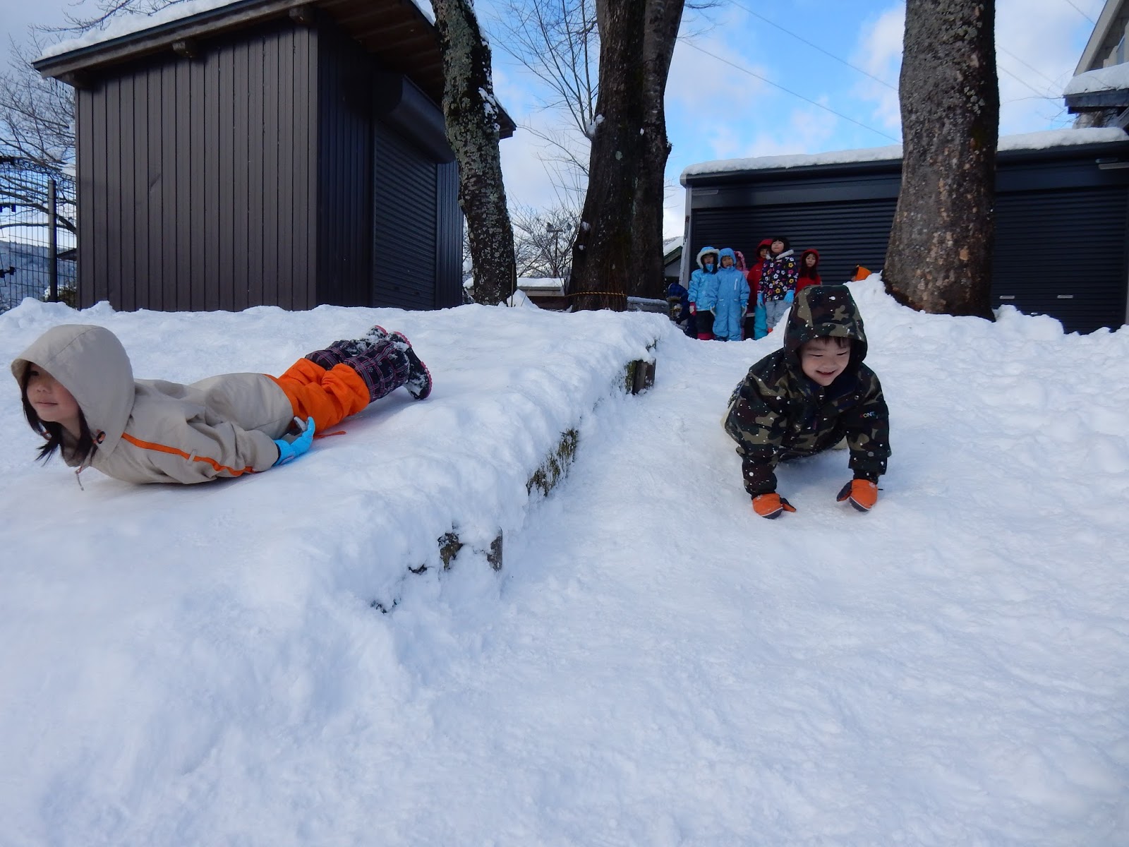 重たい雪玉を協力して持ち上げて雪だるまを作ったり、屋根からぶら下がったツララをとってペロリとなめてみたり。木の上の雪を落とすときも、スキーウエア―の帽子をかぶればへっちゃら!あえて木の下に立って雪をたくさんかぶってみたり。まだまだ遊びはどんどん広がっていきそうです!毎日の雪遊び、子ども達は寒さも忘れて力いっぱい楽しんでいます!
