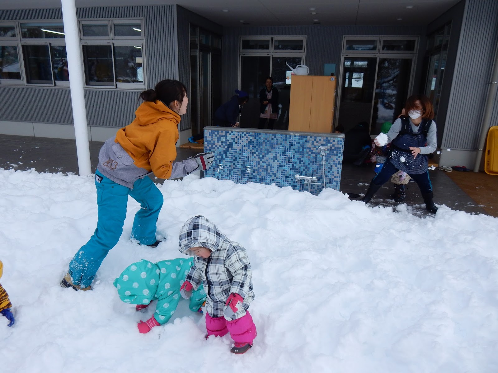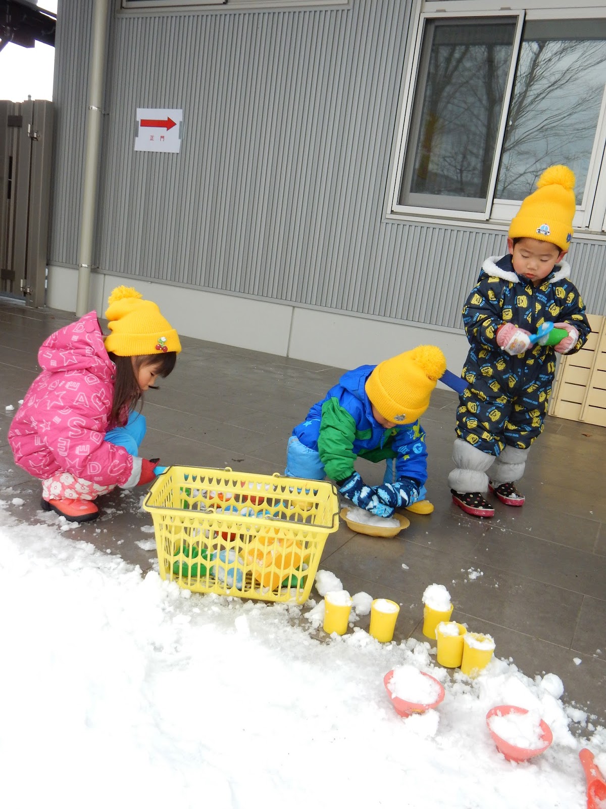 今日はままごと道具も出しましたよ!普段の砂遊びと違って、雪は固まりやすいので型抜きもしやすいです♪雪らしく、アイスクリーム屋さん、かき氷屋さんになっている子がたくさんいましたよ!