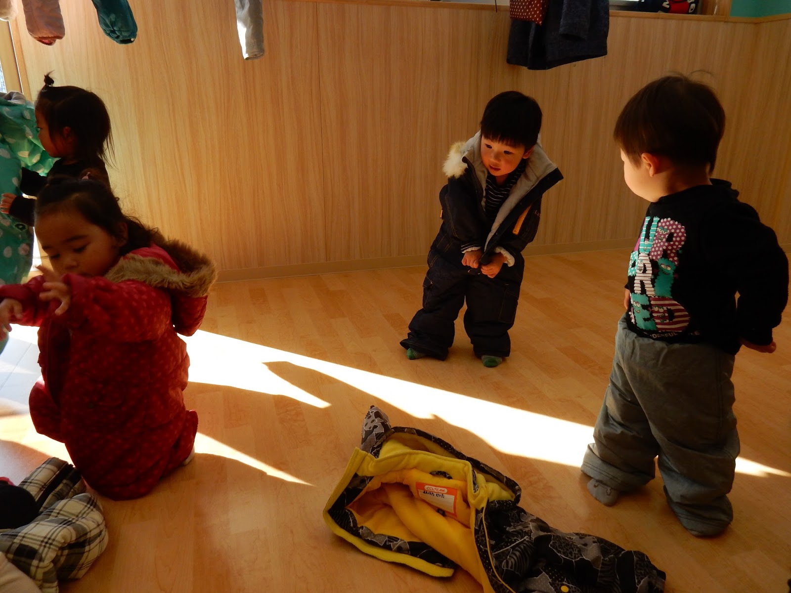 もぞもぞ…ひよこさん、寝転がってくつろいでいる…訳ではありません!みんなスキーウエア―を自分で着ようと頑張っているんです!小さな体に、大きなウエアー!着るのは簡単な事ではないんですが、みんながんばっているでしょ!!コロリと寝転がって、足や手をバタバタさせて穴の中に入れようとしているひよこさん。最終的にみんな、先生に手伝ってもらいながら着ることができました♪さぁ!!園庭に出発です!!!