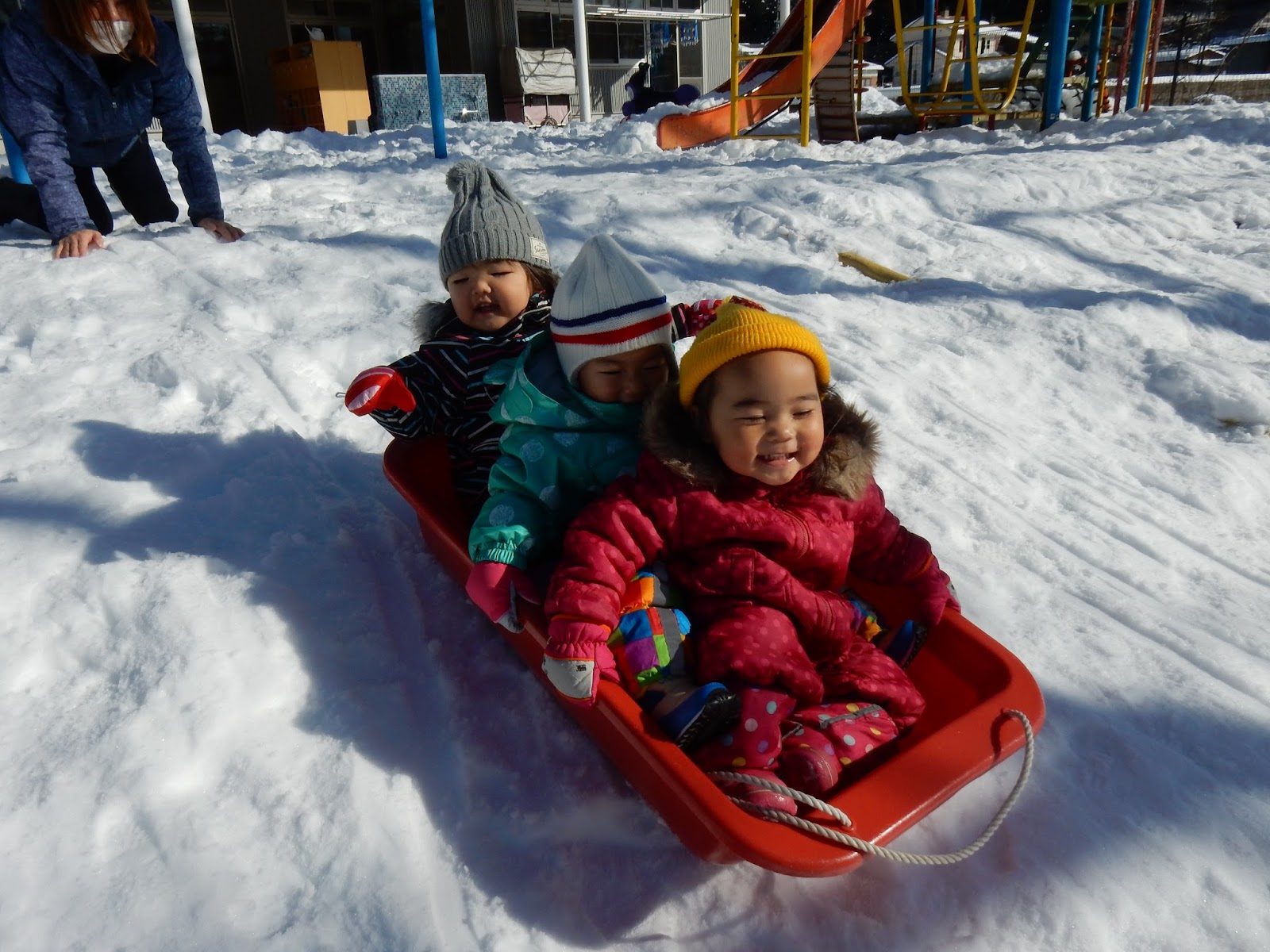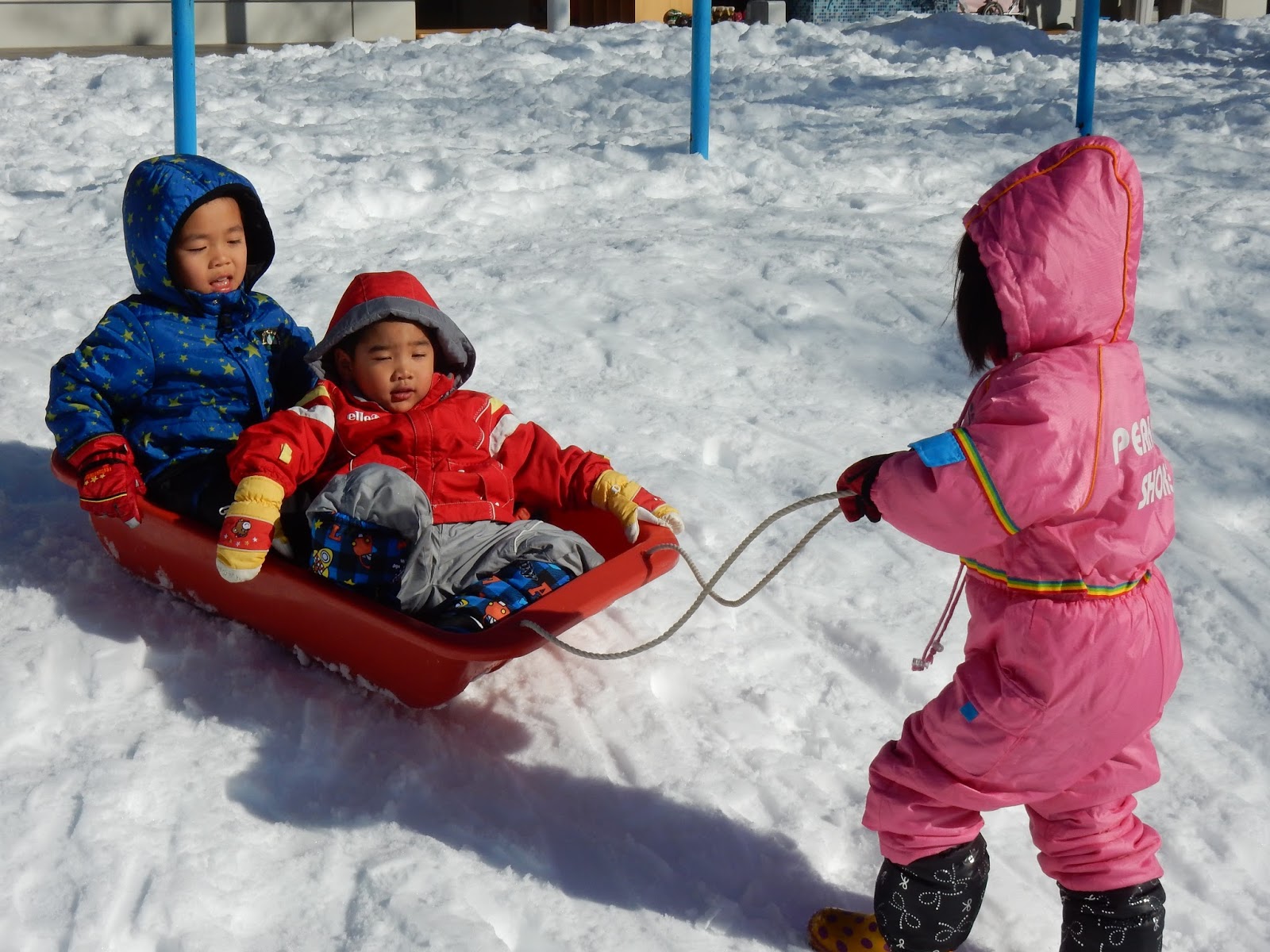 今日は天気が良かったことで雪が凍ってツルツル♪そり遊びにはもってこい!!みんな張り切って滑りましたよ~!!坂を滑ったり、園庭を引いて歩いたり。先生に引いてもらうとスリル満点!!