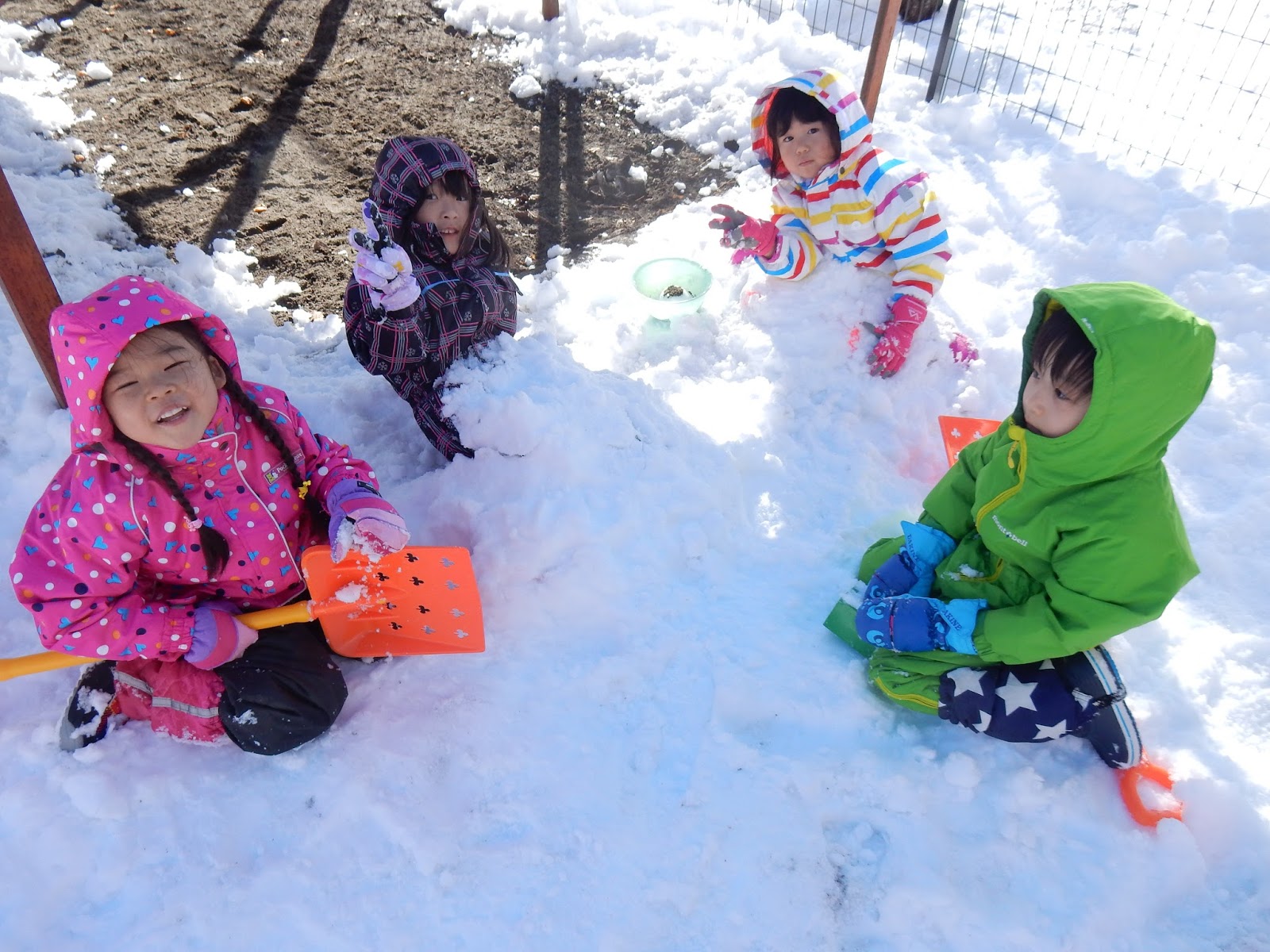 おにぎりを作ったり、ケーキを作ったり。スコップを持ってくると、またまたお友達を埋めちゃいました!(笑)雪遊びも、少しの道具を加えると、遊びの幅もグンと広がります!