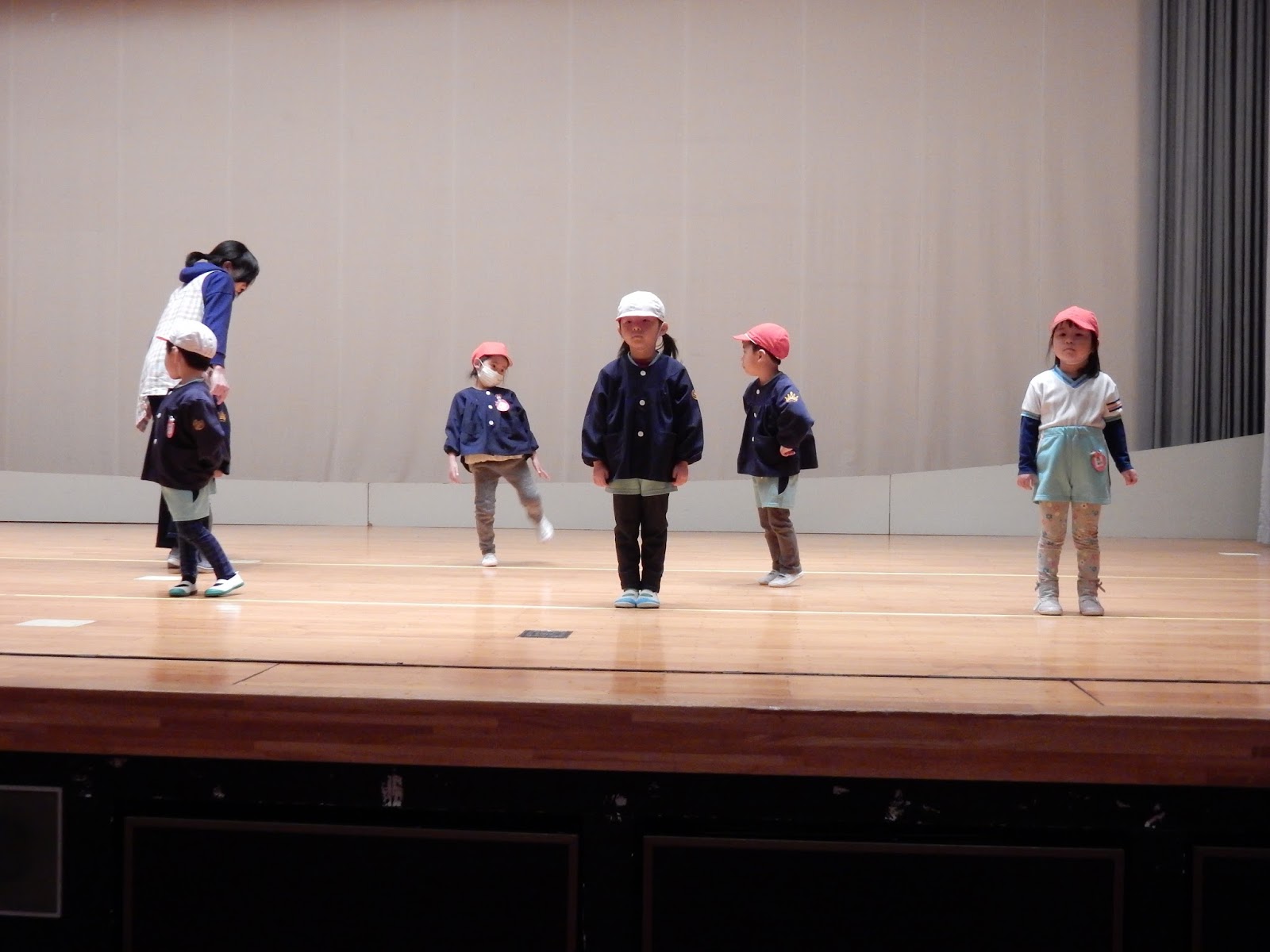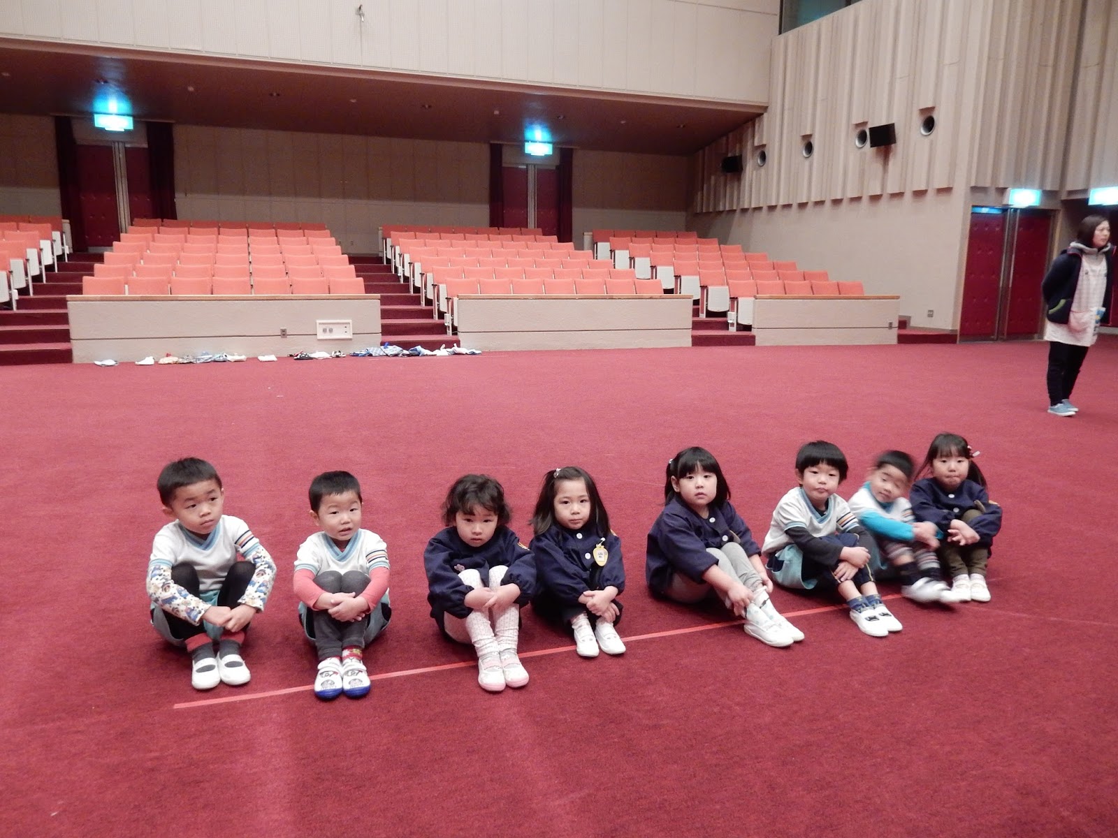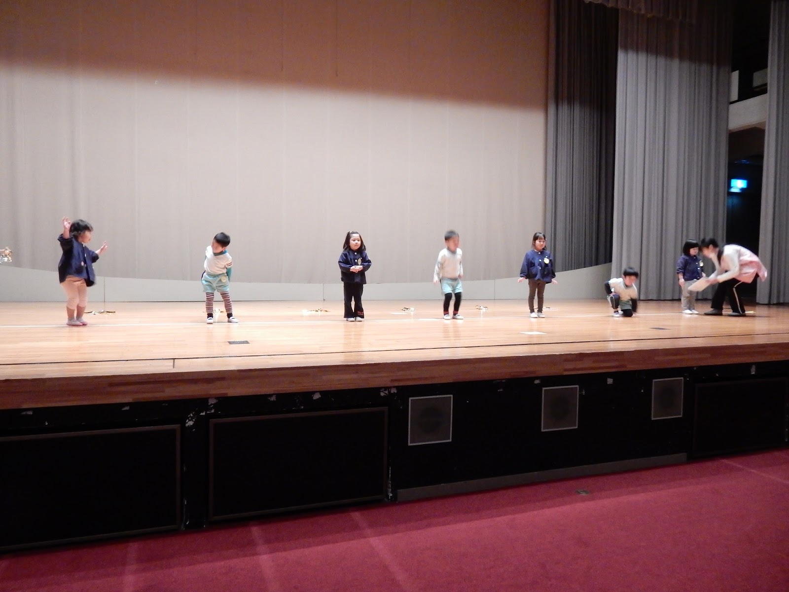 お遊戯のお友達も、隣同士の間隔を確認し、実際に踊ってみます。とっても広い舞台に、下では練習を終えたお友達も見ていてくれるという事で、張り切って踊れたのではないでしょうか!ここに発表会当日はお客さんがたくさん来て見てくれると思うと、嬉しいですよね♪