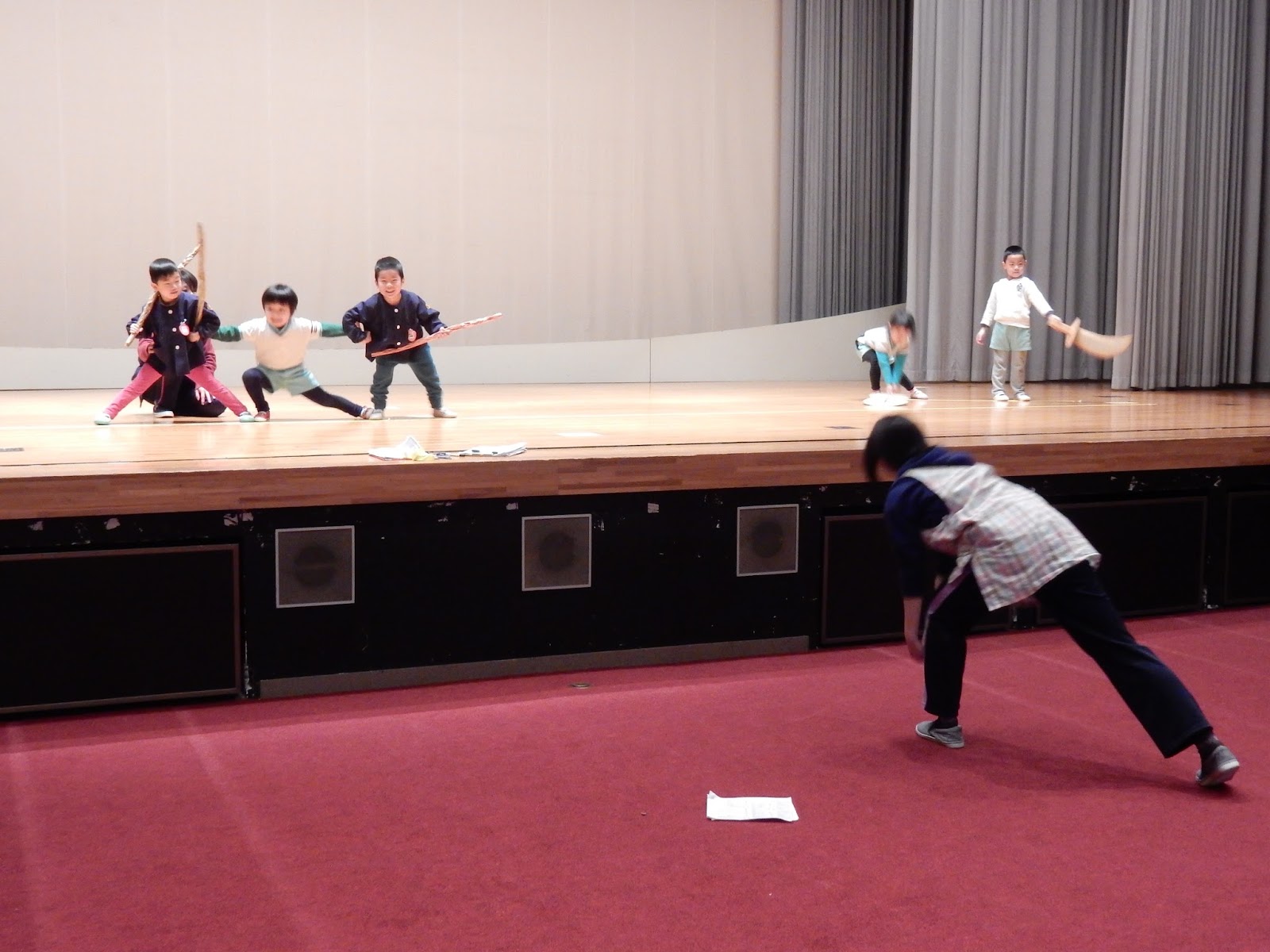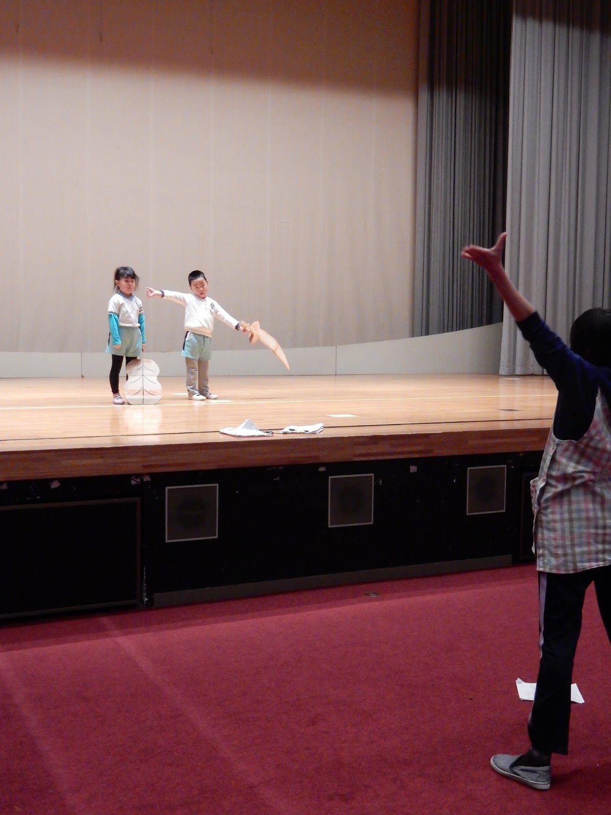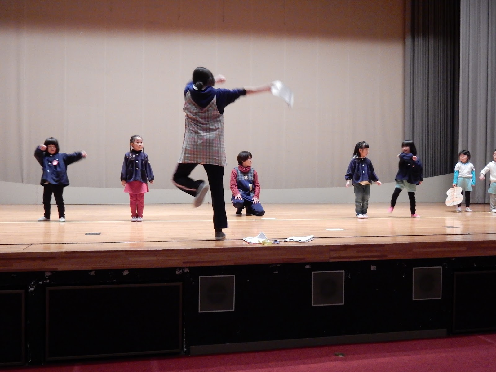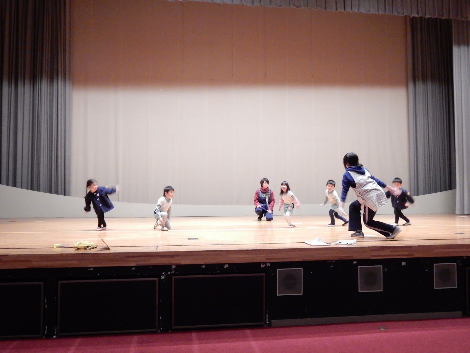 劇のお友達も、ステージに貼られたリボンテープの上に印をつけてもらい、立ち位置の確認をします。遠くのお客さんまでしっかり見えるように、腕を伸ばして、大きく動けるように練習中です!まだまだ発表会までは練習期間がたくさんあります。『今日は練習しないの??』とやる気満々のみんなです。どんな発表会になるか、今から楽しみですね!