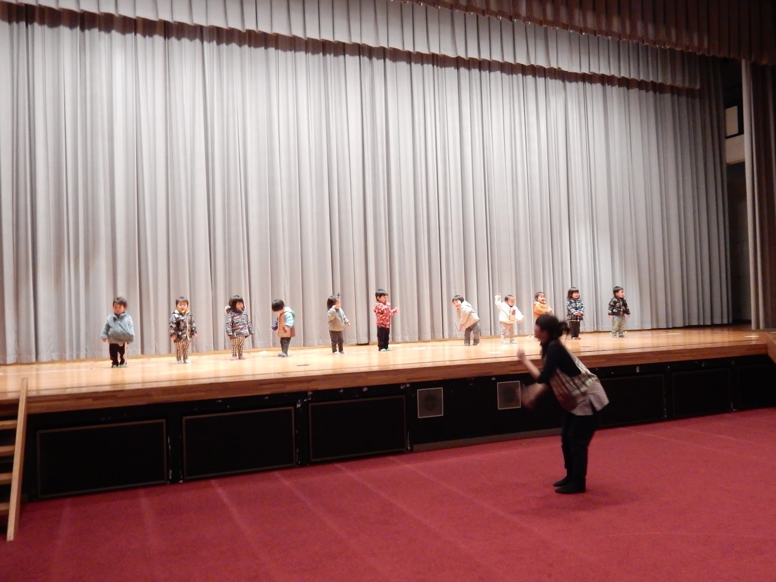 広い、広い舞台上、子ども達はとにかくキョロキョロ…横も下も、上も!全部気になる感じです!先生が一生懸命前で踊るなか、少し、体を動かしてくれる子もいましたよ!さぁ、発表会当日は、この会場内にお父さん、お母さんをはじめ、お客さんがたくさん見えます…運動会では、みんなで座り込んで座談会…というこれはこれで可愛らしい姿を見せてくれたひよこさんでしたが、発表会はどうでしょうね!