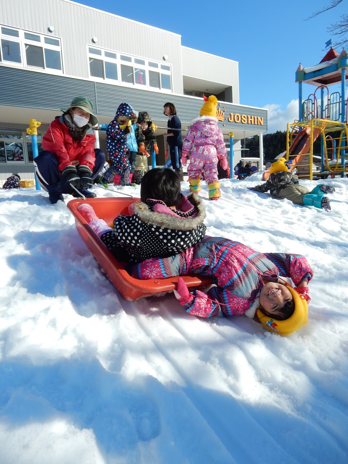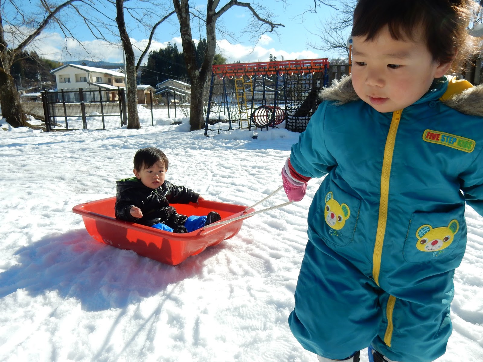 小さい子はそり遊びも楽しい!回数を重ねて、遊び方もわかってきたので、こうやってお友達同士で引っ張ったりする姿もたくさん見られます!