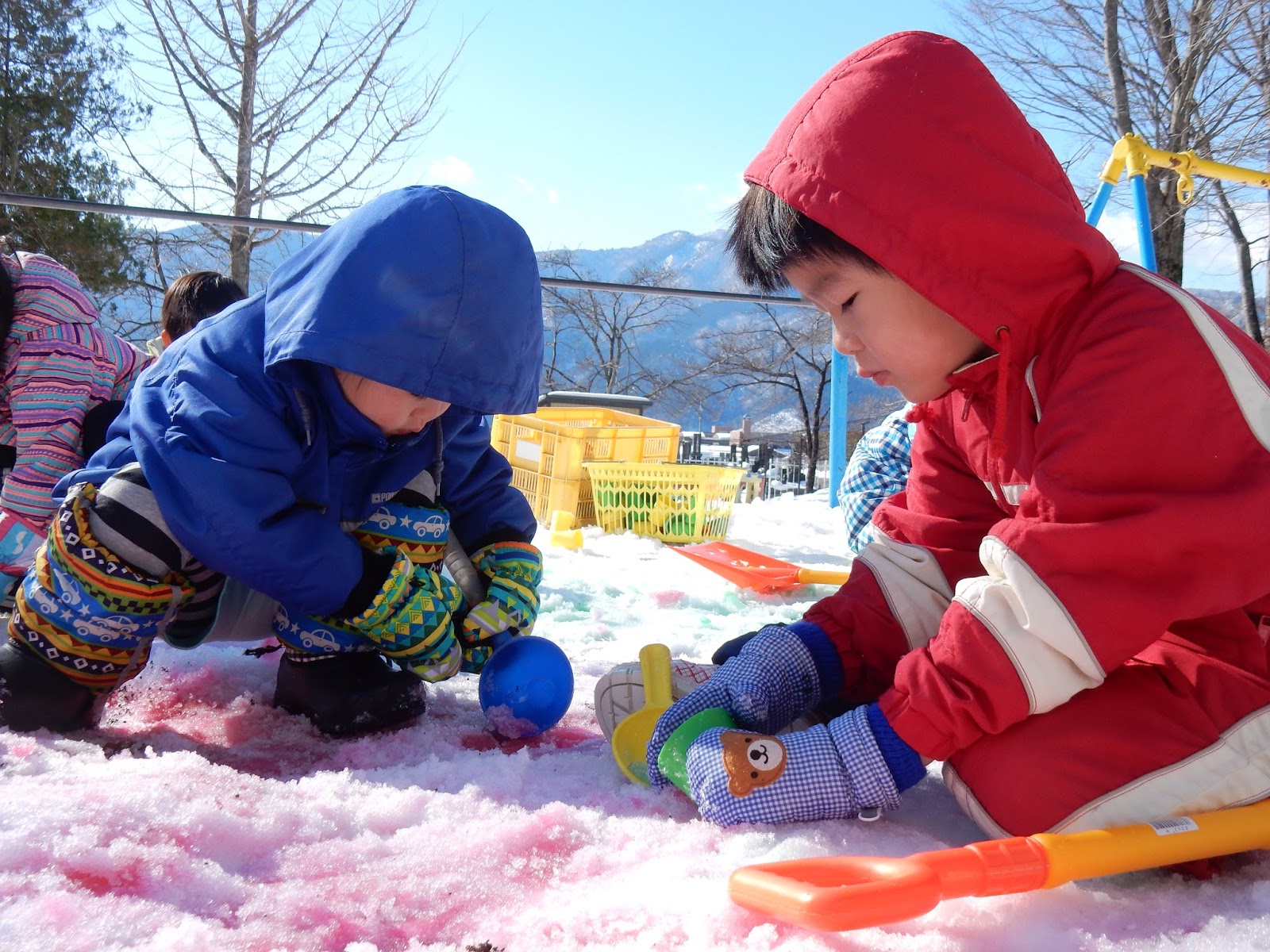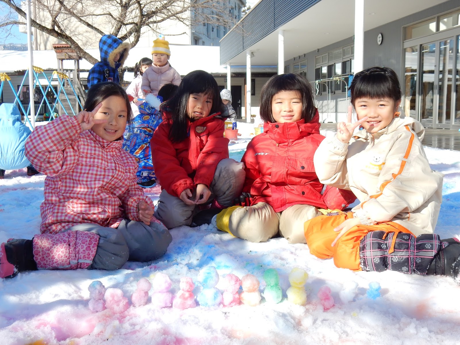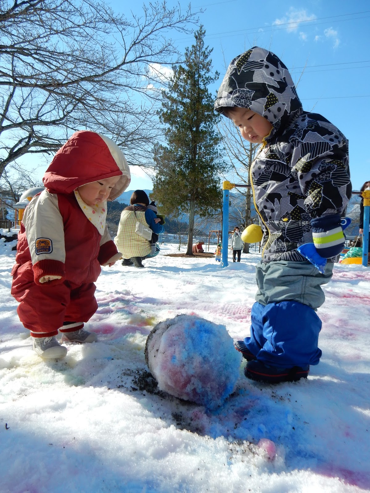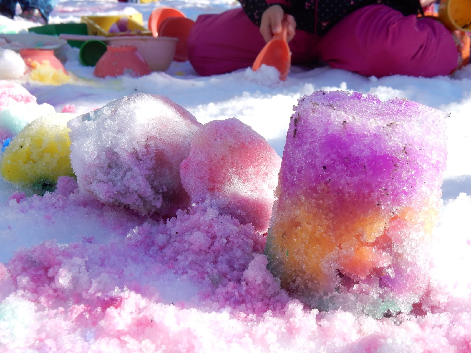 園庭の雪も少なくなってきましたが、今日はまた子ども達の“遊びスイッチ”がオンになるようなしかけが!!!写真で伝わるでしょうか!絵の具を使って、雪に色をつけてみました!