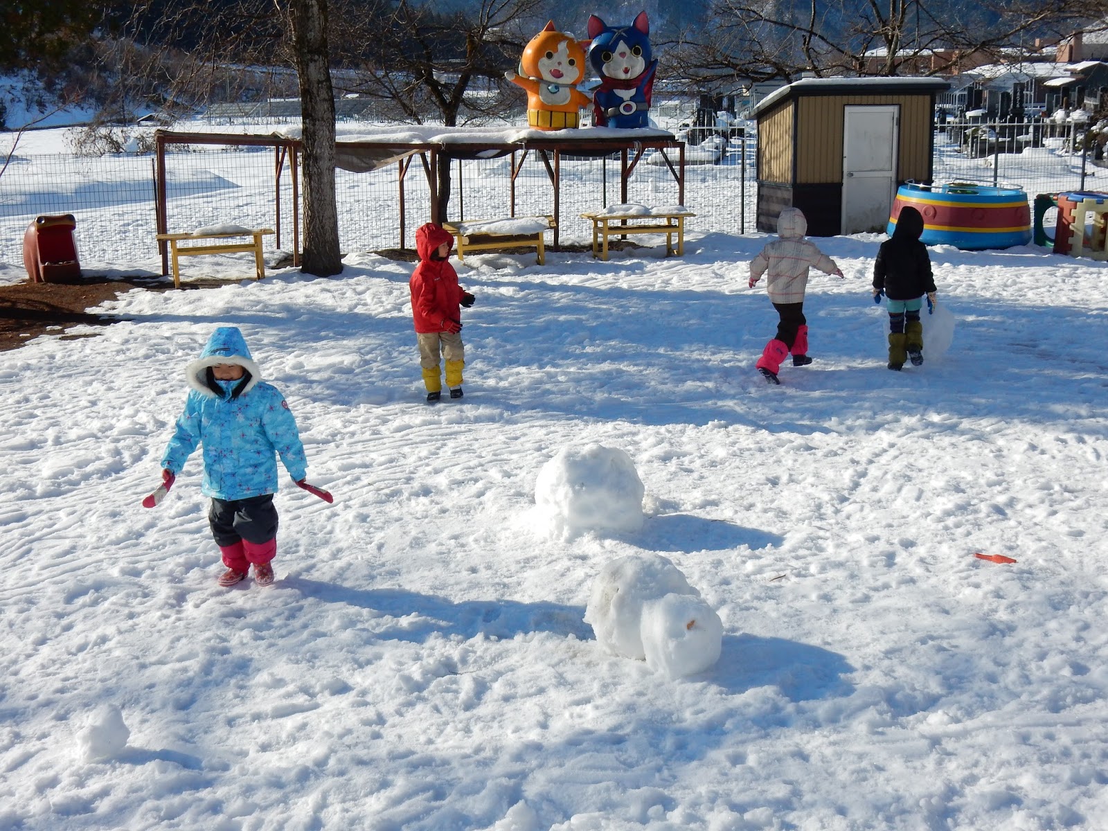 こちらは雪の上でおにごっこ!転がった雪玉の上はバリアゾーン!なかなか工夫して楽しそうな遊びを考えています!
