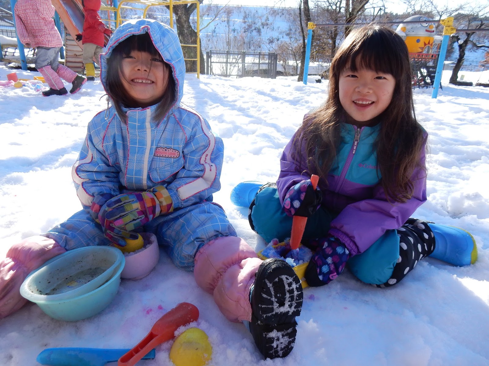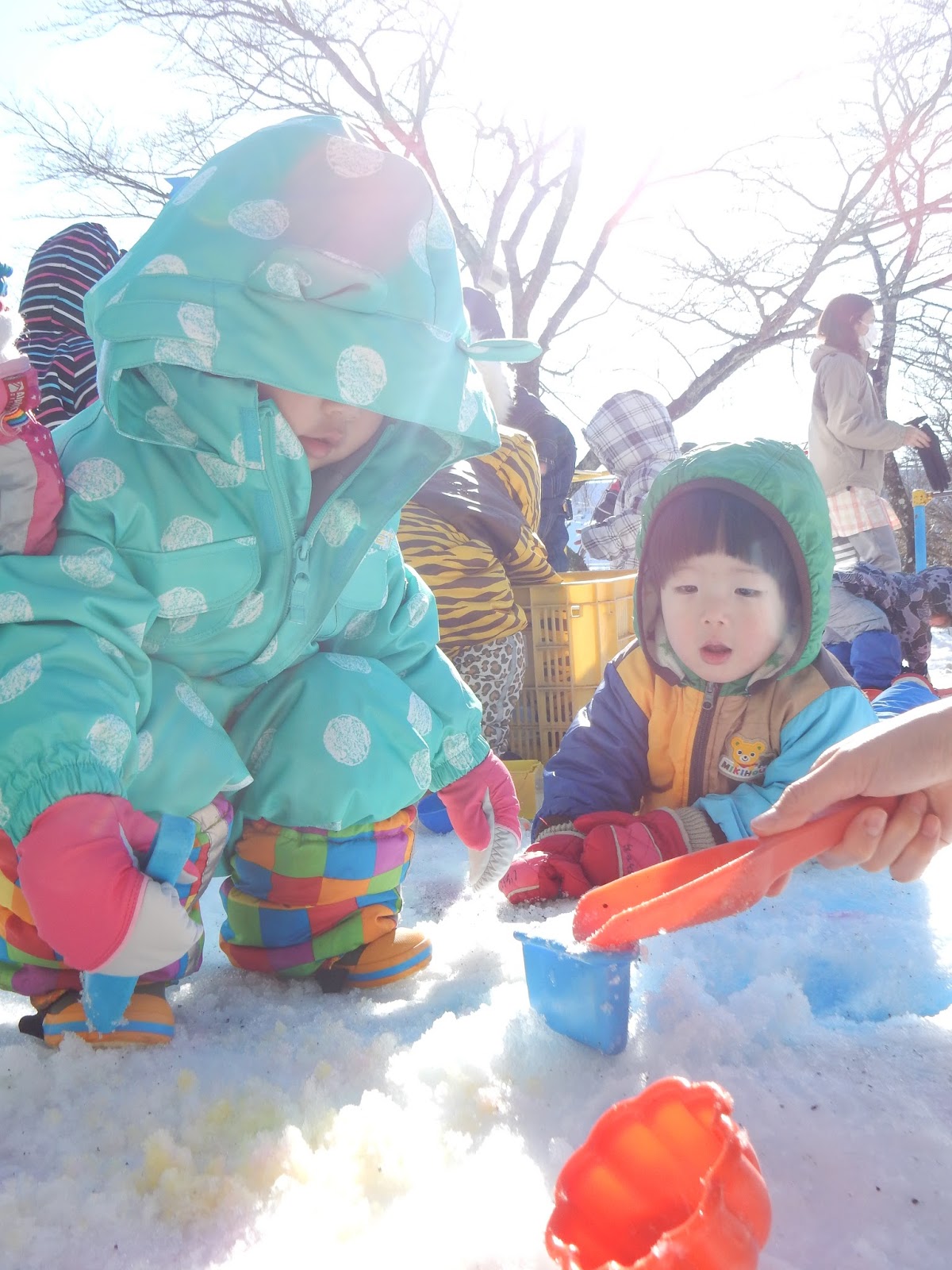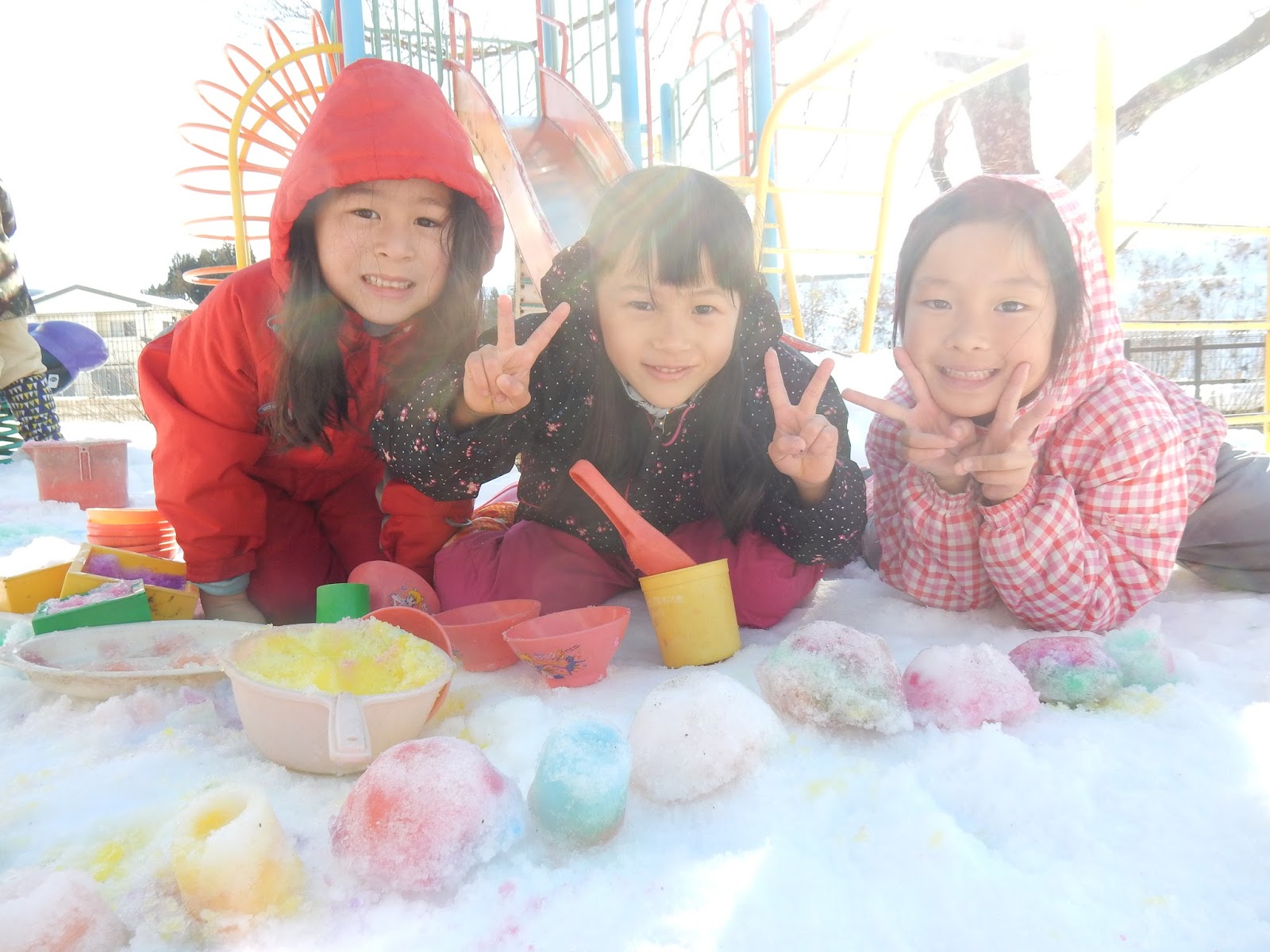 色んな色の雪をスコップで掘って、お皿や型抜きに入れてきます。あちらこちらから、『何味にしますか??』 『はい!かき氷、お待たせしました!』という声が聞こえてきました♪