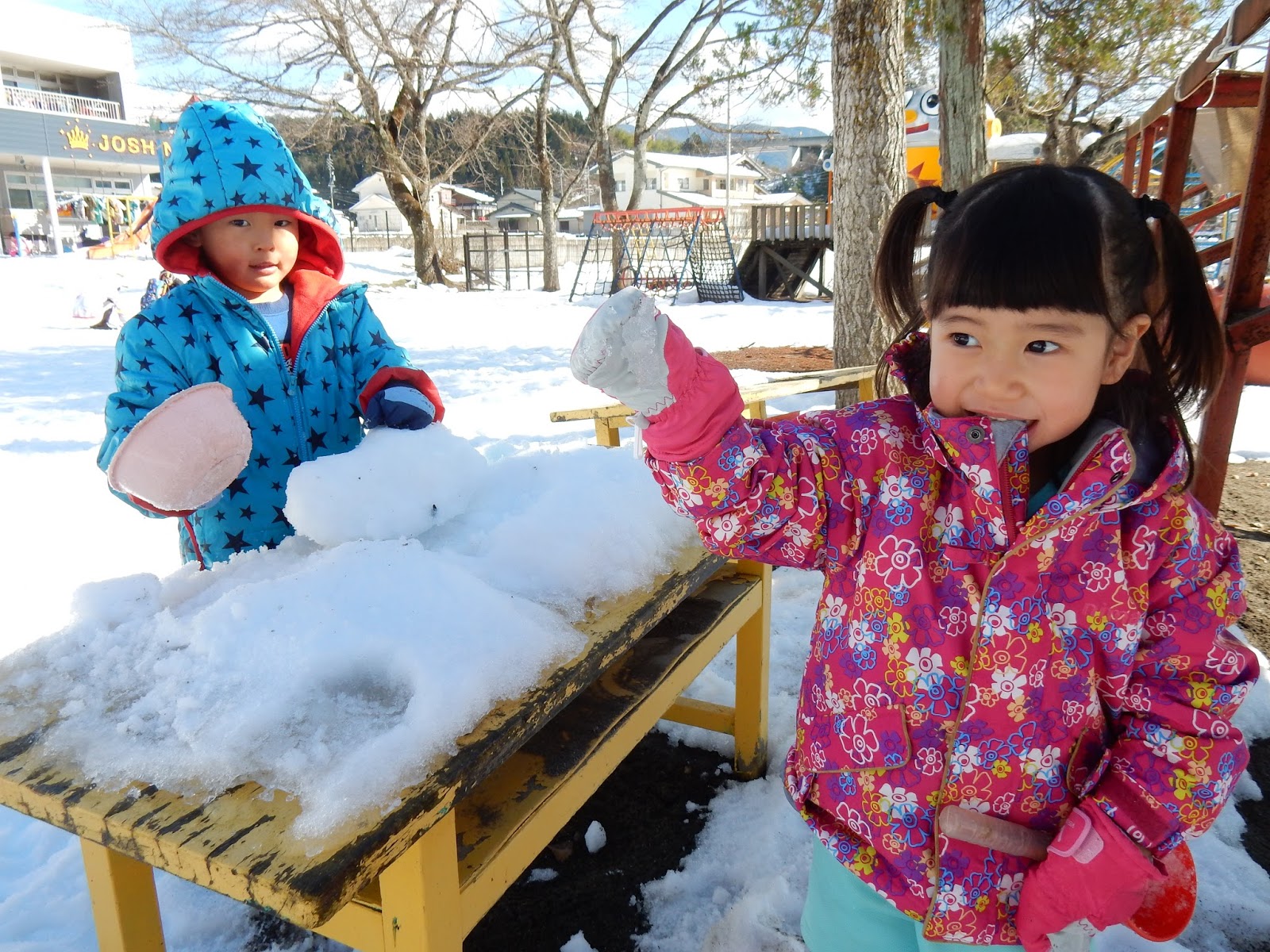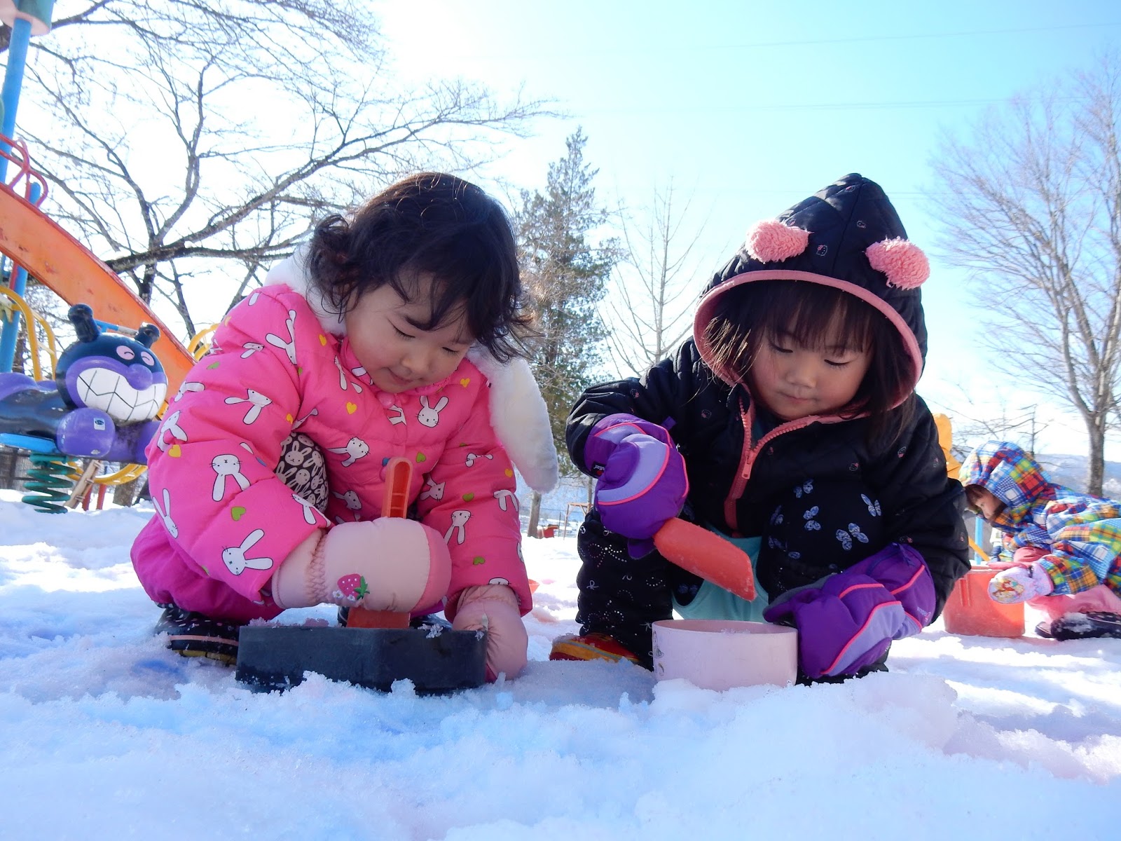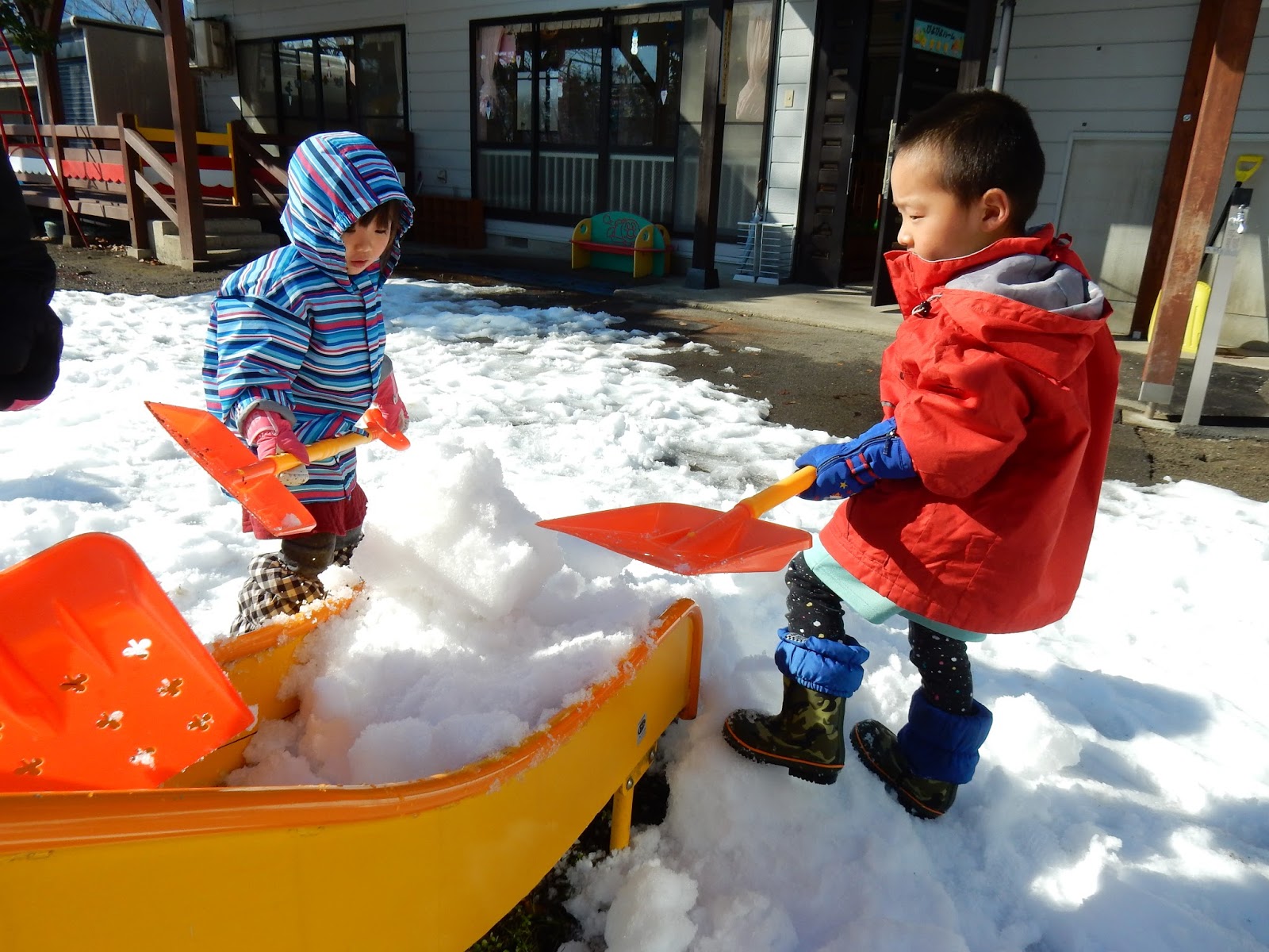 滑り台に積もった雪を一生懸命おろしてくれているみたいです。固まった雪は重たそうですが、スコップを上手に使ってよいしょ!よいしょ!!