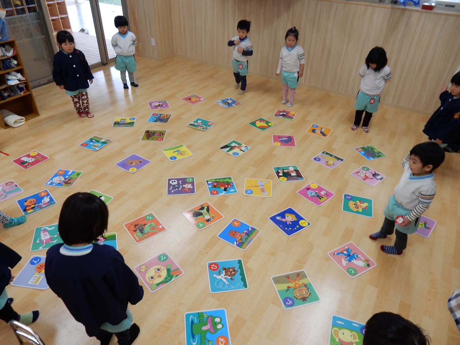 おうちでは、お正月あそびを楽しみましたか??大きなかるたを目の前に、みんな真剣!先生が読む札を聞いて、きょろきょろ…見つけると、とっても嬉しそうに走り寄って行く姿が可愛らしかったです♪