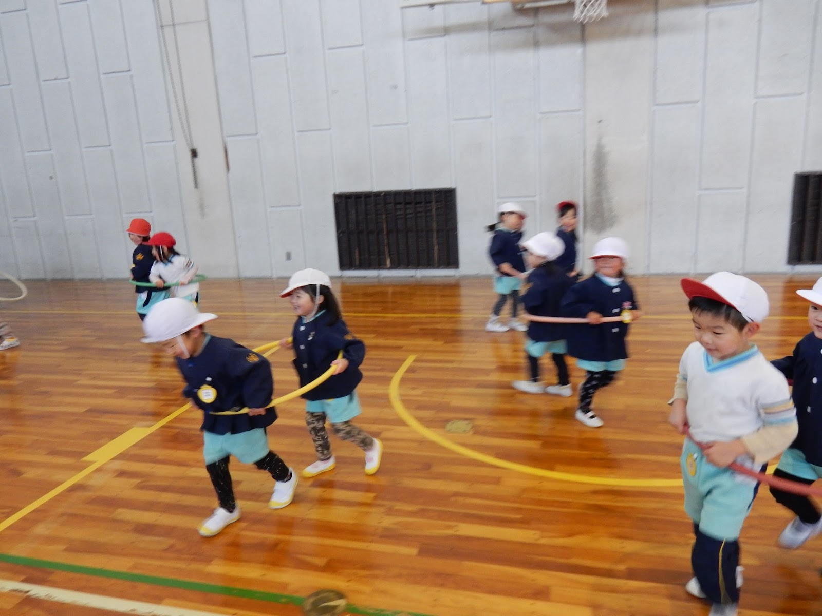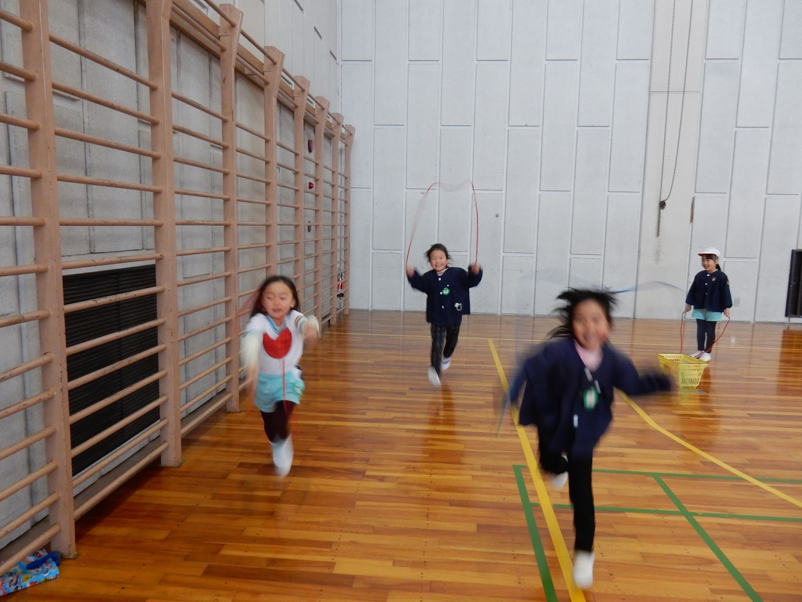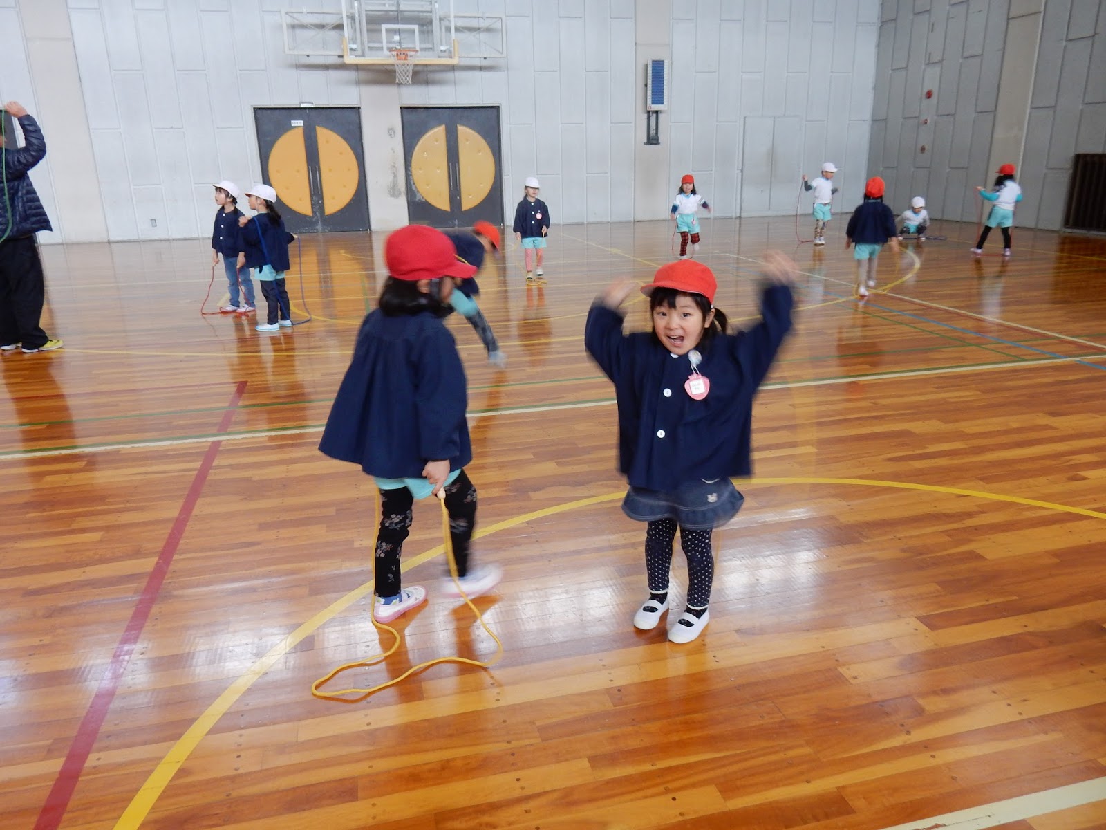 体があったまってきたら、サーキット運動や、縄跳び。こちらもなかなか園庭ではできないので、みんな楽しそうです!動いていると、だんだん熱くなってきました!