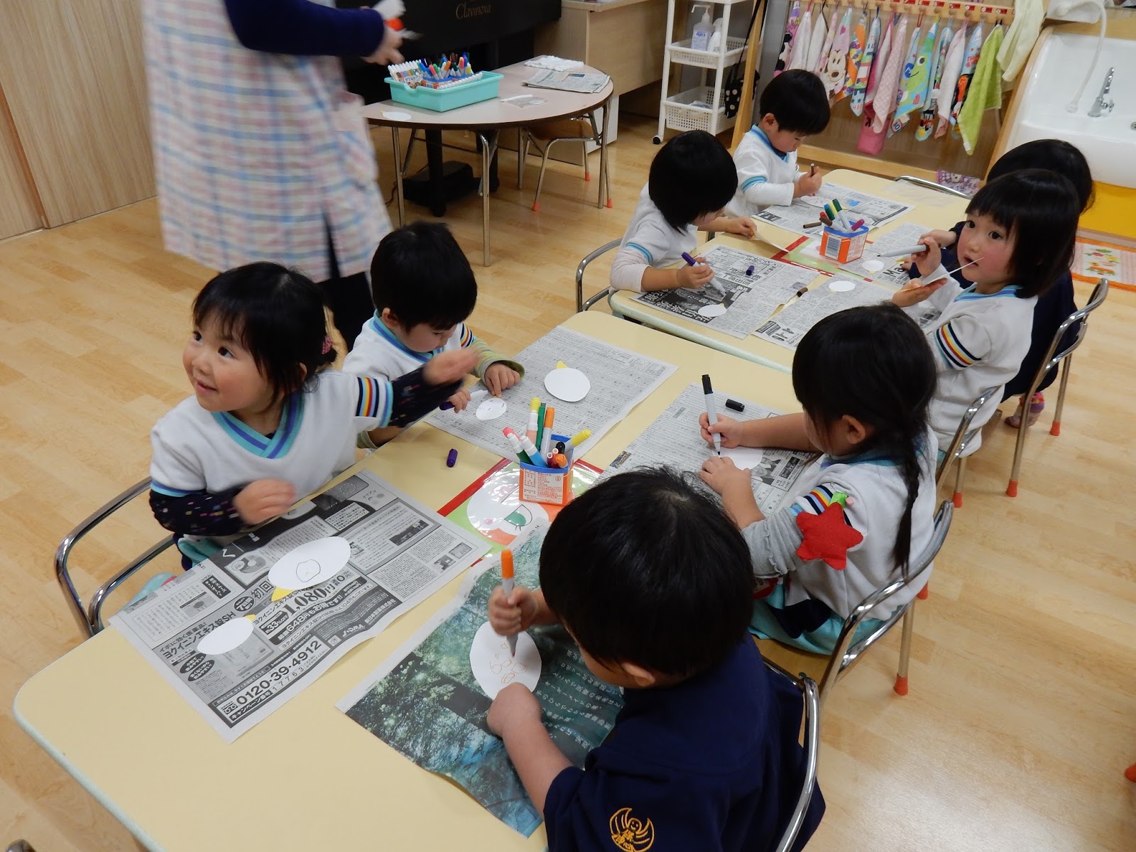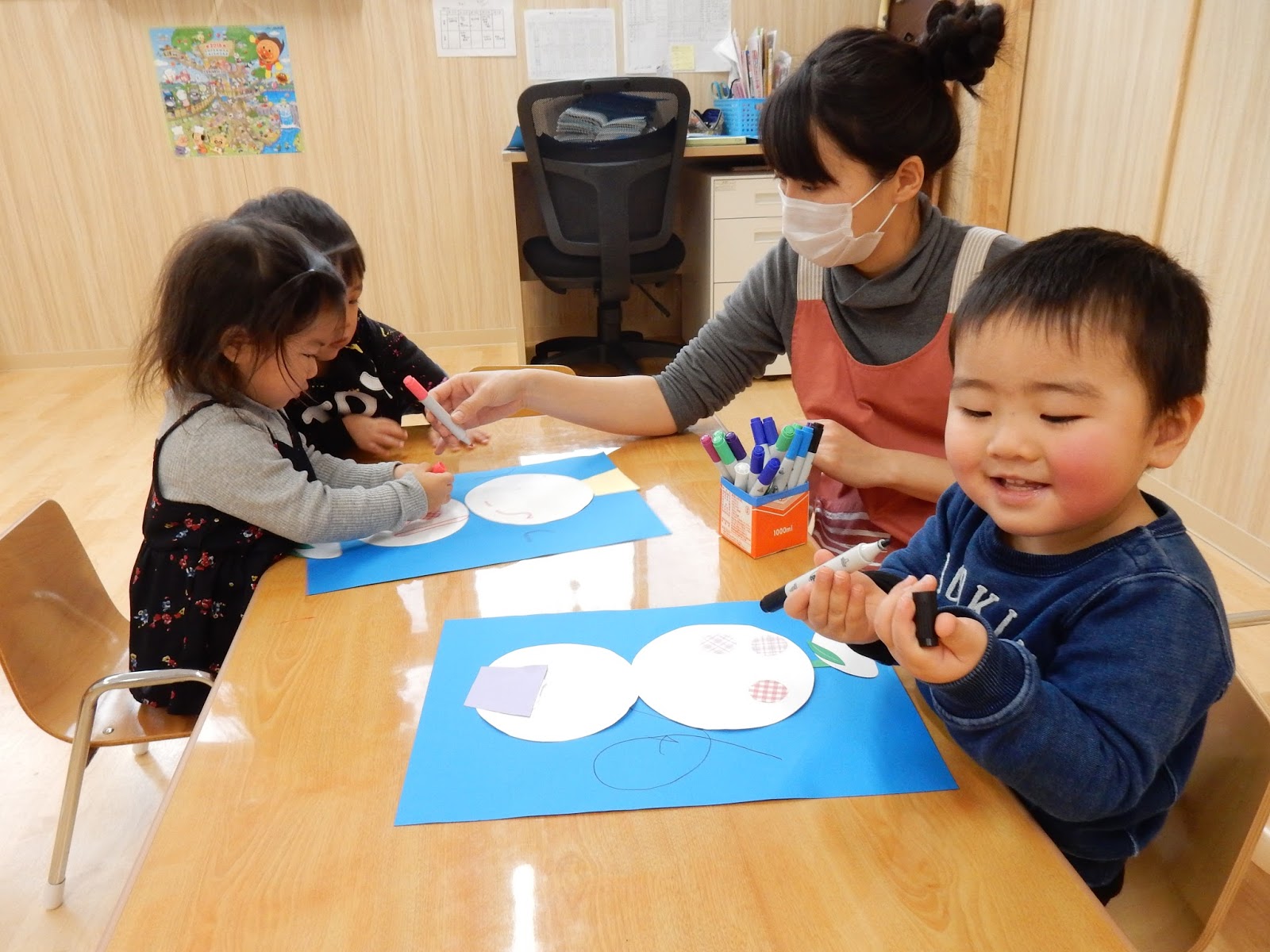 1月も半ばになり、壁面つくりをするクラスがたくさん!各クラス、毎月いろんな工夫がたくさん見られて楽しいですね!ひよこさんは、両面テープを上手にめくって貼りつけたり、マジックで描いたり。0歳児さんは、両面テープの裏紙で楽しそうに遊んでいる姿も(笑)なんでも遊び道具になりますね!すみれさんは、ハクチョウを作ってるんです♪先生の見本をみながら、かわいらしい顔を描いてくれましたよ!