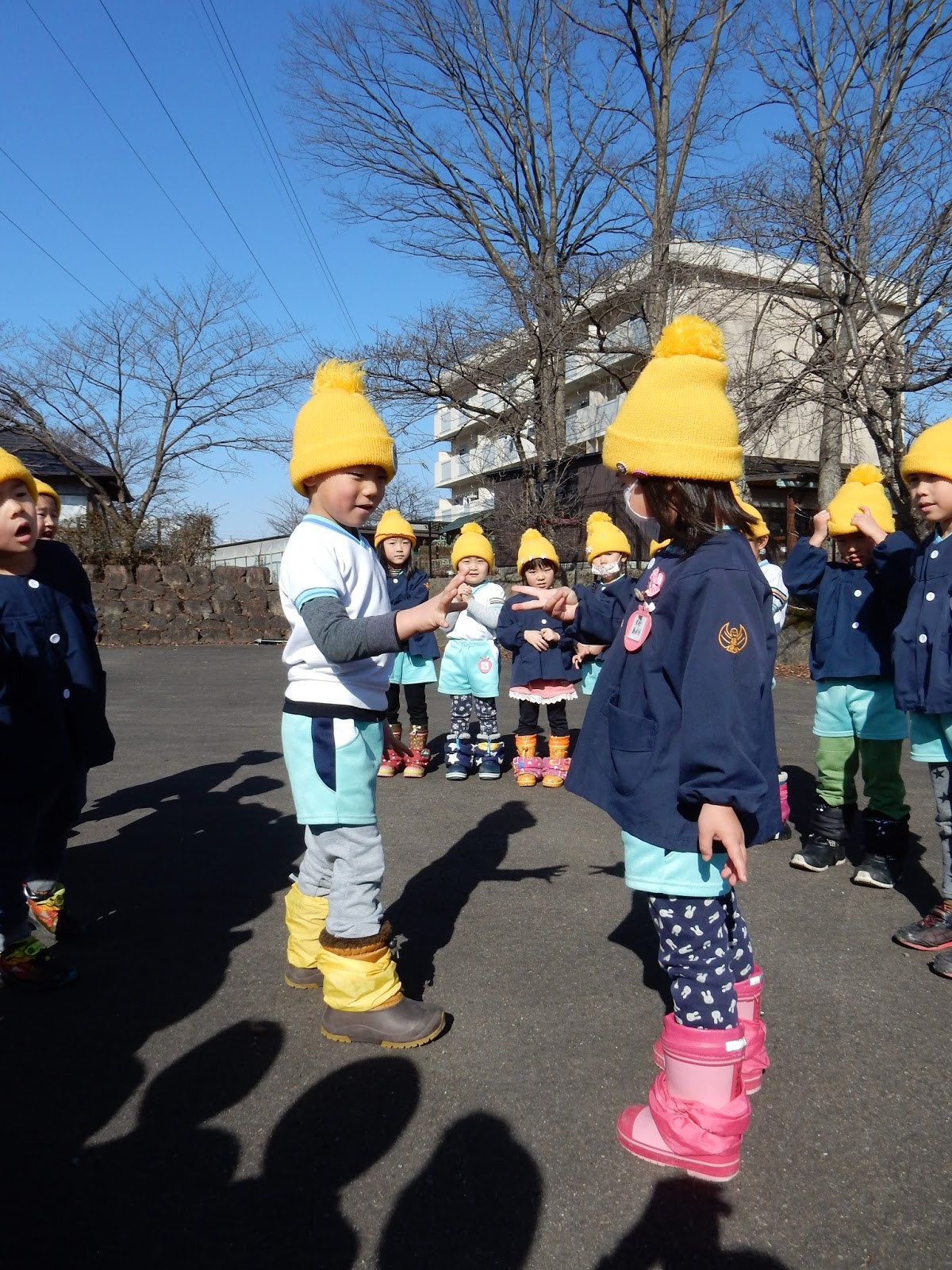 『勝~って嬉しいはないちもんめ!!』 『負け~て悔しいはないちもんめ!!』元気なお歌が聞こえてきましたよ!真ん中でジャンケンする時はみんなで囲んで様子を覗います!勝敗がつくと、『やった~!!!』と大盛り上がり!こんな風に、いい天気が続くといいですね♪