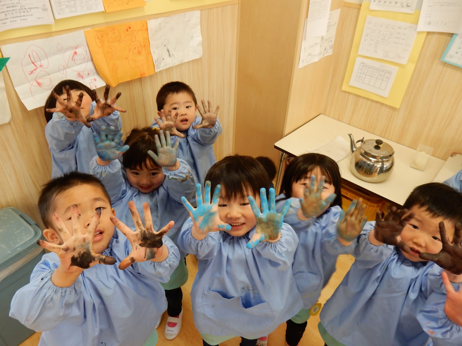 たんぽぽさんのお部屋では、鬼もお面作りが始まりました!絵の具で画用紙に色をつけていきます。赤鬼、青鬼…このほかにも黄色や、緑鬼もいるみたいですよ!つのや、目を作ったりしていたら…こんな手になっちゃった!(笑)
