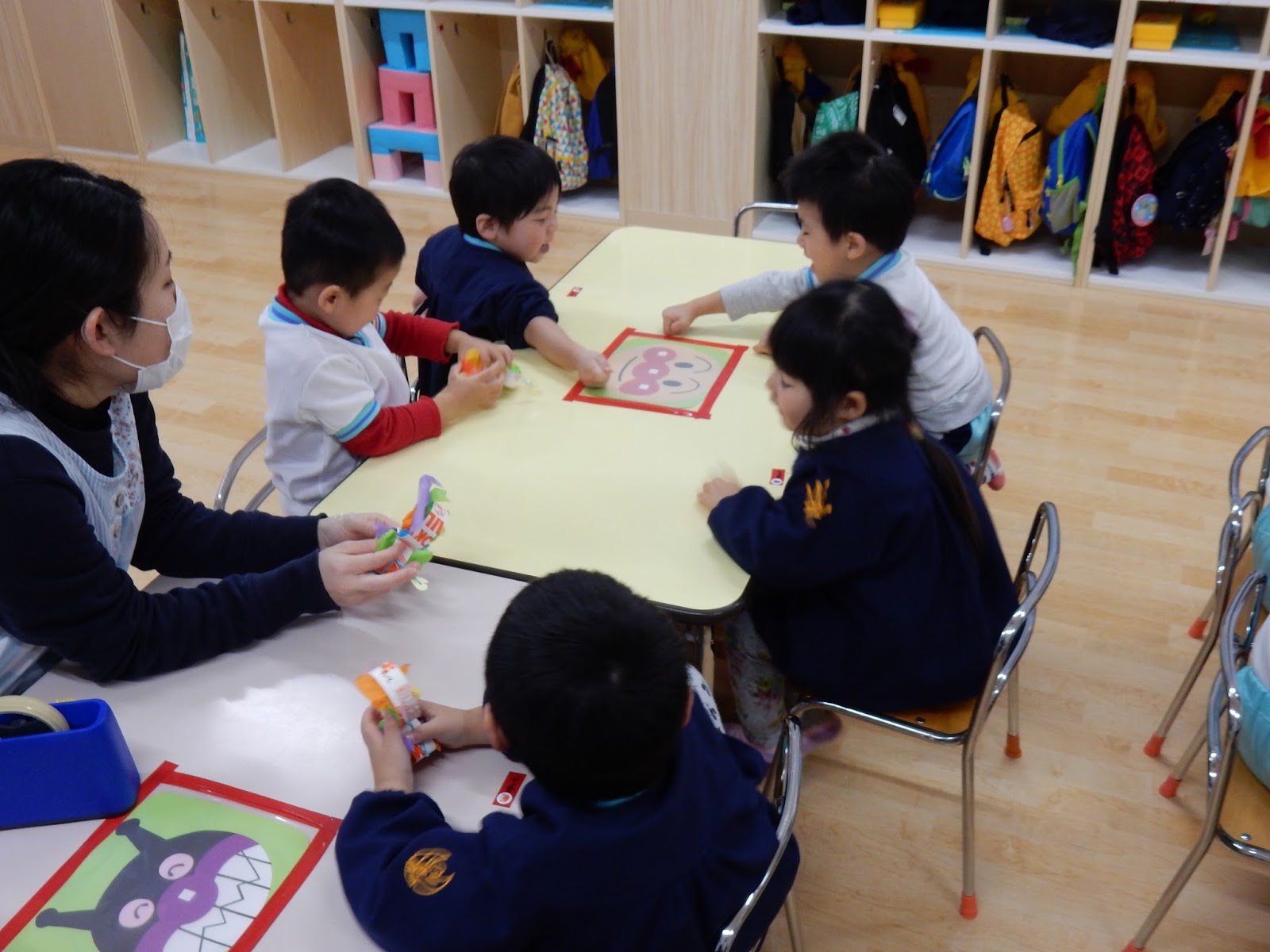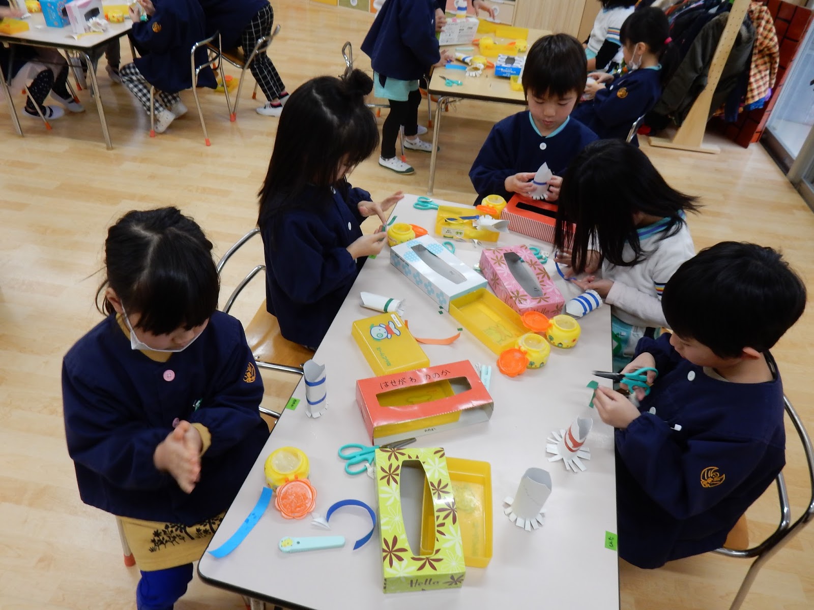 ひまわりさんは、節分にむけて鬼のお面作りを始めました。土台はティッシュの空箱。あとは、いろんな素材を使って自分たちで工夫して作ります。みんなとっても真剣!角の本数や、模様、髪の毛の素材なんかも様々。今までの経験から、素材の特徴もしっかりつかんでいるので、イメージしたものを形にしようとみんな一生懸命考えます。お友達とアイデアを出しながら作るのも、楽しいですよね!