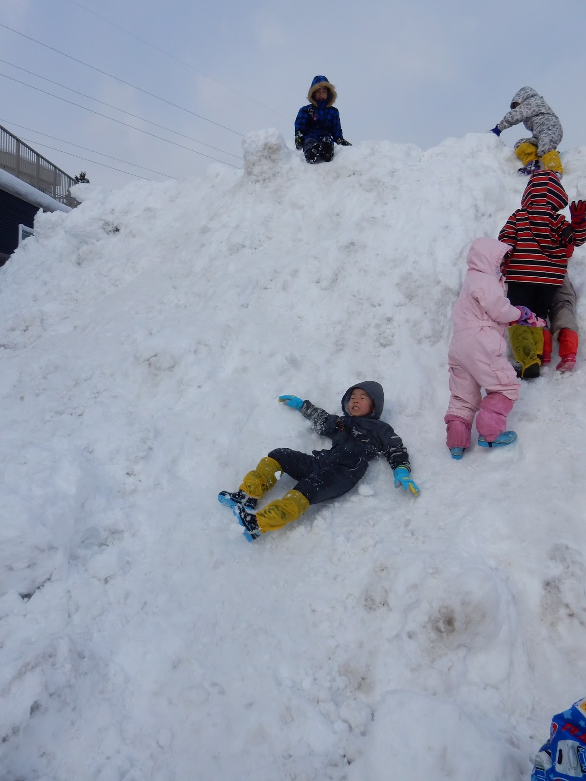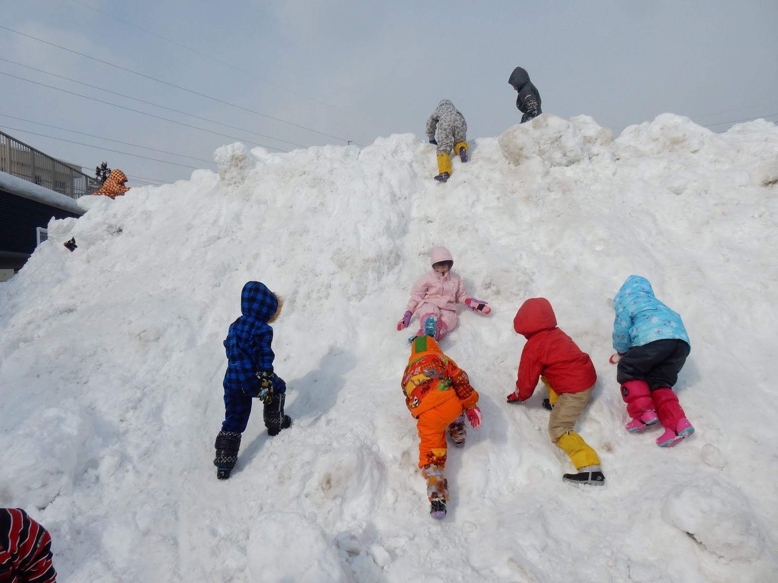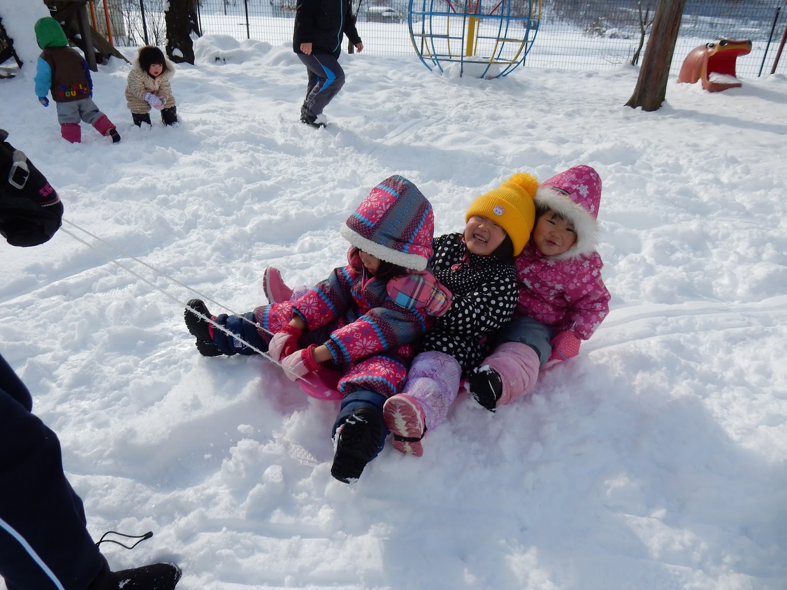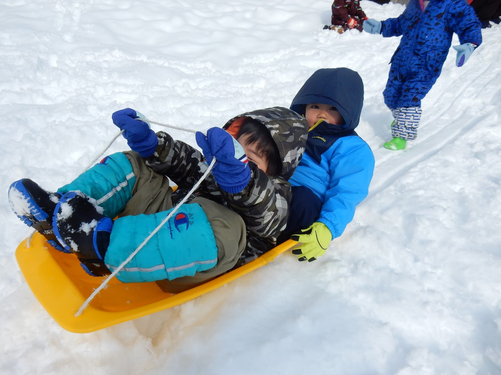 遊びの中で、子ども達は様々な工夫をしています。どうしたら、滑らずに登れるか。どこを滑ればお尻が痛くないか。どうやったら固い雪玉ができるか。大きくなった雪玉を移動させるにはどうしたらいいか…お友達と仲良くそりを使うにはどうしたらいいか…一生懸命考えても、上手くいったり、いかなかったり。そんなことを繰り返しながら、多くの事を学んでいるんでしょうね!たかが遊び、されど遊び!子ども達にとって、遊びは立派な学習です!さぁ、明日も思いっきり遊びましょう!!!