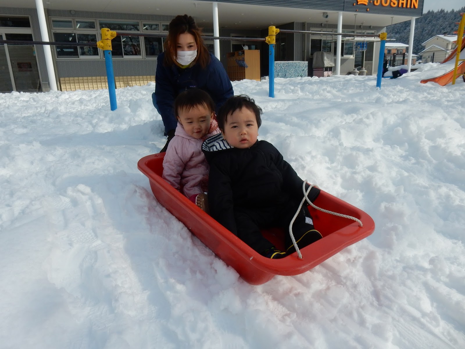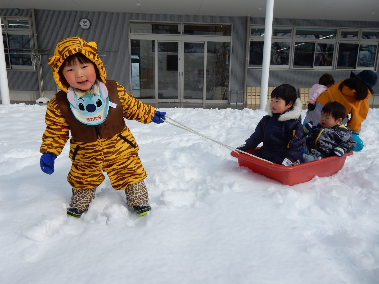 どのクラスにも人気のそり遊び。園にある6つのそりは、いつも大活躍です!少ない数ですが、何人かで一緒にのったり、順番待ちをして貸し借りしたりと、大きなケンカもなく、みんなが楽しんでいます!お友達を乗せて一生懸命引っ張ったり、坂を何度も登ってすべったり。先生と一緒に滑るのも楽しくて大好きです♪