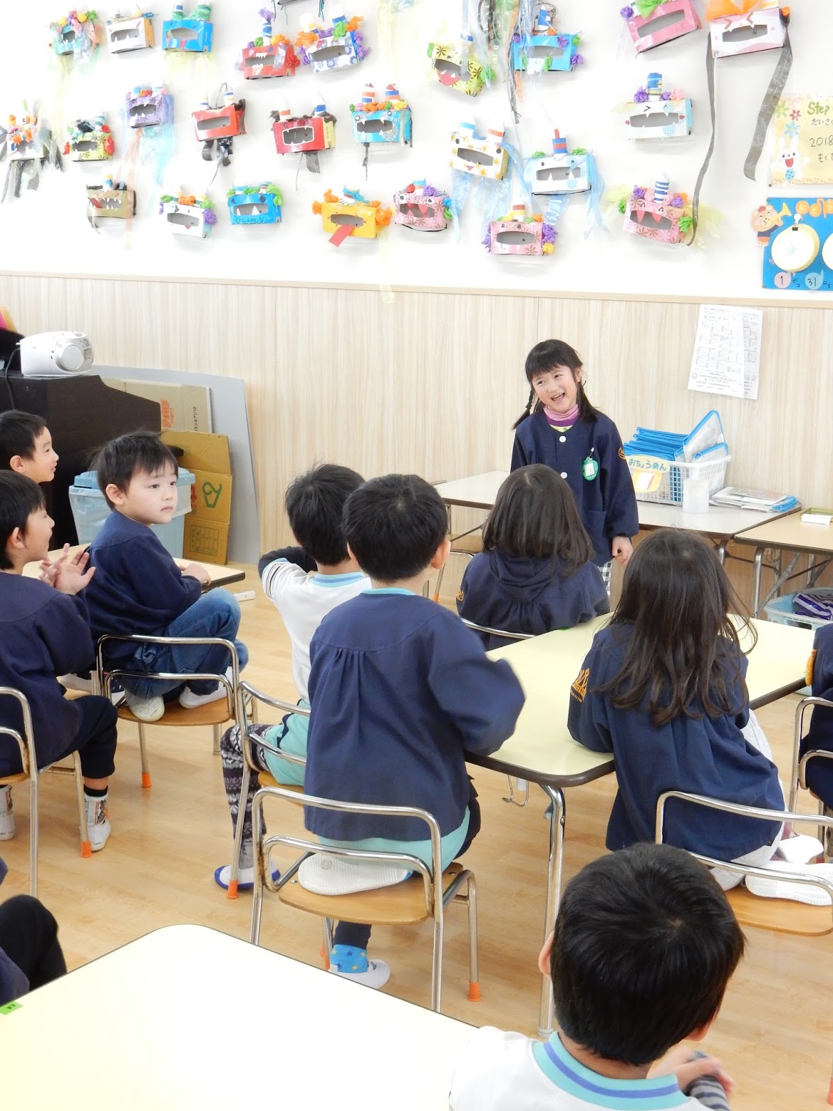 ひまわりさんは、1人ずつみんなの前に立ってお話しています。何かな??と思って聞いてみると、『大きくなったら○○○になりたいです!』と将来の夢を教えてくれました。2月、発表会が終わるとすぐ、ケーブルテレビの撮影が控えています。ご覧になった事のある方も多いと思いますが、年長組さんは、そこで夢をお話しするんです。練習の後、話を聞くと、『お父さんの仕事をお手伝いする!』とか、『今スケボー習ってるから!』とか、みんなしっかりとした理由もあるんです!小さいうちから、やりたいこと、なりたいものが頭に浮かぶって、素敵な事ですね♪