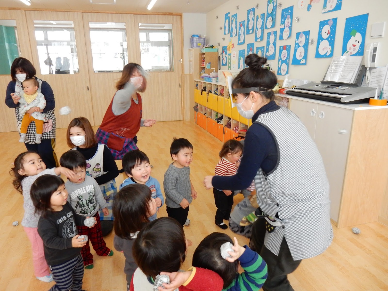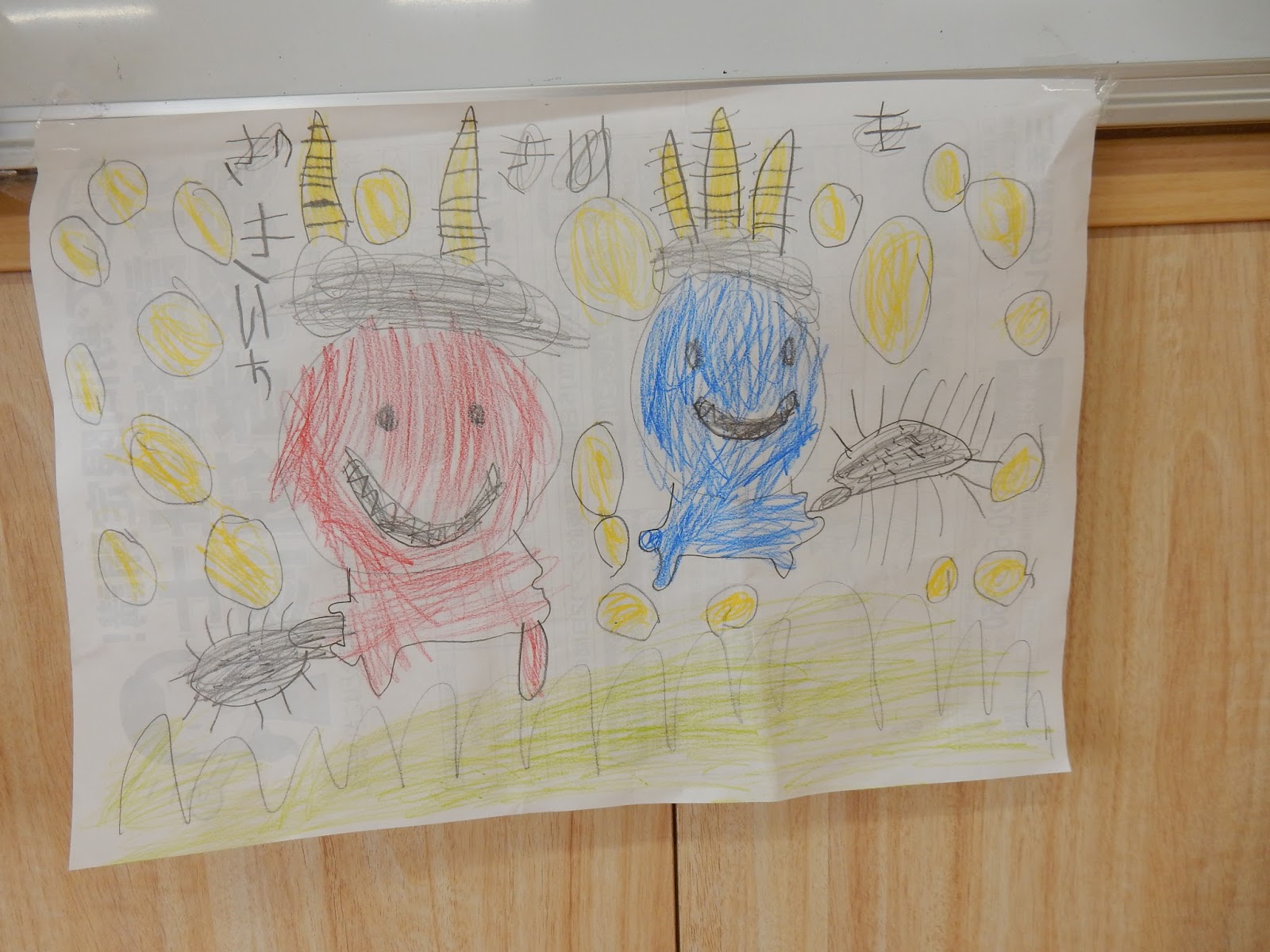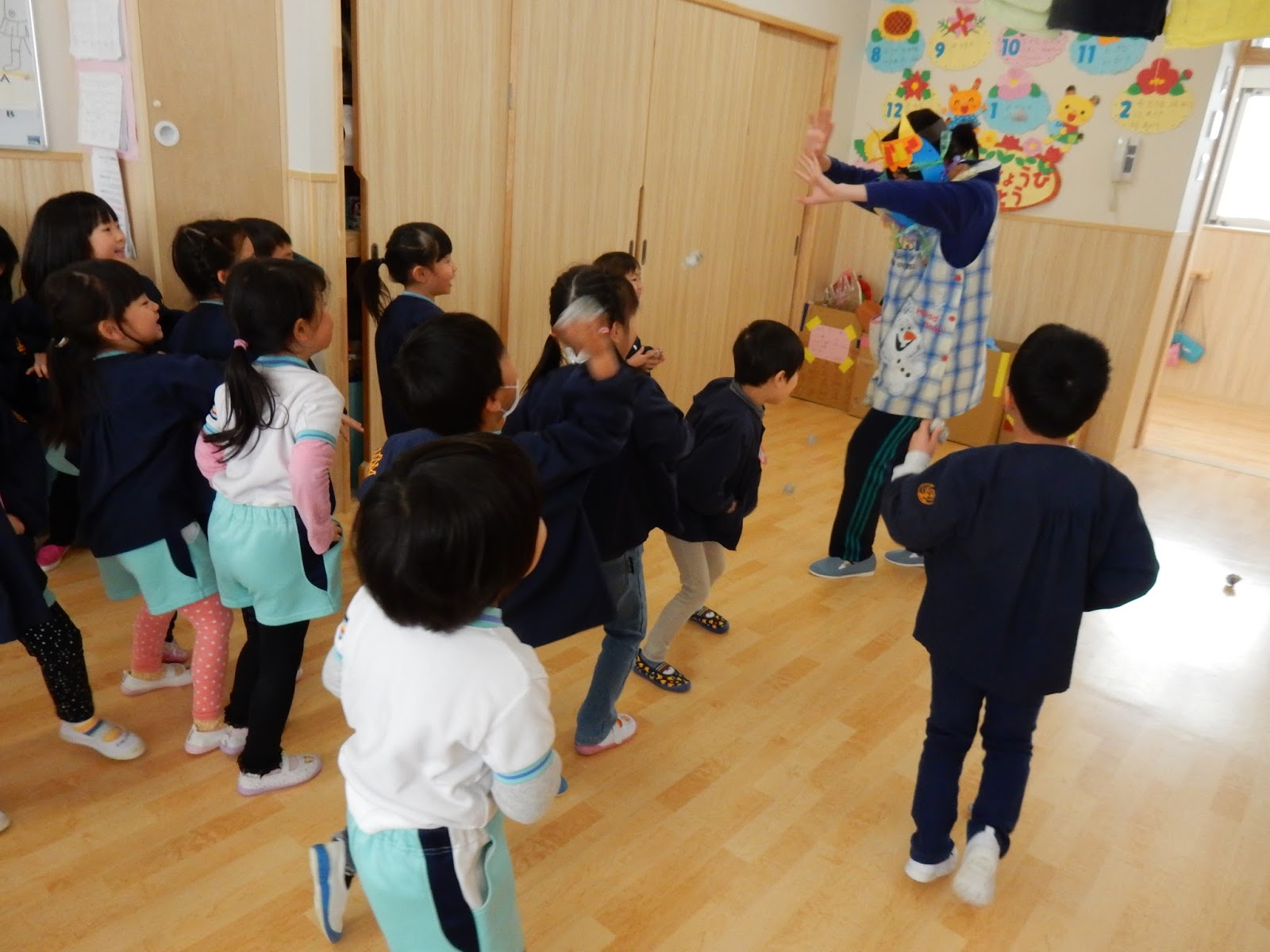 そうなんです…が!今日は、真衣先生が作ったお面で鬼に変身!明日の練習をしましたよ!子ども達、元気に、そして笑顔いっぱいで新聞ボールを投げていました!拾っては投げ、とっても楽しそう!子ども達以上に真剣なみき先生のフォーム…(笑)
