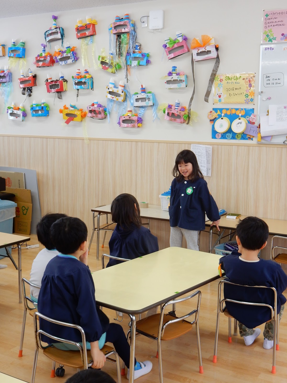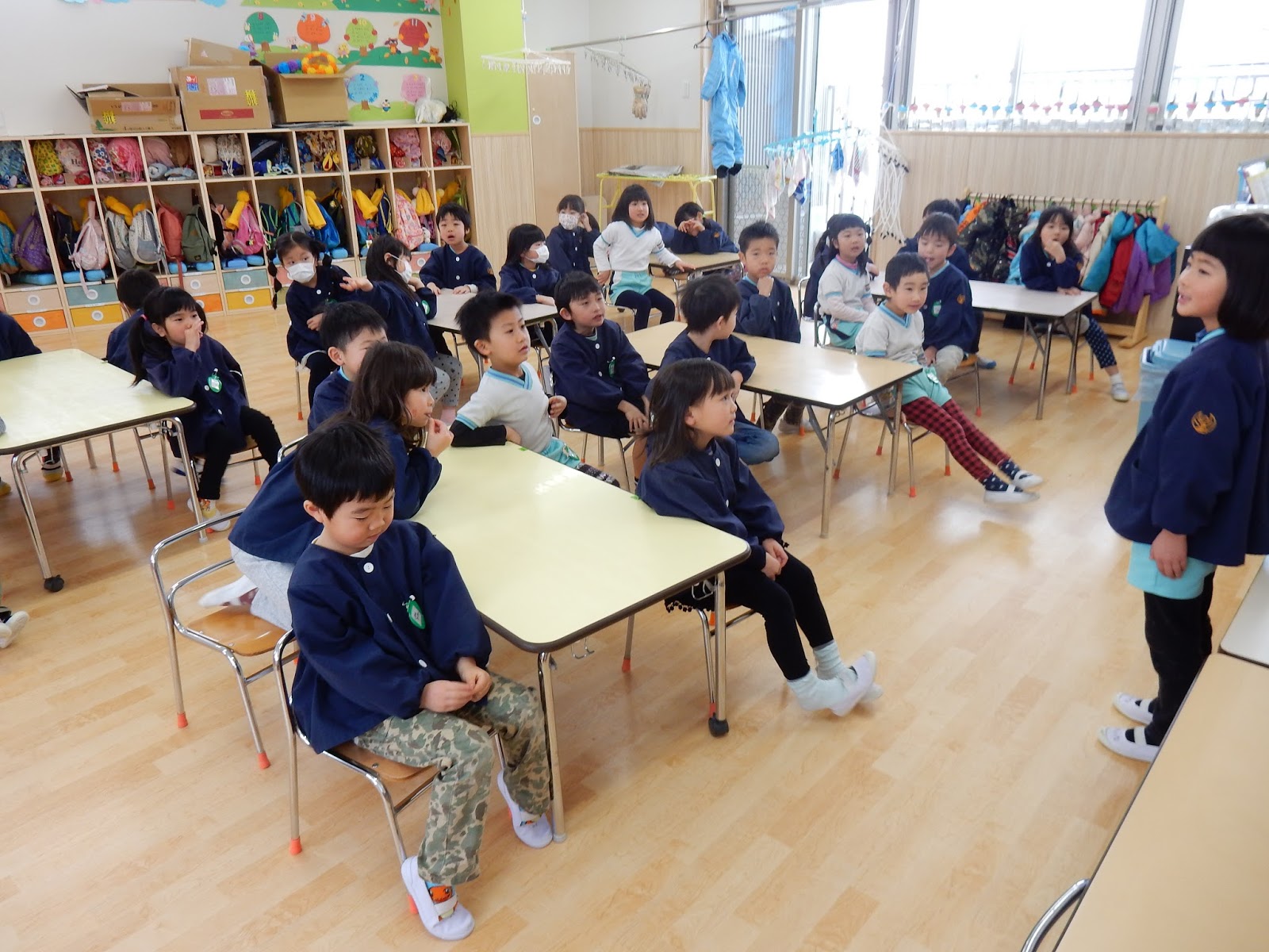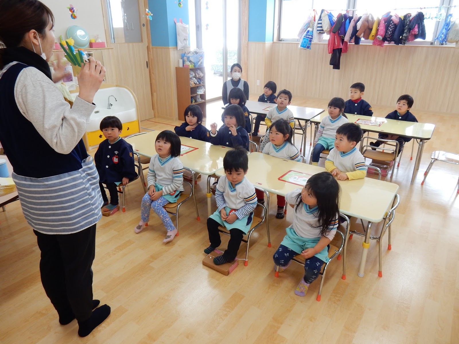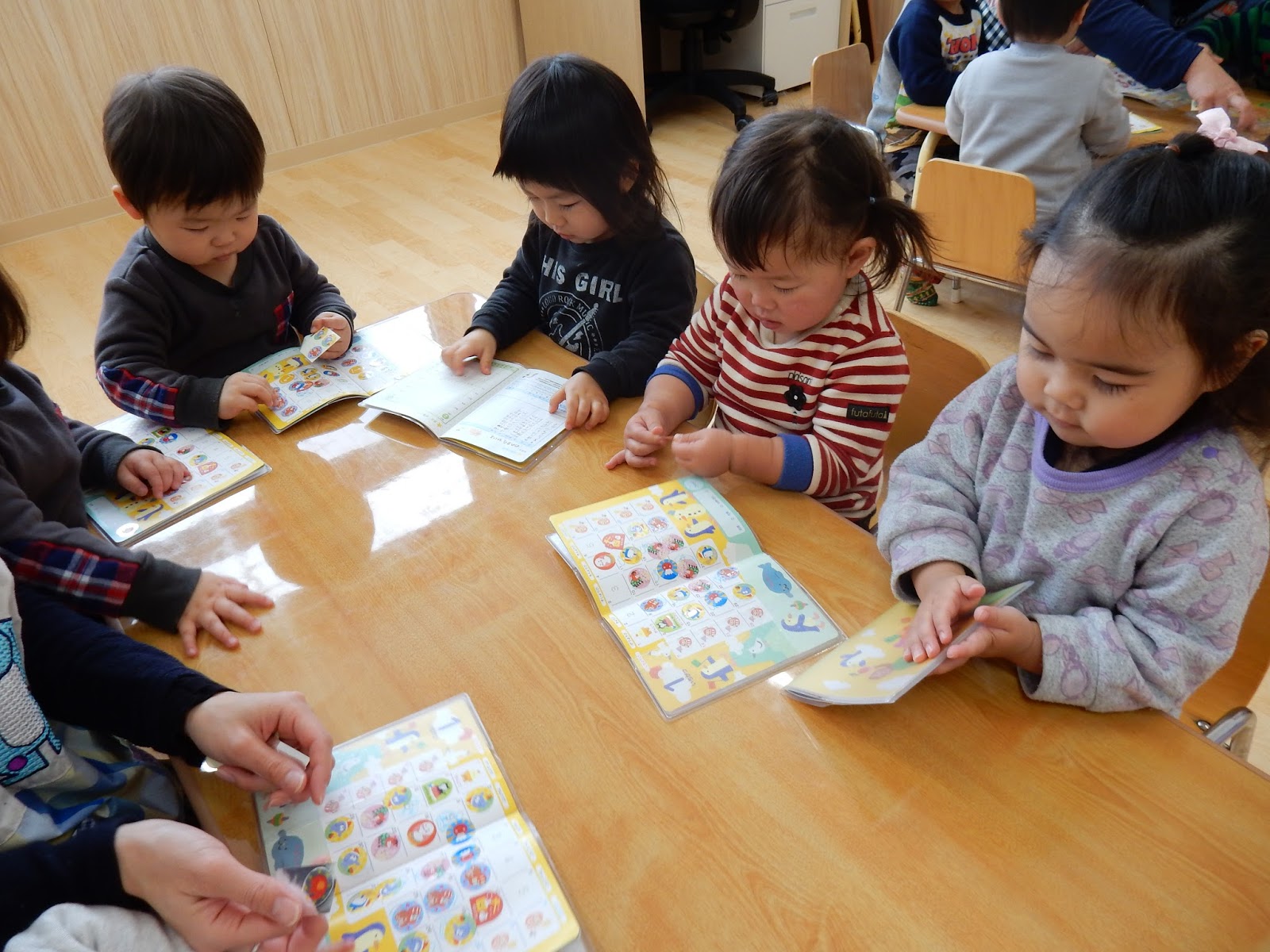 毎月最終日には、お帳面にごほうびシールを貼っています。月に1度のキラキラシール。元気に登園してこれたことを喜び、そしてまた来月も頑張ろう!なぁんて子ども達はそこまで考えてはいないでしょうが、キラキラシールは大喜び♪です。こんな風に、みんなで席について朝の会や帰りの会ができるようになってきたひよこさん。進級に向けての準備も、進んでいます。