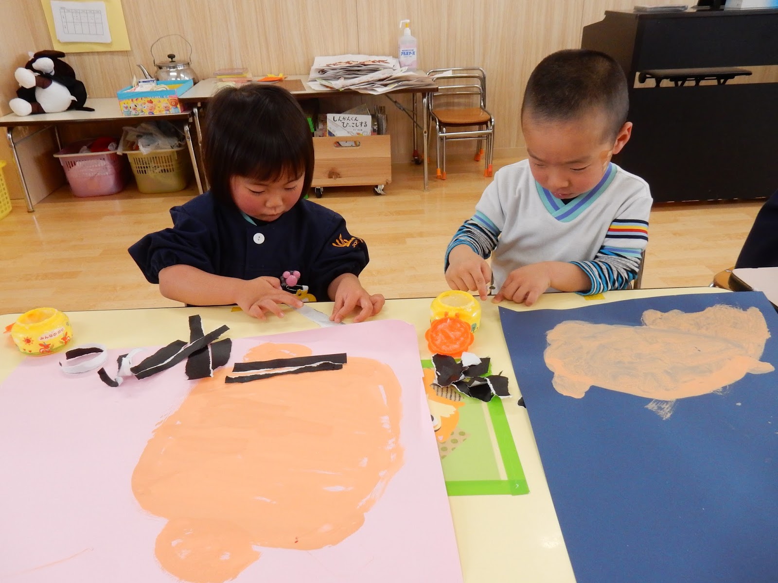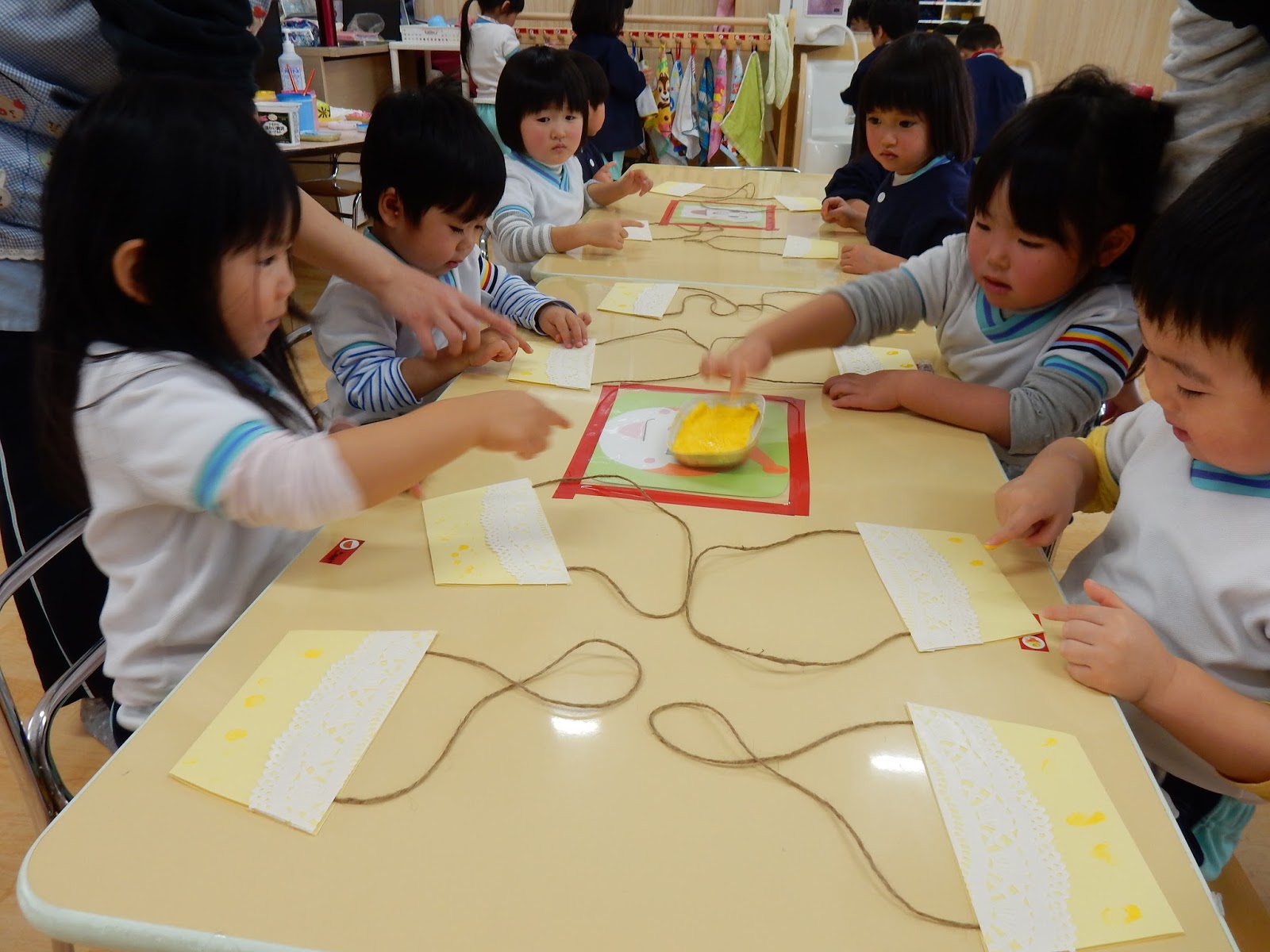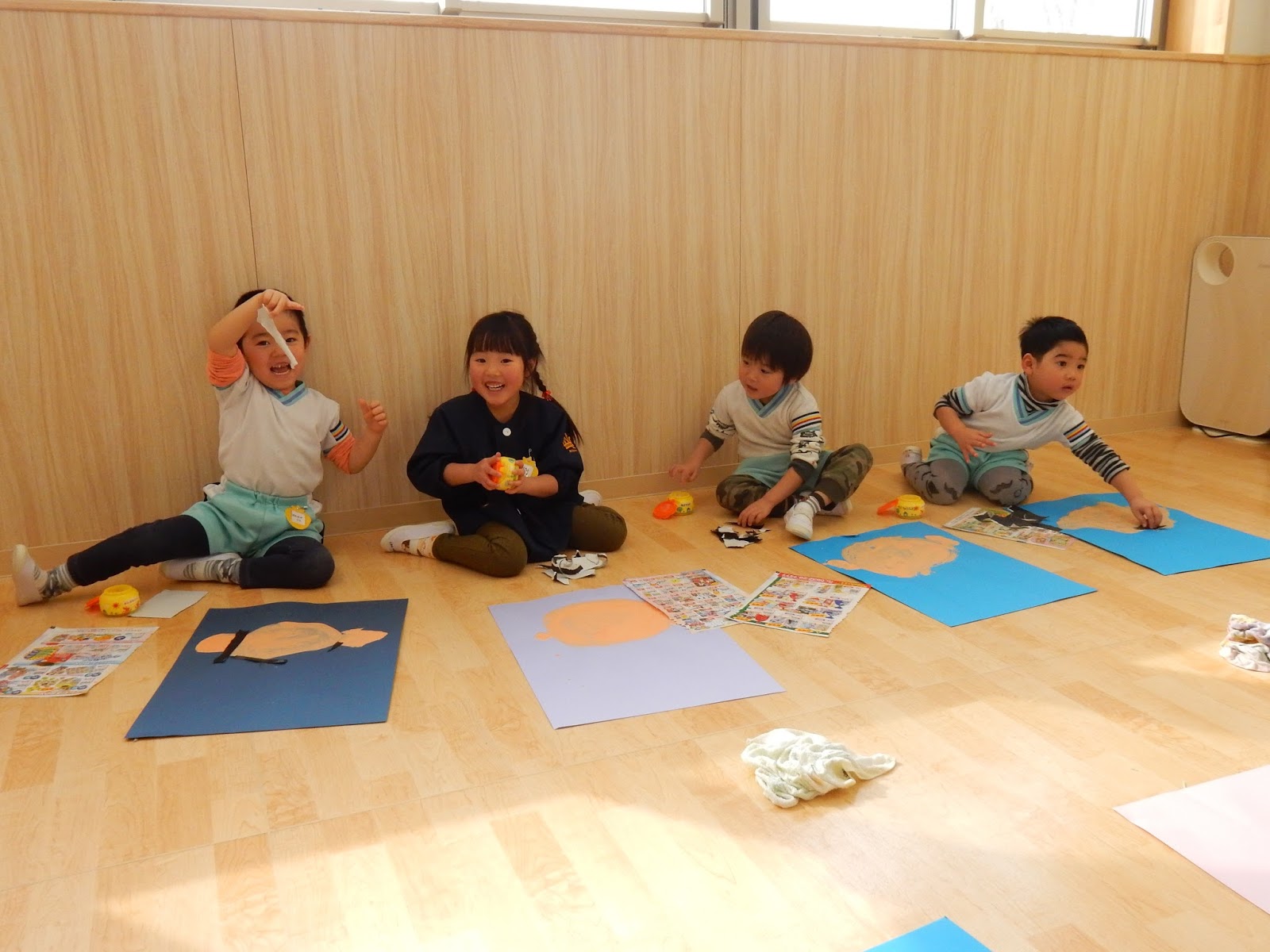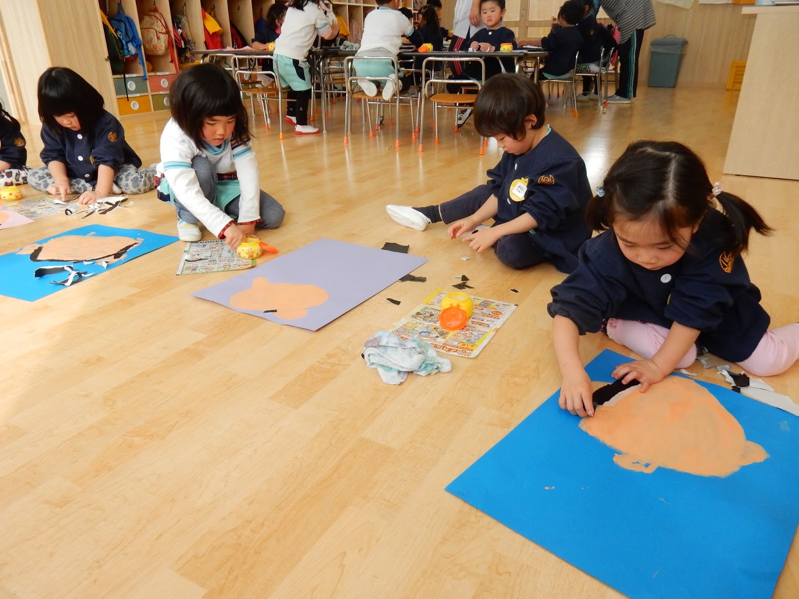 すみれさんと、たんぽぽさんは製作をしていましたよ!すみれさんは、卒園を控えたひまわりさんへのプレゼント作り。人数の多いひまわりさん1人1人に手作りするため、今から少しずつ作っていくんですって!『ひまわりさんへの内緒のプレゼント♡』という先生のお話に、みんなウキウキ♪“内緒”とか、“秘密”とかって、子ども達、好きですよね♪指に絵の具を付けてスタンプをしたんですが、指が違えば模様も様々!(笑)指の腹全体で押す子や、爪の先でつんつんする子。色んな模様が見えて、面白かったですよ!